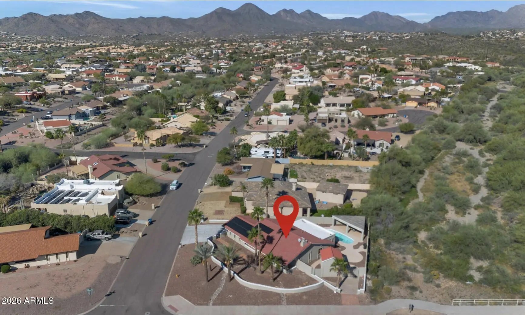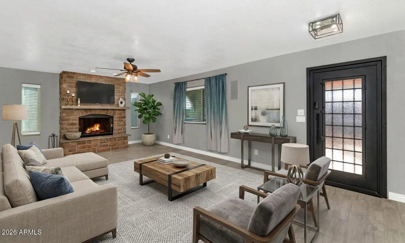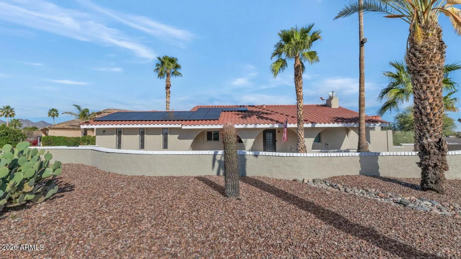 Discover Your Fountain Hills Retreat with No HOA & OWNED SOLAR! Nestled on an elevated corner lot, this beautifully remodeled home captures everything that makes Fountain Hills living so special -- sweeping mountain views, mature desert landscaping, and the kind of indoor-outdoor lifestyle you've been dreaming of. Thoughtfully designed split floor plan offers warm tile flooring, a striking stone fireplace, and custom barn doors that add character throughout. Upgraded kitchen outfitted with custom cabinetry, quartz countertops, stainless steel appliances, a pantry, and a sunny eating area perfect for morning coffee. A separate formal dining room means you're always ready to host. The primary suite has a spa-inspired en-suite with dual sinks and a stunning custom glass shower. Flexible bonus rooms offer space for guests, a mother-in-law suite, or a teen hangout, whatever your life calls for. Step through the French doors and into your private backyard oasis. Whether you're entertaining under the stars or unwinding after a hike, the outdoor family room delivers -- complete with a stone fireplace, heated pool, spa, and storage shed.