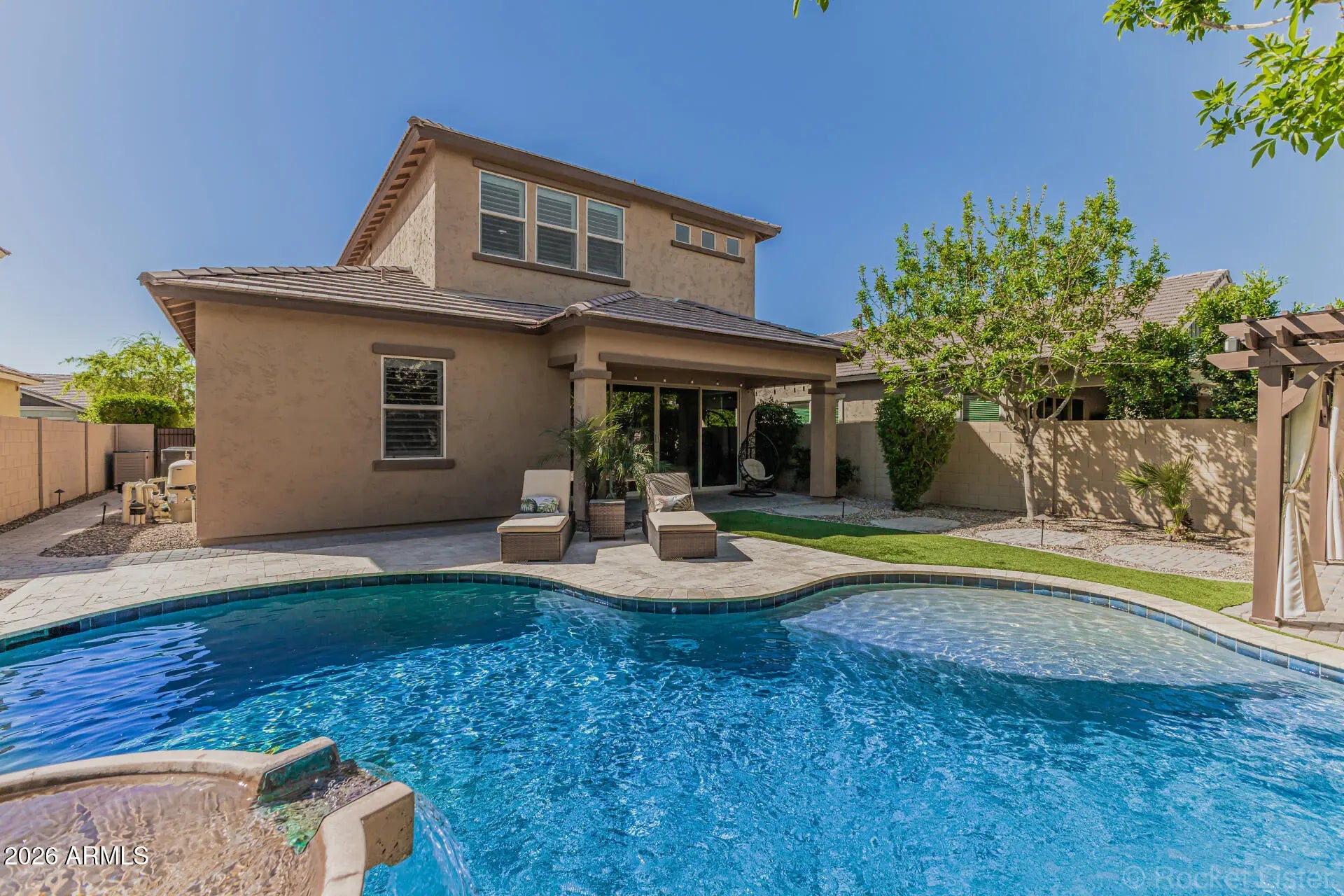Seize the opportunity to own this stunning two-story home with a sparkling pool! This gem welcomes you with a beautifully manicured landscape, a stone-accented facade, and a 3-car garage with epoxy flooring. Inside, you'll find a perfect blend of style and comfort, featuring tile flooring, charming tray ceilings, plantation shutters, a fireplace to keep you warm, and a soothing palette that creates a comfortable and warm ambiance. The chef's kitchen is equipped with custom cabinetry, beautiful quartz countertops with a matching backsplash, stainless steel appliances, and an island with a breakfast bar, perfect for entertaining and casual meals. The primary suite hosts a practical walk-in closet and a bathroom with double sinks for added convenience. The den and loft add flexibility, working perfectly as an exercise area or a quiet retreat. Your oasis awaits in the backyard, featuring a covered patio perfect for enjoying a refreshing drink and unwinding, elegant travertine pavers, a lovely seating space with a pergola, and a blue pool with a gorgeous water feature. An entertainer's dream! You don't want to miss it!