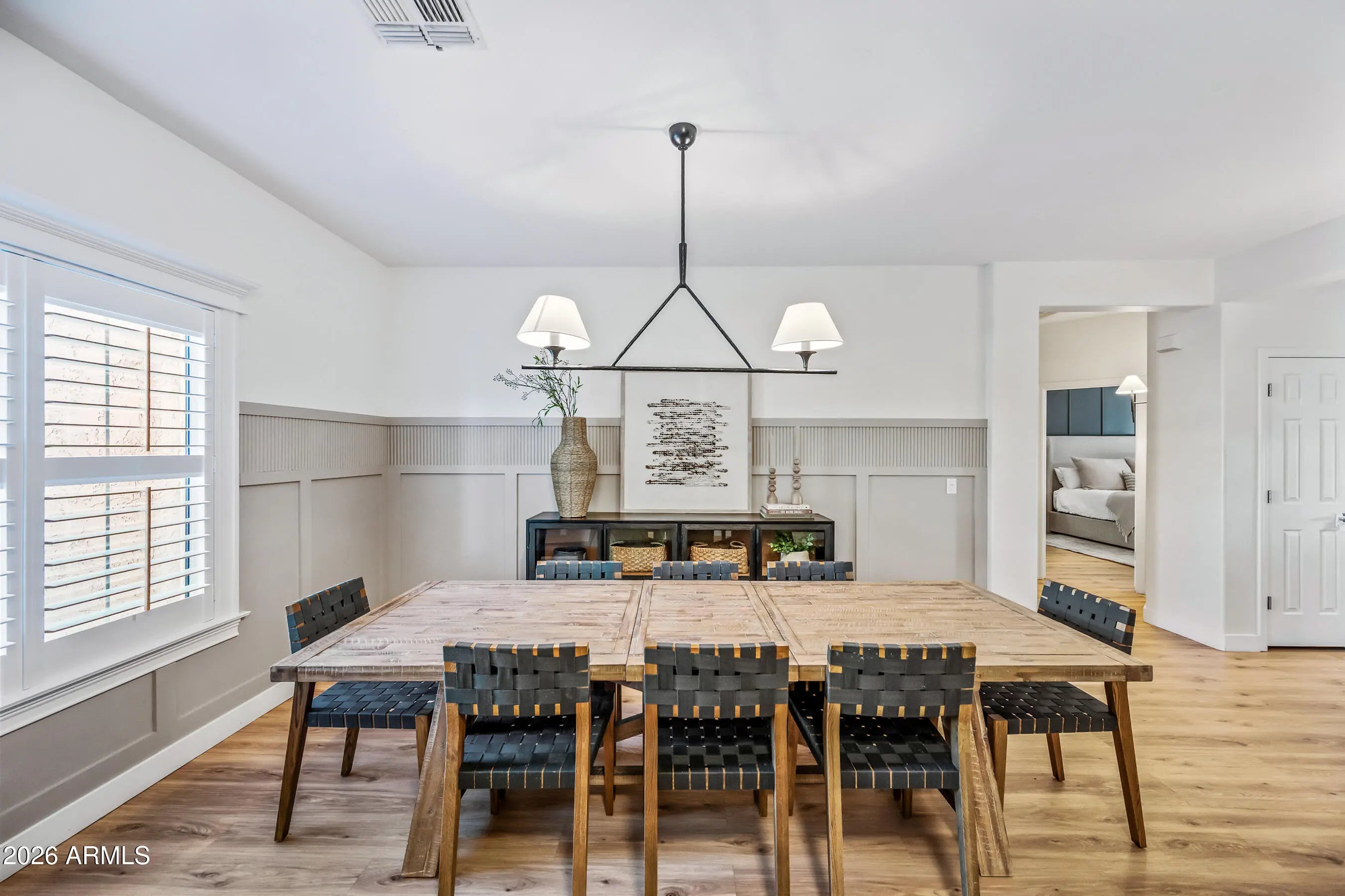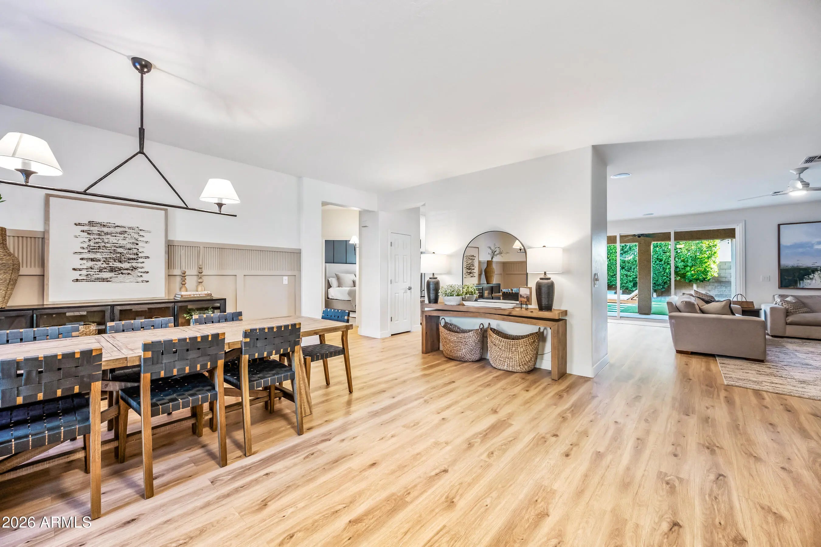 Look no further--your dream home is here! This stunning modern residence offers 2,944 sq ft, 4 bedrooms + den + bonus room, 3 baths, a 3-car garage, and a sparkling pool, with paid off solar, ideally located in Chandler Heights. The exterior was recently painted, enhancing the home's beautiful curb appeal. Step inside to the inviting and flexible front living space showcasing elegant wainscoting, luxury vinyl plank flooring throughout the main living areas, and new white shutters throughout. A dedicated den/office features striking glass double doors with black trim and a classic built-in desk with storage, perfect for working from home. The heart of the home shines with an open great room and designer kitchen complete with quartz countertops, new white shaker cabinetry to the ceiling with black hardware, a custom wood hood vent, stainless steel appliances, a 5-burner gas range, and an oversized island with breakfast bar. Modern wicker pendant lighting, recessed lighting, a tasteful tile backsplash, and a large wall slider bring in abundant natural light and create seamless indoor/outdoor living. The primary suite is a true retreat with a bold accent wall and spa-like bath featuring a freestanding soaking tub, tiled walk-in shower with glass enclosure, walnut double-sink vanity, quartz counters, custom framed mirrors, and a spacious walk-in closet with built-in cabinetry. On the opposite wing of the home you'll find three additional bedrooms, a flex/teen room, and two beautifully updated bathrooms, giving everyone room to spread out. Enjoy Arizona living in your private backyard oasis featuring a large covered patio, tile pavers, synthetic grass, lava rock landscaping, mature ficus trees, a lemon tree, a cozy side-yard sitting nook, and a gorgeous pool with fountain feature and baja step perfect for lounging and entertaining! The home also includes owned solar, helping provide energy efficiency and potential savings on utility costs. Located close to shopping, dining, and entertainment.