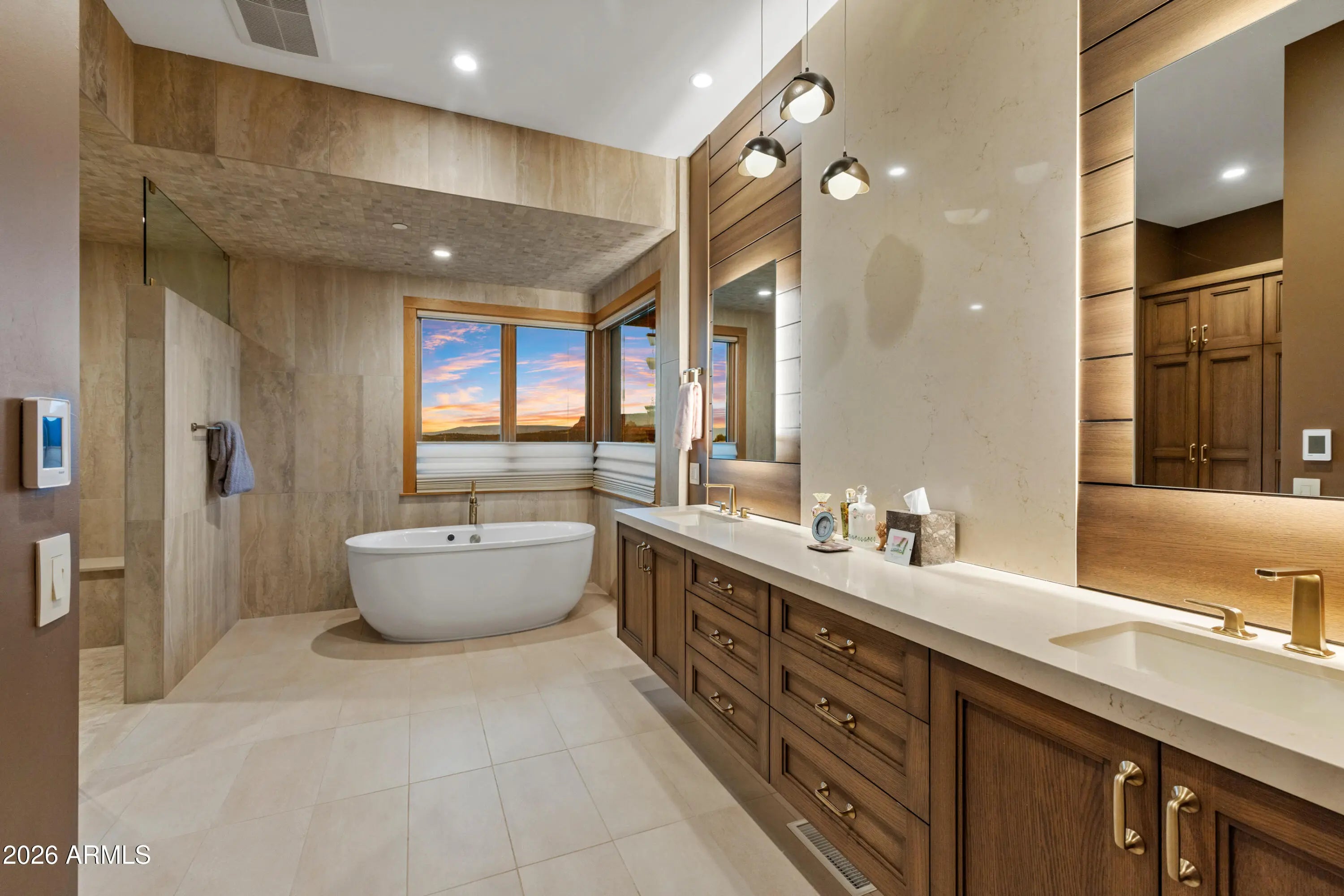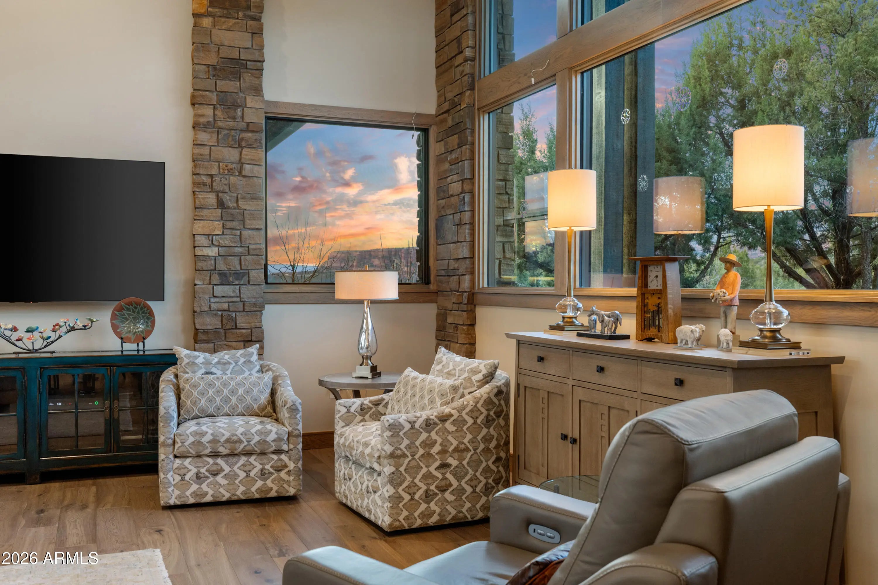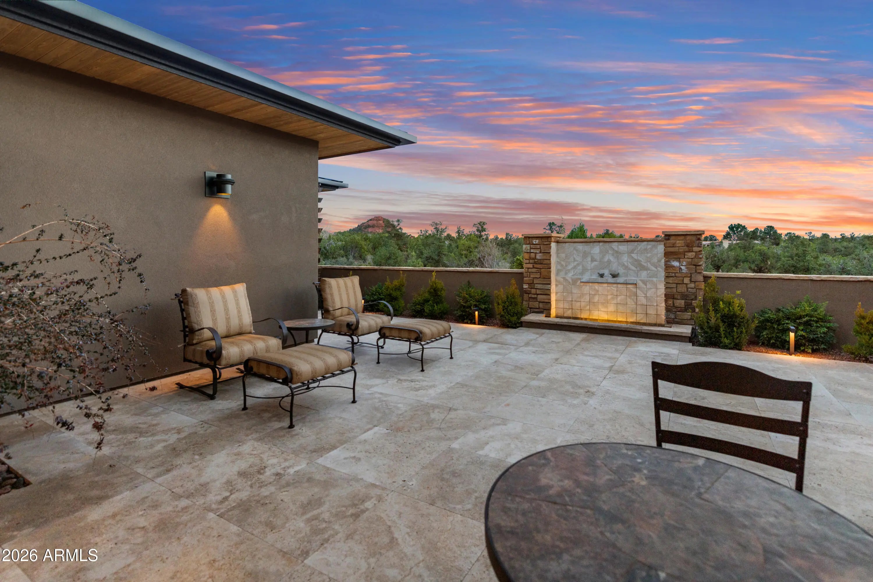 Tucked within the prestigious gated North Slopes community, this exceptional modern mission-style residence sits on more than two acres of natural forest, offering an extraordinary blend of privacy, views, and refined design. Completed in 2023, this single-level luxury home showcases thoughtful construction, high-end finishes, and extensive landscaping that together represent a tremendous investment of vision, craftsmanship, and detail. From the moment you step through the grand entry, the home immediately reveals its sense of space and light. Expansive windows frame sweeping views while clerestory windows fill the interior with beautiful north-facing natural light. The great room welcomes you with warmth and sophistication, centered around a hand-cut cream travertine and natural stone fireplace, with large sliding glass doors that seamlessly connect indoor living with the serene front courtyard or the immaculate backyard designed for entertaining and relaxation. The open layout flows effortlessly into the heart of the home -- a stunning kitchen featuring Taj Mahal quartz countertops and backsplash, a large island ideal for gathering, and a generous walk-in pantry. Home is also fitted with Hunter Douglas shades throughout that are all controlled via digital remote for clean and easy use. The design balances elegance and functionality, making everyday living as enjoyable as hosting guests. The home's split floor plan creates both privacy and versatility. A dedicated office offers a quiet and inspiring environment for work, study, or creative pursuits. The primary suite feels like a private retreat of its own, with ample living space, corner windows capturing canyon views, and a spa-inspired bathroom designed for comfort and relaxation. A custom walk-in closet completes this luxurious sanctuary. The guest wing is thoughtfully designed to provide comfort and independence for visiting family and friends. Two spacious bedrooms share a well-appointed bathroom and are complemented by a convenient coffee bar with sink and refrigerator, creating a welcoming suite that guests will truly appreciate. Adding even more flexibility, an additional oversized bedroom is currently configured as an office or fitness space. This bright and airy room enjoys incredible views, abundant natural light, private patio access, and its own full bathroom, making it perfect for a variety of uses. As if the main residence weren't impressive enough, the property also features a private lower-level apartment with its own entrance. Complete with a full kitchen, bathroom, and laundry, this space offers endless possibilities for extended family, guests, or a private retreat. Outdoor living is equally remarkable. The front courtyard is beautifully finished with travertine tile and a tranquil fountain, offering views toward Jerome Mountain, while the fully enclosed backyard provides a peaceful setting surrounded by nature. Mature landscaping and careful design create outdoor spaces that feel both luxurious and serene. (Don't forget to ask for the photo album of the backyard in full bloom!) Altogether, the home offers five potential bedrooms and four bathrooms, including the private apartment and flexible living spaces. Nearly new construction, single-level living, panoramic views, and extensive completed landscaping make this property a rare opportunity in one of Sedona's most sought-after communities. This is more than a home--it is a thoughtfully crafted retreat where privacy, beauty, and modern luxury come together in perfect harmony.