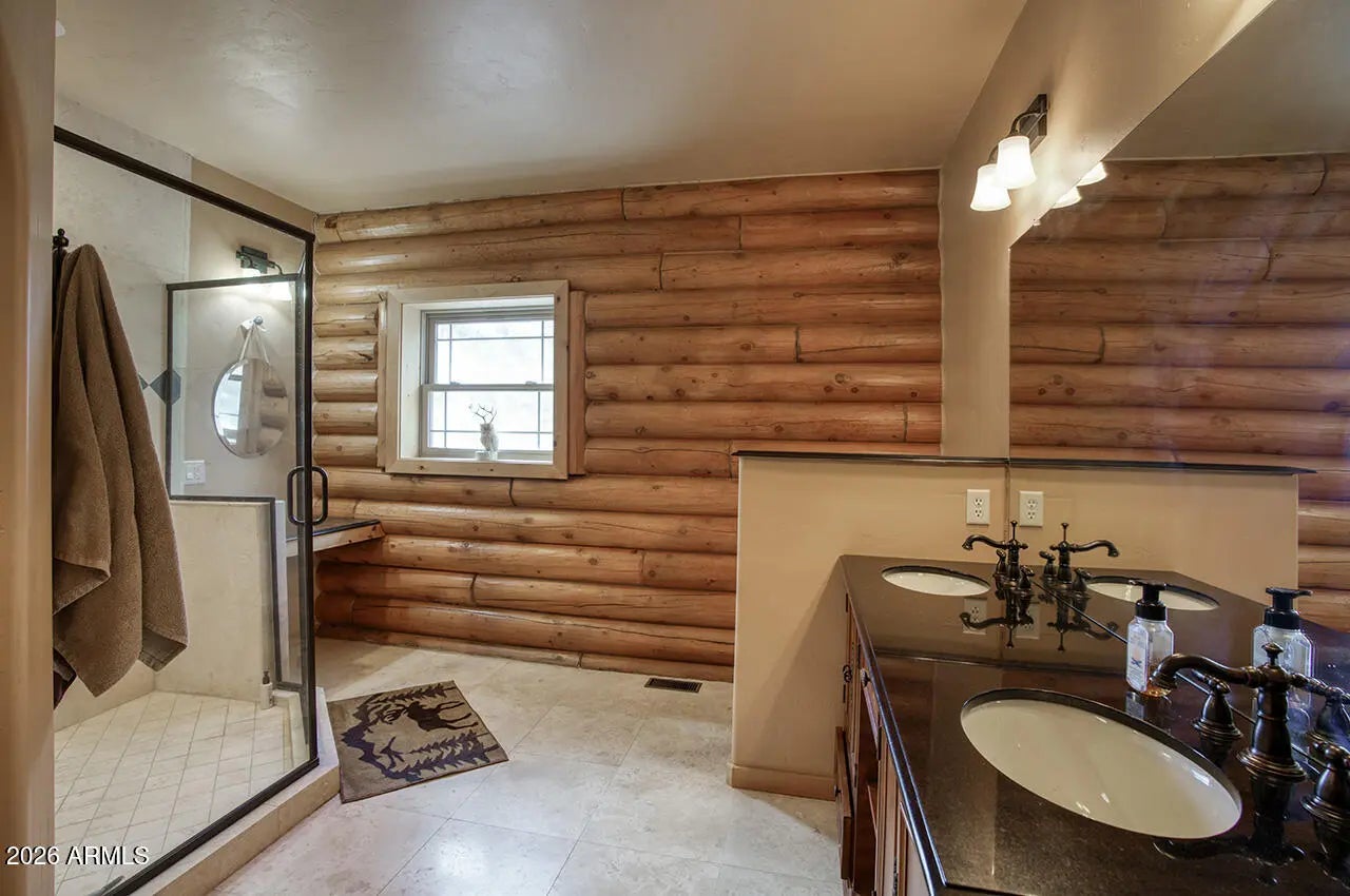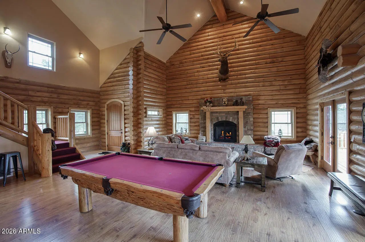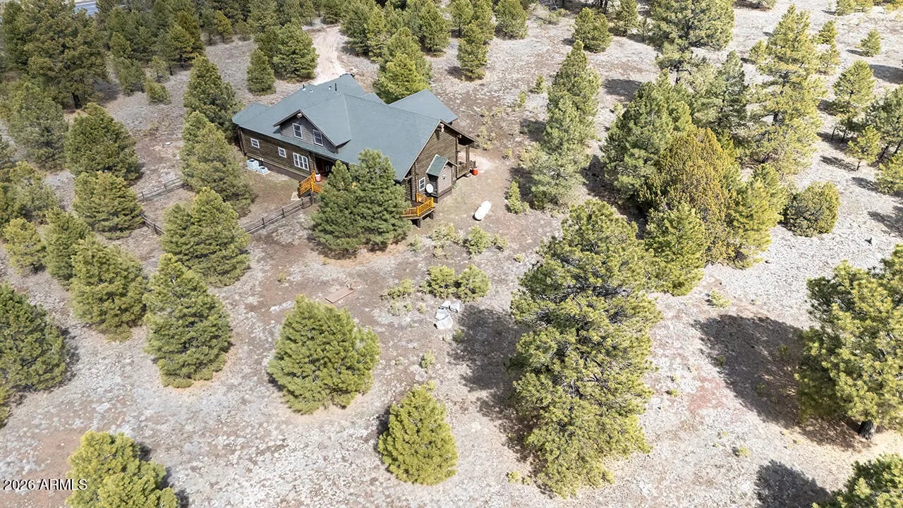 Genuine log cabin in the tall pines of Parks, AZ on 5 private wooded acres. Easy access just off I-40, yet tucked away in peaceful forest surroundings. Less than 20 minutes to Flagstaff, 40 minutes to Arizona Snowbowl. Comes fully furnished and ready to go! Inside, immense vaulted ceilings and a warm gas fireplace anchor the great room, while double French doors open to an expansive covered deck perfect for relaxing or entertaining. Gorgeous kitchen features granite counters and stainless steel appliances. Spacious primary suite on the main level with split floor plan. Bonus room, laundry with sink, tiled showers throughout. Fully furnished including pool table, TVs and deck furniture--move-in ready mountain retreat. Ideal full-time home, vacation getaway, or turnkey short-term rental use. Many of the furnishings were custom made for this cabin. Property is an hauled water--serviced by a 2500 gallon tank. Leased propane tank from AmeriGas provides gas to various appliances. New furnace installed in 2020. Water pressure tank and pump were replaced in 2018 and new deck railing was installed in 2026.