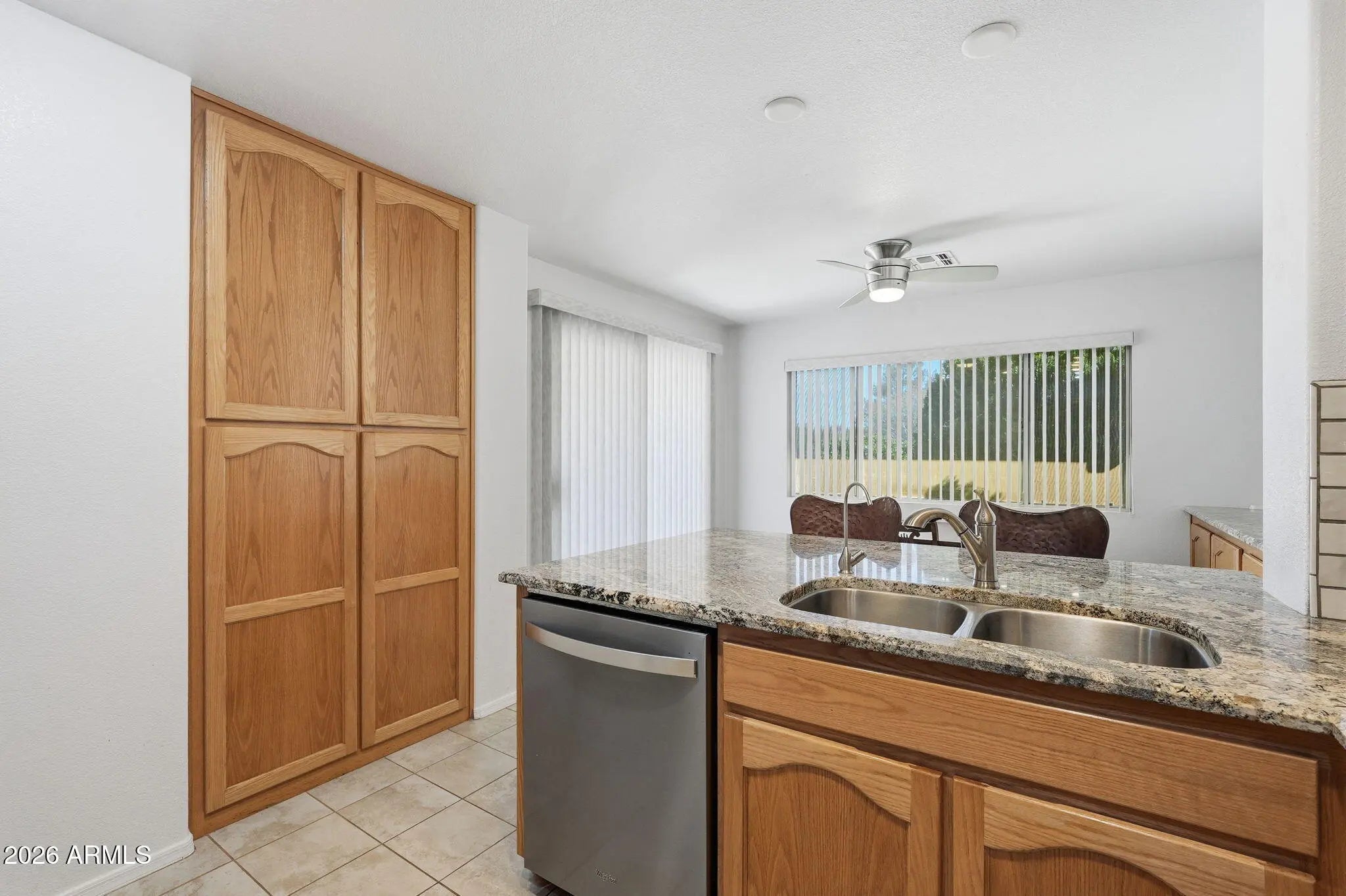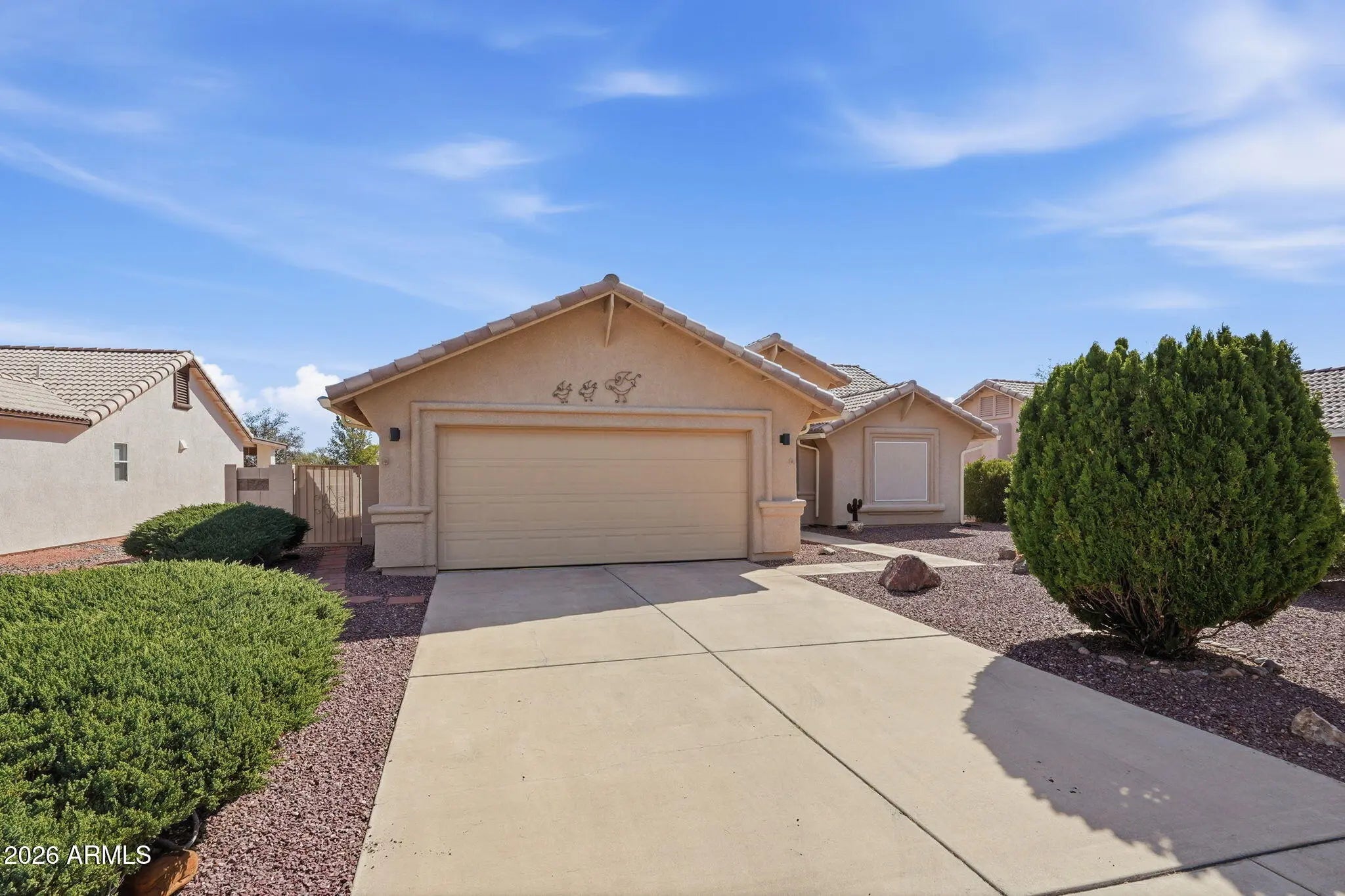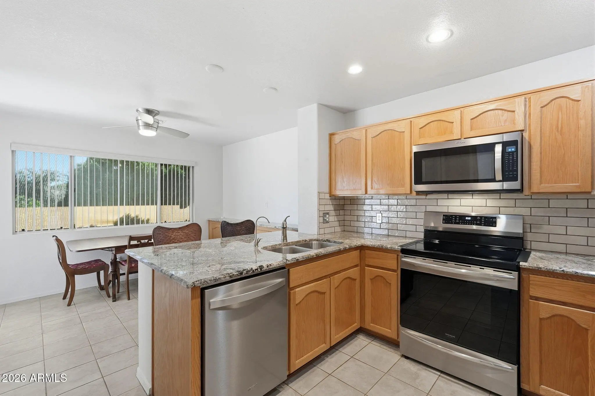 Arizona living at its best in the highly desirable 55+ gated community of Winterhaven. Move-in ready split floor plan with upgrades throughout including tile flooring, sunscreens on exterior windows, and a new HVAC (2025). Kitchen features stainless steel appliances and granite countertops. Washer and Dryer with a laundry sink are also included. The spacious primary suite has a walk-in closet, double sinks, large garden tub, and a separate shower. Step outside to your covered patio oasis, perfect for relaxing or entertaining, surrounded by beautiful low-maintenance desert landscaping. The neighborhood offers a community pool, clubhouse, pickleball and many other activities. A wonderful opportunity in a welcoming adult community. See it today!