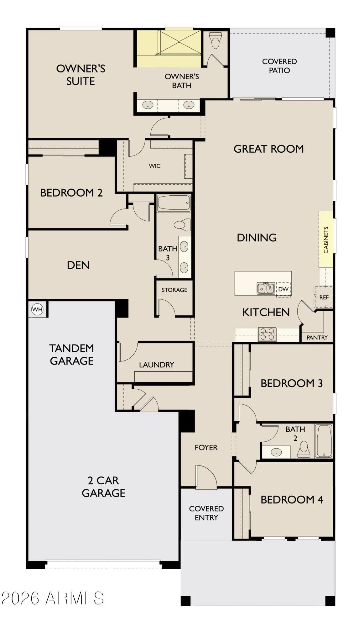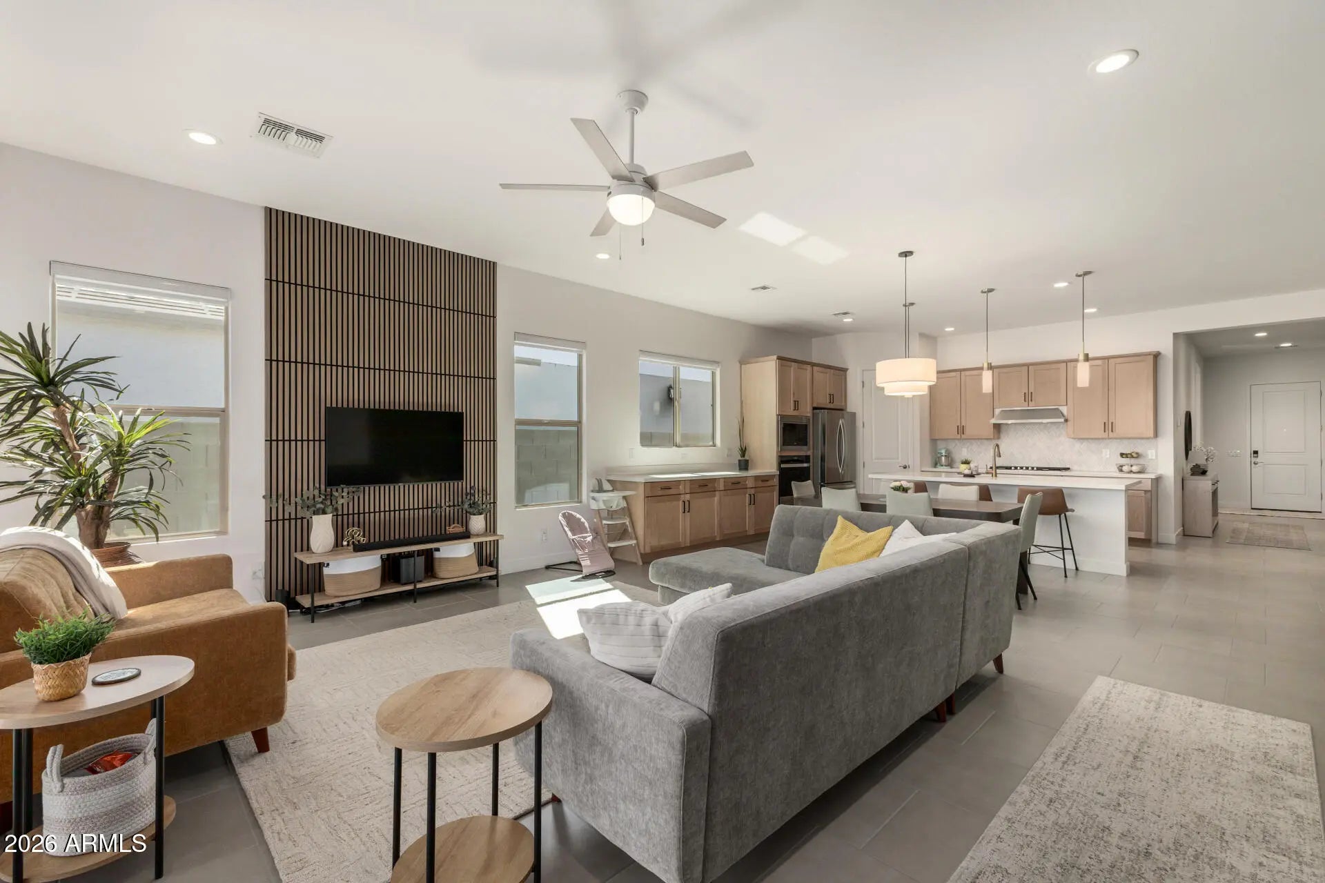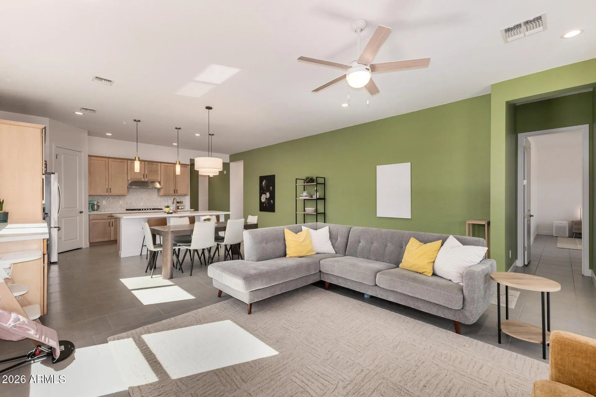 Beautifully designed 2,399 sq ft single-level home built by Ashton Woods in the highly desirable master-planned community of Destination at Gateway East. This modern home features 4 bedrooms plus a den, 3 bathrooms, and a 3-car tandem garage -- all under 10-foot ceilings with tile flooring throughout (no carpet!). Inside, you'll find a bright, airy layout filled with natural light, contemporary lighting, and modern paint accents in warm, earthy tones with a bright accent color here and there that create an inviting atmosphere throughout. The open-concept great room is enhanced by a stylish feature wall and flows seamlessly into the beautifully appointed kitchen -- perfect for entertaining. Enjoy natural wood-toned shaker cabinetry with soft-close drawers and cabinets, crown molding, and hardware accents, crisp white quartz countertops, tile backsplash, stainless steel appliances, a walk-in pantry, and an oversized island with space for breakfast bar seating. The spacious primary suite offers a relaxing retreat with views of the Superstition Mountains, a generous walk-in closet, and a private bath featuring an oversized dual-sink vanity. The additional bedrooms are well-sized with insulated walls between bedrooms and bathrooms for added noise reduction. The versatile den provides the perfect space for a home office, media room, or game area. This home is built smart -- pre-wired for security cameras and a security system, pre-wired for three wireless access points, and equipped with smart light switches, a smart garage door opener, and smart roller shades. A 3-zone HVAC system ensures energy-efficient comfort throughout. Step outside to Superstition Mountain views and a backyard that's a blank canvas ready for your custom design, with the added bonus of afternoon shade from the home's east/west orientation. Enjoy a covered patio, flagstone, and plenty of space for outdoor dining, weekend barbecues, and play. Residents of Destination at Gateway East enjoy community parks, greenbelts, playgrounds, and gathering spaces, with convenient access to the SR-24 corridor, Phoenix-Mesa Gateway Airport, and major East Valley employment hubs. Shopping and dining are minutes away at Queen Creek Marketplace and the retail centers along Ellsworth and Ray Roads. Sports and recreation enthusiasts will love nearby Legacy Sports Complex (Bell Bank Park), one of the largest multi-sport facilities in the Southwest. The growing Canyon State Entertainment District offers additional dining, entertainment, and family-friendly activities. Conveniently located near ASU Polytechnic campus and served by the highly regarded Queen Creek Unified School District. Modern design, thoughtful upgrades, and an unbeatable location make this home a perfect blend of comfort, convenience, and community living.