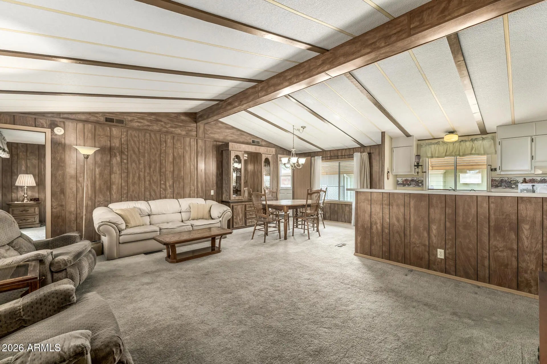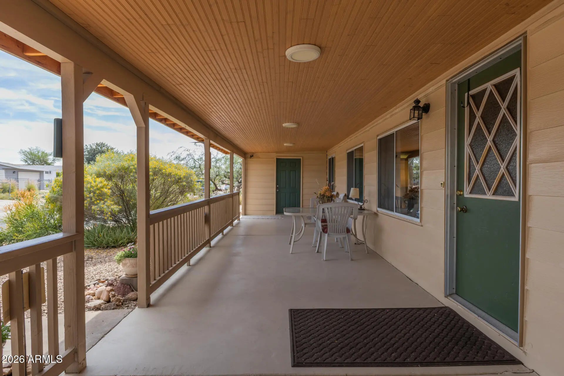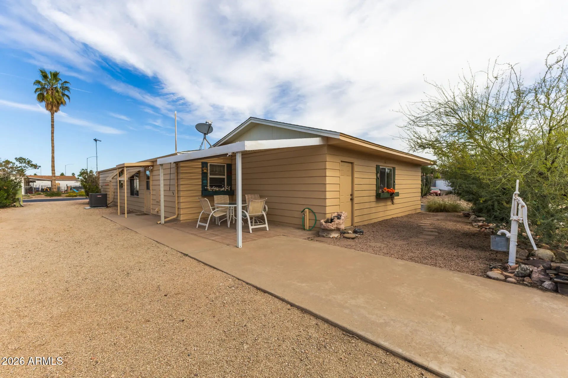 Welcome to this 3 bedroom, 2 bath home in Superstition Country. Enjoy relaxing on the large front porch before stepping inside to a bright interior featuring vaulted ceilings and an open floor plan. The kitchen offers a center island and stainless-steel refrigerator, perfect for everyday living and entertaining. The split floor plan provides added privacy, while the spacious bedrooms offer comfort and flexibility. A separate laundry room adds convenience, and the attached garage provides additional storage and parking. Partially furnished, this home has been very well maintained and is ready for easy move-in and comfortable living. RV electric and sewer hook-ups!
