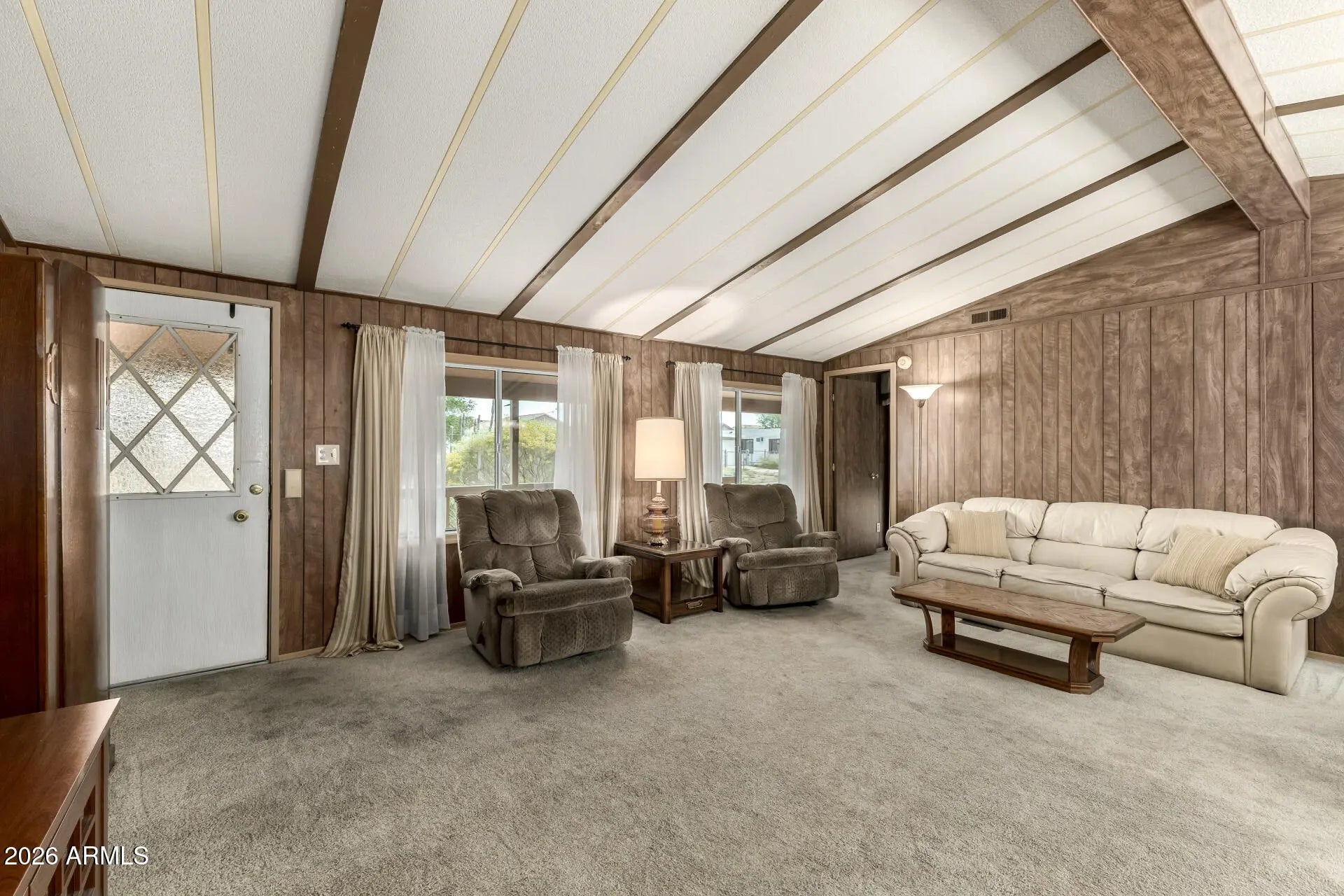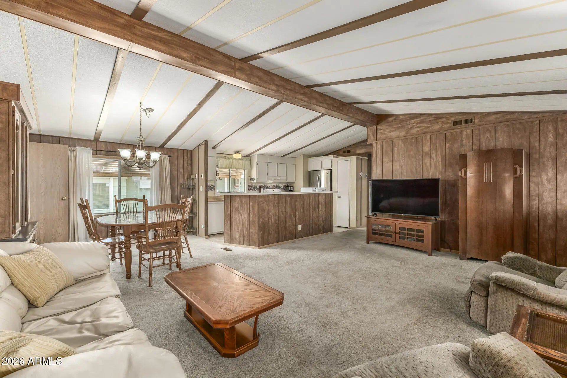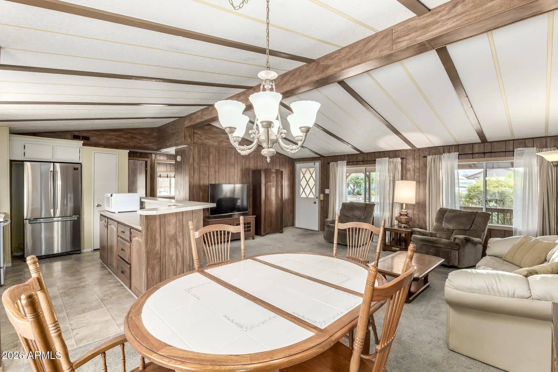 Welcome to this 3 bedroom, 2 bath home in Superstition Country. Enjoy relaxing on the large front porch before stepping inside to a bright interior featuring vaulted ceilings and an open floor plan. The kitchen offers a center island and stainless-steel refrigerator, perfect for everyday living and entertaining. The split floor plan provides added privacy, while the spacious bedrooms offer comfort and flexibility. A separate laundry room adds convenience, and the attached garage provides additional storage and parking. Partially furnished, this home has been very well maintained and is ready for easy move-in and comfortable living. RV electric and sewer hook-ups!