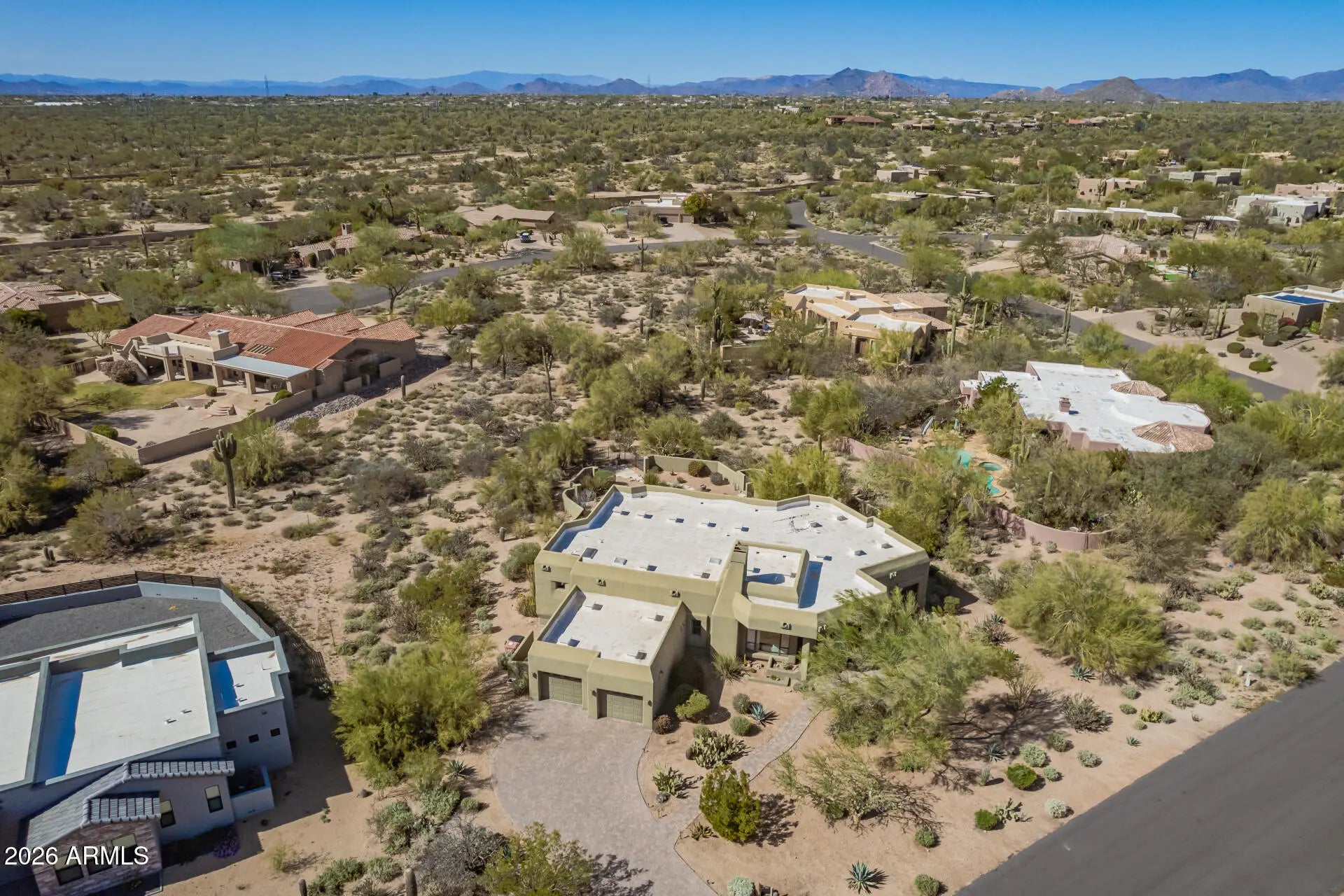 Set against a dramatic backdrop of majestic desert mountains, this exquisite modern adobe-style custom residence captures the essence of elevated desert living. Surrounded by miles of scenic hiking & biking trails, the home offers a rare blend of privacy, natural beauty & refined design. Situated on nearly an acre, the expansive homesite provides ample room for future enhancements, including the potential for a guest house or additional living spaces. Inside, soaring ceilings & walls of picturesque windows frame breathtaking desert vistas while filling the home w/natural light. Elegant plank-style tile flooring, a built-in surround sound system & thoughtfully curated upgrades t/o create a seamless balance of luxury & comfort. NEW INTERIOR PAINT, 3rd room area can be converted into 4th bdrm