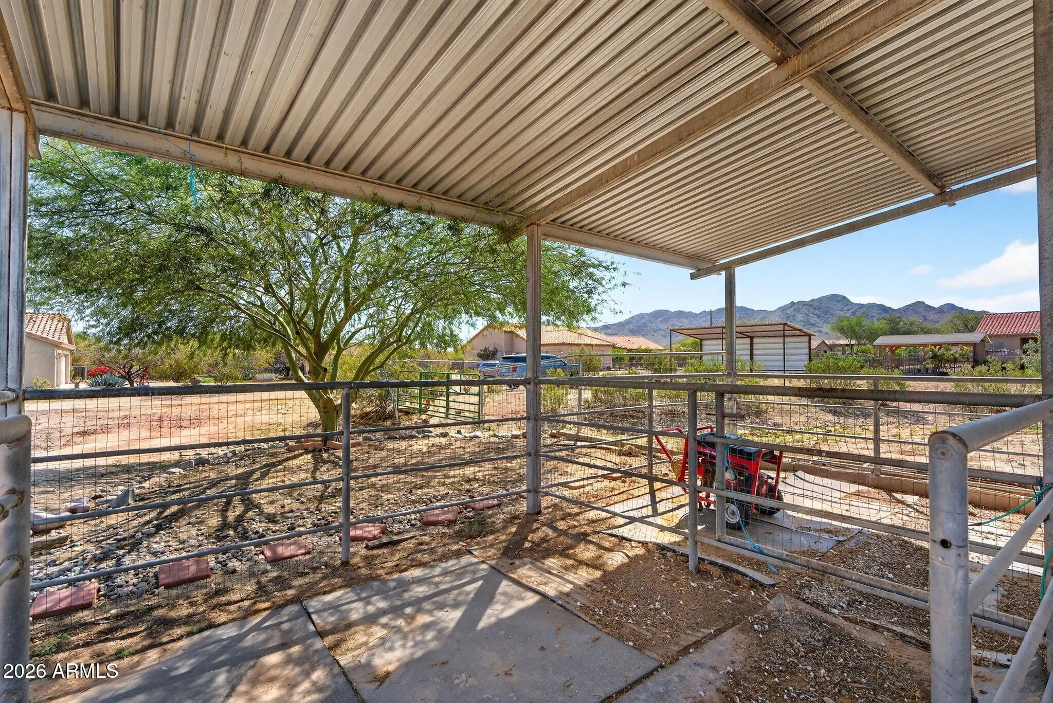 Cul-de-sac lot w/ beautiful San Tan Mountain views. Take in the scenery from the backyard while lounging by the pool featuring a waterfall, pebble tec finish, & in-floor cleaning system. Horse features include a 4-stall barn w/ water & lights, plus a large turnout that gives your horses room to roam. Inside, the home features a split floor plan & a vaulted great room w/ a cozy fireplace that opens to the kitchen & dining area. The kitchen offers tons of counter space & newer s/s appliances. Hardwood floors & plantation shutters t/o along w/ a custom window treatment on the sliding door. The custom security screen & front courtyard create a beautiful first impression, while 2x6 construction adds energy efficiency & quality. Located just blocks from Goldmine Trail in the San Tan Mtns & near Horseshoe Park, this property is perfectly positioned for riding, recreation, & enjoying the best of Queen Creek living.