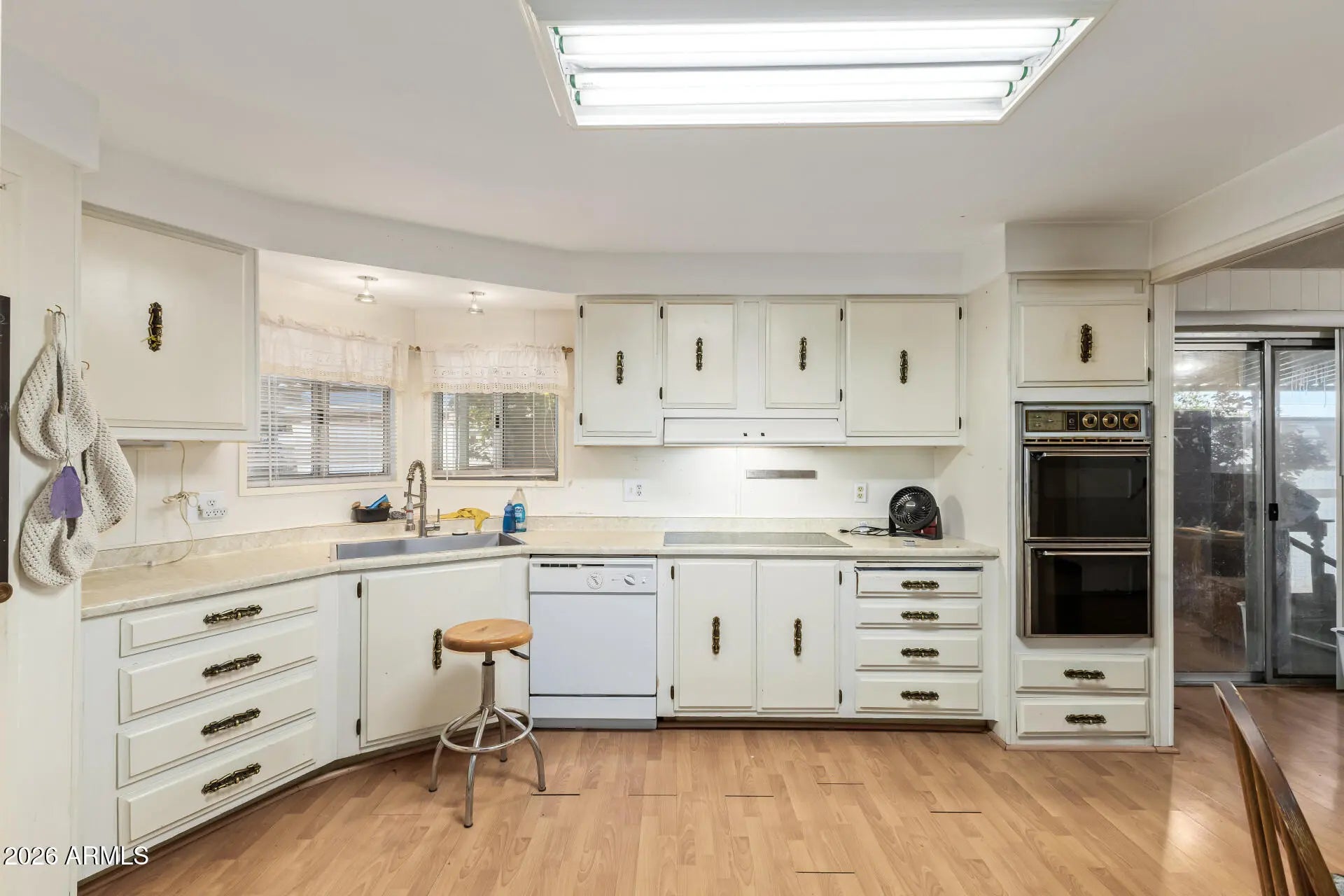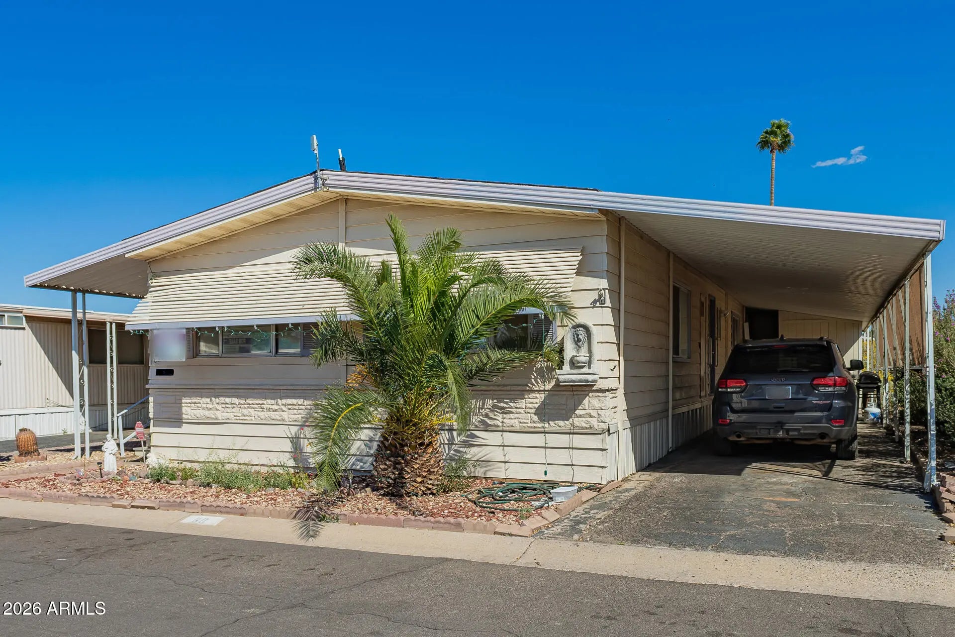 Very large doublewide home featuring 2 bedrooms and 2 bathrooms with a spacious and functional layout. The home offers separate living and dining rooms, plus a large enclosed Arizona room with a pet-friendly area in the back. The kitchen provides plenty of storage, a farmhouse sink, double ovens, and a flat-top range. Enjoy the generous living and dining spaces along with an indoor laundry room. The primary bathroom includes a dual-sink vanity and relaxing garden tub, while the second bathroom features a walk-in shower. Located in a convenient area near major freeways. Pet fencing is allowed. The community welcomes 40+ residents and offers a clubhouse with a pool, spa, card room, and bingo/reception area. Stone accents on the front give the home a modern look.