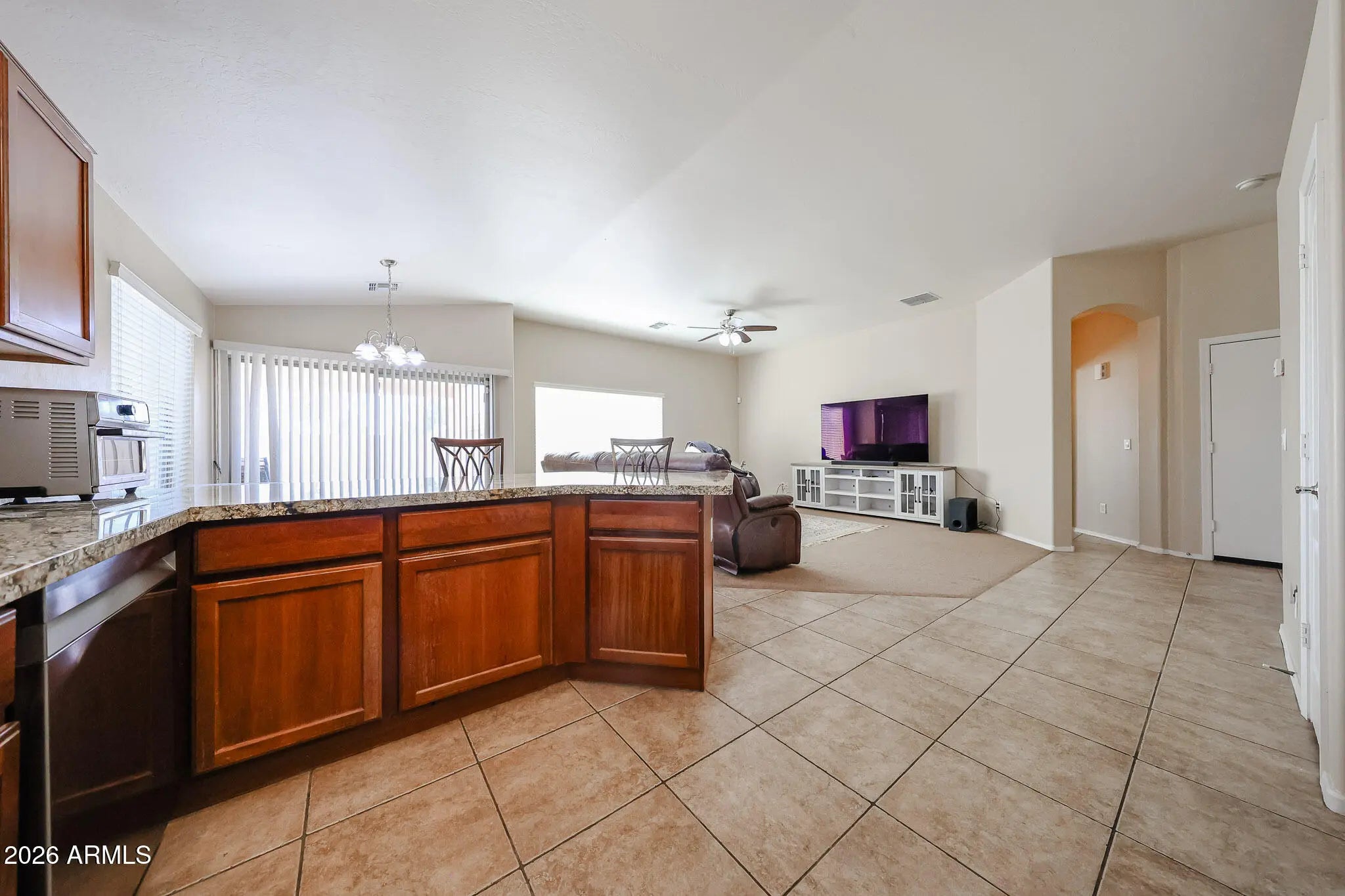 Welcome to this charming 3-bed, 2-bath single-level home on coner lot in Festiva Court! Enter through the foyer into a spacious great room featuring vaulted ceilings and an open layout that flows seamlessly into the kitchen, complete with granite countertops and stainless steel appliances. The oversized primary bedroom is thoughtfully separated from the other two bedrooms, providing added privacy. On the opposite side of the home, you'll find the two additional bedrooms, a secondary bathroom, and the laundry room. Both bathrooms have been recently upgraded, and the home also features a new AC installed in 2026. Located just around the corner from Espee Park and Spray Pad, this home is also minutes from Downtown Chandler, where you can enjoy vibrant nightlife, shopping, and restaurants.