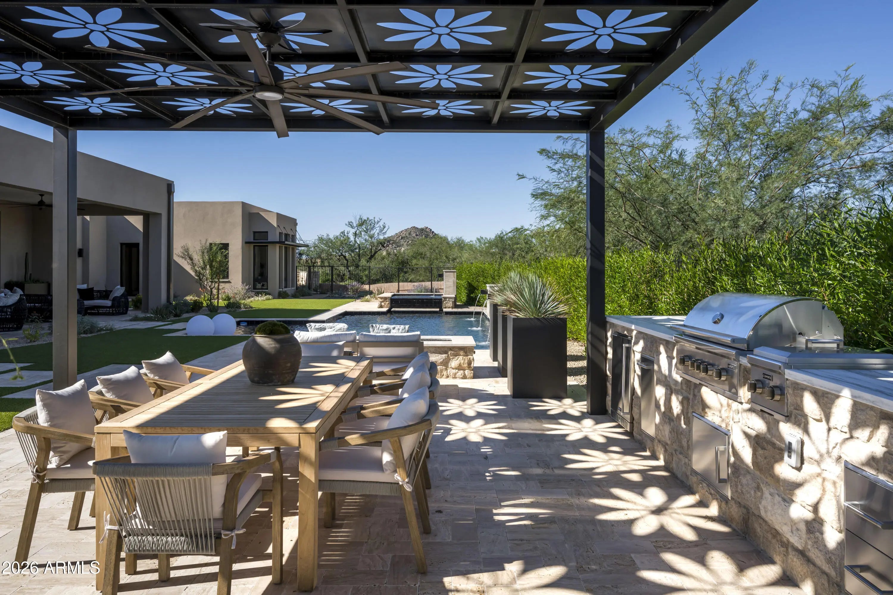 Experience elevated desert living at its finest in one of the newest completed estates within the prestigious community of Whisper Rock Estates. This extraordinary residence is a fully customized interpretation of the award-winning Cheval floor plan, masterfully built by Camelot Homes through its bespoke division, Cameron Custom. Thoughtfully designed to embody seamless indoor-outdoor living, the home unfolds with effortless sophistication. Expansive walls of glass dissolve the boundaries between interior elegance and the surrounding desert landscape, creating a harmonious flow ideal for both grand scale entertaining and quiet evenings under the Arizona sky. Inside, four generously appointed bedroom suites and five-and-a-half spa-inspired baths provide refined comfort for residents a guests alike. A richly detailed private den offers the perfect executive retreat, while a spacious bonus room invites endless possibilities--from media lounge to game room or wellness studio. Completing the estate is a beautifully appointed detached guest house, ideal for extended stays or multigenerational living with privacy and ease. Every finish has been intentionally selected by an elite design team, layering sophisticated neutral palettes with exquisite textures, custom millwork, statement lighting, and premium materials throughout. The result is a residence that feels both timeless and contemporary--luxurious yet warmly livable. Created for those who appreciate craftsmanship, privacy, and elevated design, this home delivers an unparalleled resort-style experience in one of North Scottsdale's most coveted enclaves. Designer furnishings are available by separate agreement, offering a truly turnkey opportunity.