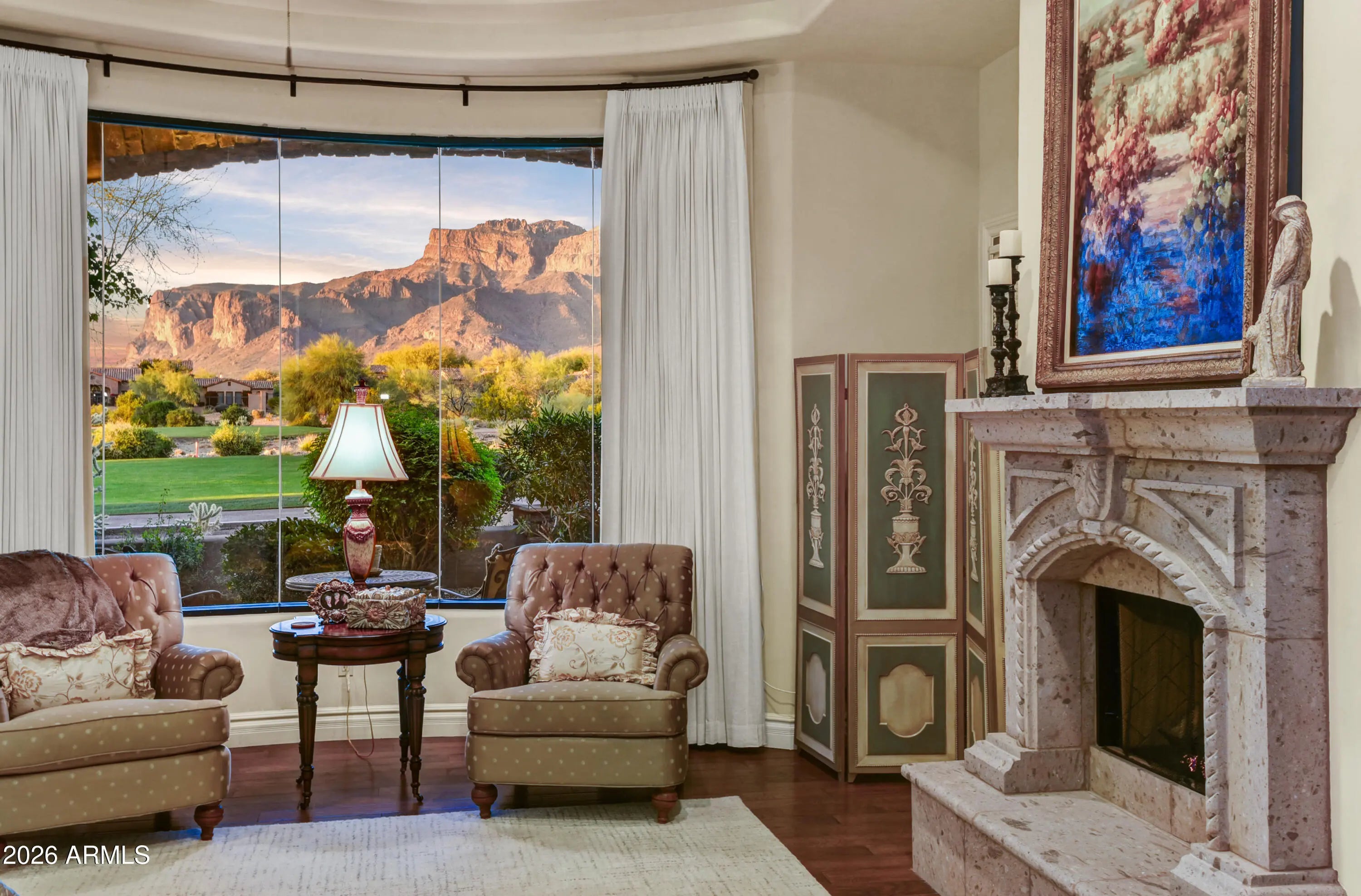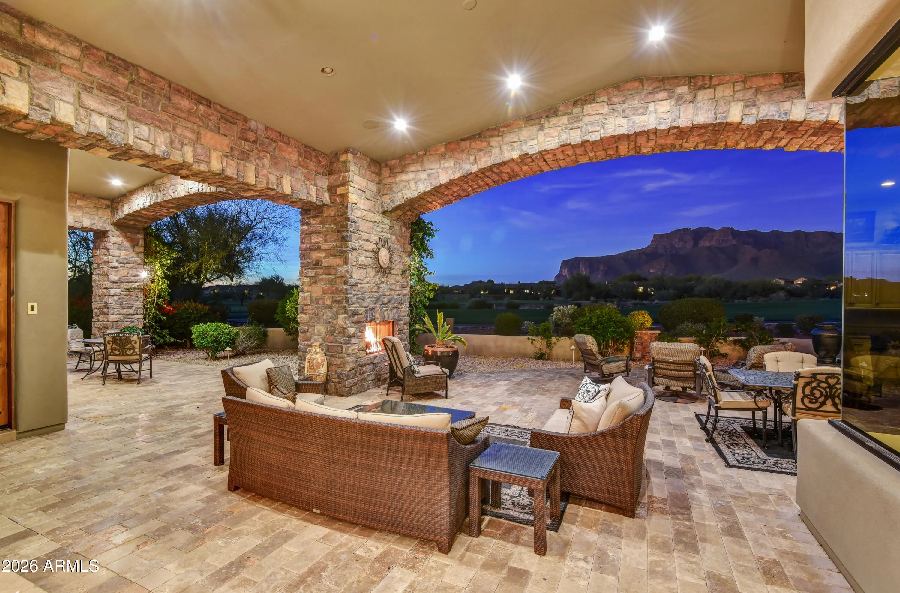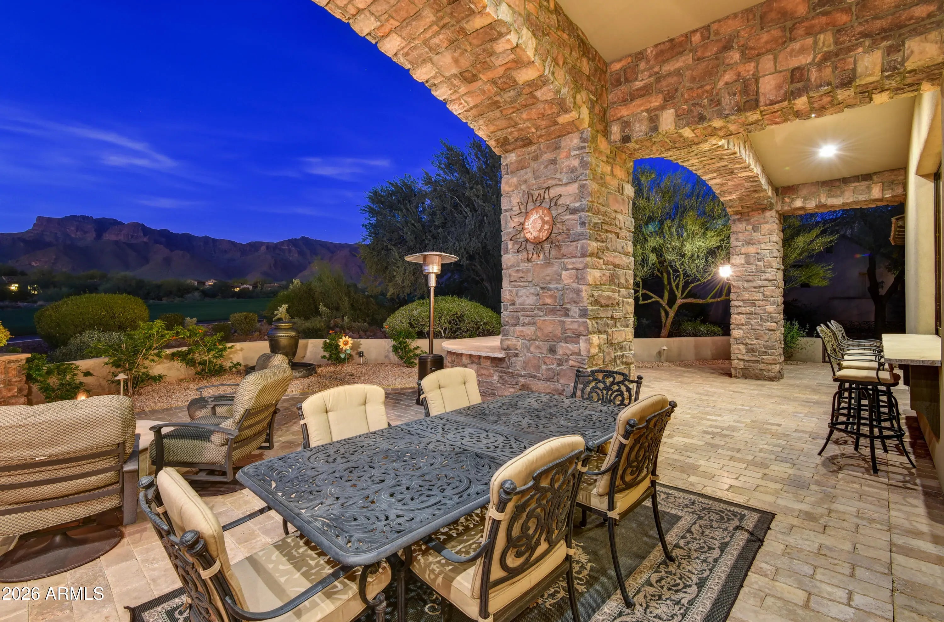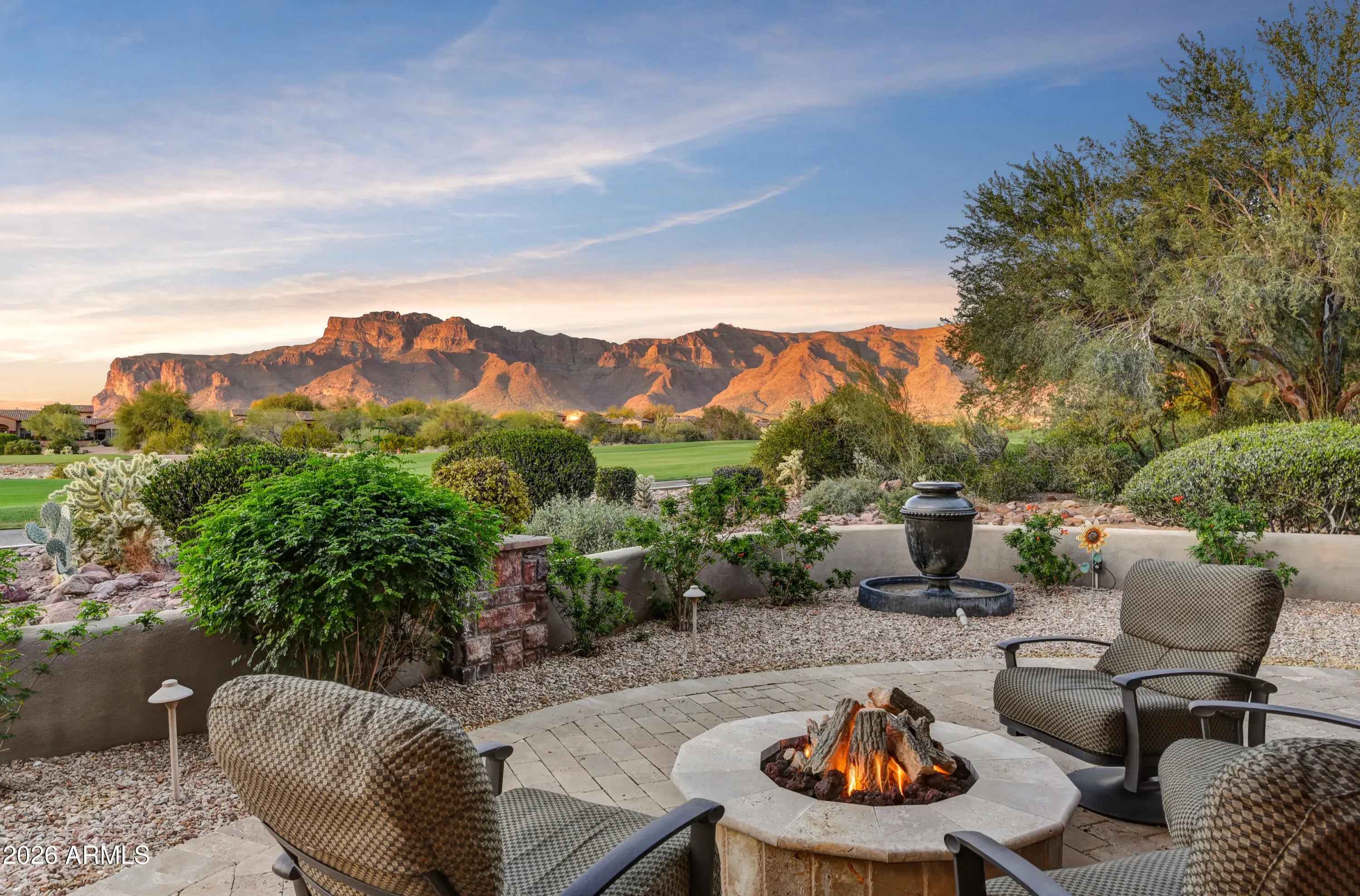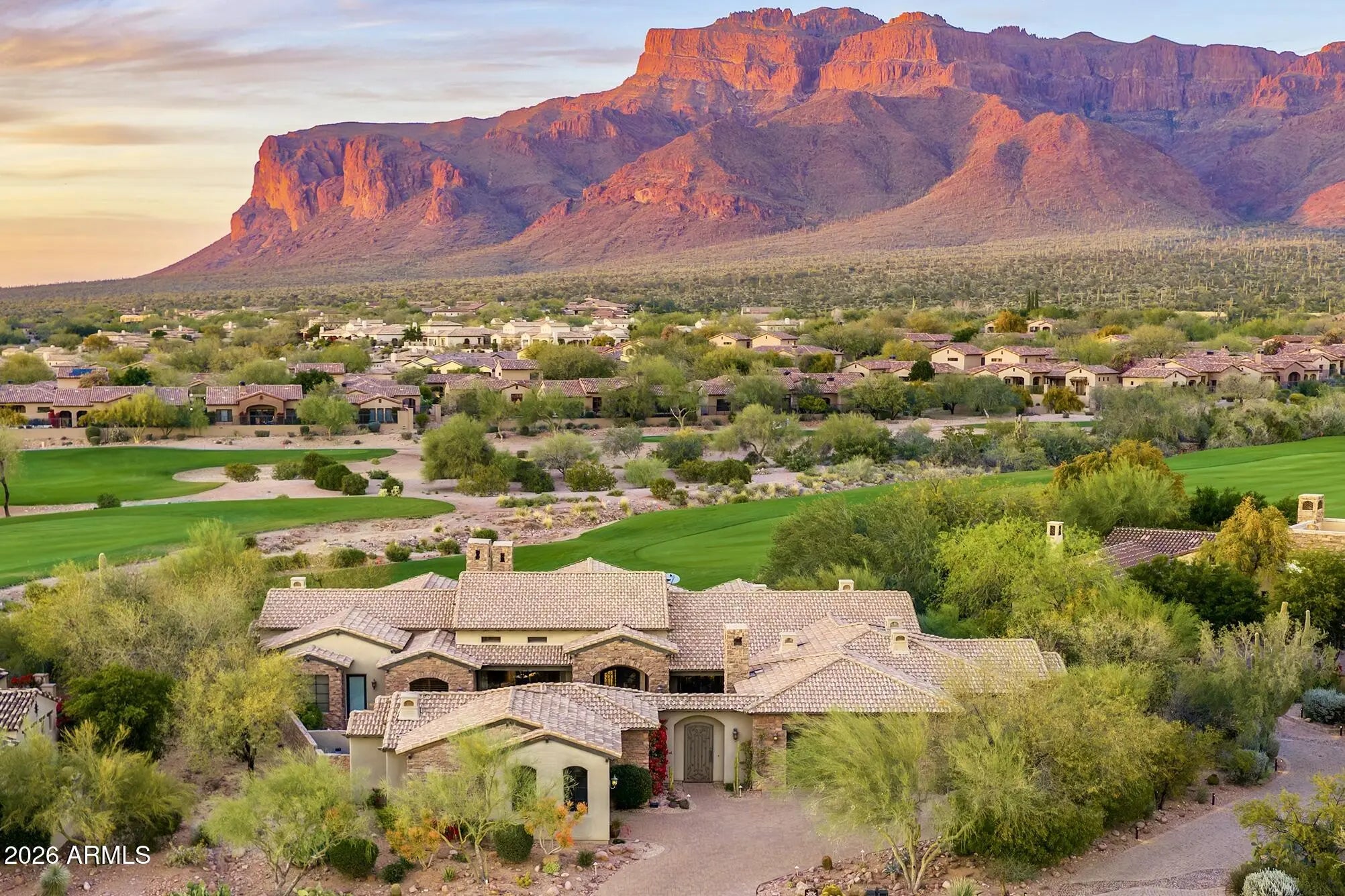 Once in a great while, an exceptional residence becomes available which excels remarkably in all that it has to offer in location, views, timeless architecture, upgraded features & its livability for daily activities & entertaining. OFFERED TURNKEY FURNISHED, this impeccably maintained home features incredible unobstructed views of the Superstition Mountains over 2 fairways of the Lost Gold course. Upgraded Viking appliances, exquisite true craftsman custom cabinetry t/o, light-colored granite counters t/o, designer lighting, ceilings vary from 10' to 19.5' with no two ceilings the same--tongue & grove to wood beams to coffered. Flooring is either wood or travertine. Separate complete guest casita. Heated pool & spa. Gated Lyle Anderson Community w/36 holes of Nicklaus-designed golf. Entire exterior newly painted. Quiet cul-de-sac and no traffic-secluded. All travertine flooring in the home is chiseled edge, all interior doors are 8' solid core, with Emtec hardware; whole house central vac, and stone showers. All bedrooms have ensuite baths with granite counters; all have walk-in closets with buildouts, and ceilings 10' or higher. Clerestory windows provide accents. A delightful sitting area graces the end of a hallway with a lighted art niche. The gourmet kitchen features granite on counters, backsplash, and a large kitchen island with sink. Double wall Viking thermal convention ovens, Viking 6 burner gas cook top with griddle. Side by side stainless 50" Viking refrigerator/freezer. Two brand new dishwashers. The highest quality custom made cabinetry is throughout the entire home. Breakfast bar and a kitchen breakfast nook with wonderful mountain views. Pass through to patio over the kitchen counter to bar style eating on the back patio through a disappearing wall of glass. A walk-in pantry has granite, travertine and a key-drop. Generous formal dining room, 17' x 14', opens to the pool patio, has a coffered ceiling, large buffet server and an entire wall to wall granite countertop as a butler's workstation featuring fine cabinetry and an under counter refrigerator with matching front, and a sink. A separate wine cellar opens to the dining room. Oversized covered back patio is home to a large built-in gas BBQ, cozy fireplace, fountain, and resort style 5 conversation areas, and an enchanting gas fire pit seating area to enjoy the evening sunset glow on the face of the mountain. The great room's stage is set with the 19.5' vaulted ceiling accented by wood beams and an attractive tongue and grove application. 12' tall sliding glass doors 18' feet wide telescope in the wall allowing (as needed) allowing the back patio and the great room to be joined 'as one.' The architect's grand patio cover design perfectly framed the iconic Flat Iron and mast head of the storied mountain. A stately Cantera stone gas fireplace compliments the ambiance of this lovely and comfortable area perfect for family gatherings. A unique coffered ceiling, plantation shutters, and wood flooring create the ideal atmosphere for the polished office, 12' x 11.5', perfect for any executive, which has views of the central pool patio. The grand primary suite has 12' ceilings, wood floors, stunning mountain views, a Cantera fireplace, an exit to a patio, and an extra-large closet with a complete, attractive custom build out. A bar area with granite counters, sink, and refrigerator. A smaller office compliments the primary suite. The bath ensemble has travertine flooring, separate sinks, granite counters, exit to pool, jetted tub, bidet, 2 water closets, snail shower. Split plan bedrooms 1 and 2, from primary suite, have wood flooring, walk-in closets with built-ins and ensuite baths. Bedroom 1 serves as a junior primary with double sinks, large stone shower and a jetted tub. A designer inspired powder room graces the hallway. Upgraded lighting throughout. The resort style large pool terrace separates the main home from the casita. Heated Pebble Tec pool with 6 fountains and a spillover from the heated spa into the pool. The pool area is located on the south side of the main home for winter sun, ideal for winter visitors, and privacy from the golf course. The complete laundry has numerous cabinets, travertine counters, sink, and a built-in ironing board. Garages are oversized with 2 of the bays are as long as 26.5 and 28' long, epoxy floors, abundant storage cabinets and a sink. Gold Canyon is Arizona's best kept secret. Superstition Mountain is the only 36-hole private golf club in all central Arizona, with a limited membership, allowing one of the lowest golfer to course ratios to be found. The golf club has hosted 8 nationally televised tournaments on the LPGA and Champions Tours. The community is only 35 minutes from Sky Harbor and 20 minutes to Mesa Gateway. Only one traffic light separates the members form the Atlantic and Pacific Oceans. Where Else? Nowhere else but here!