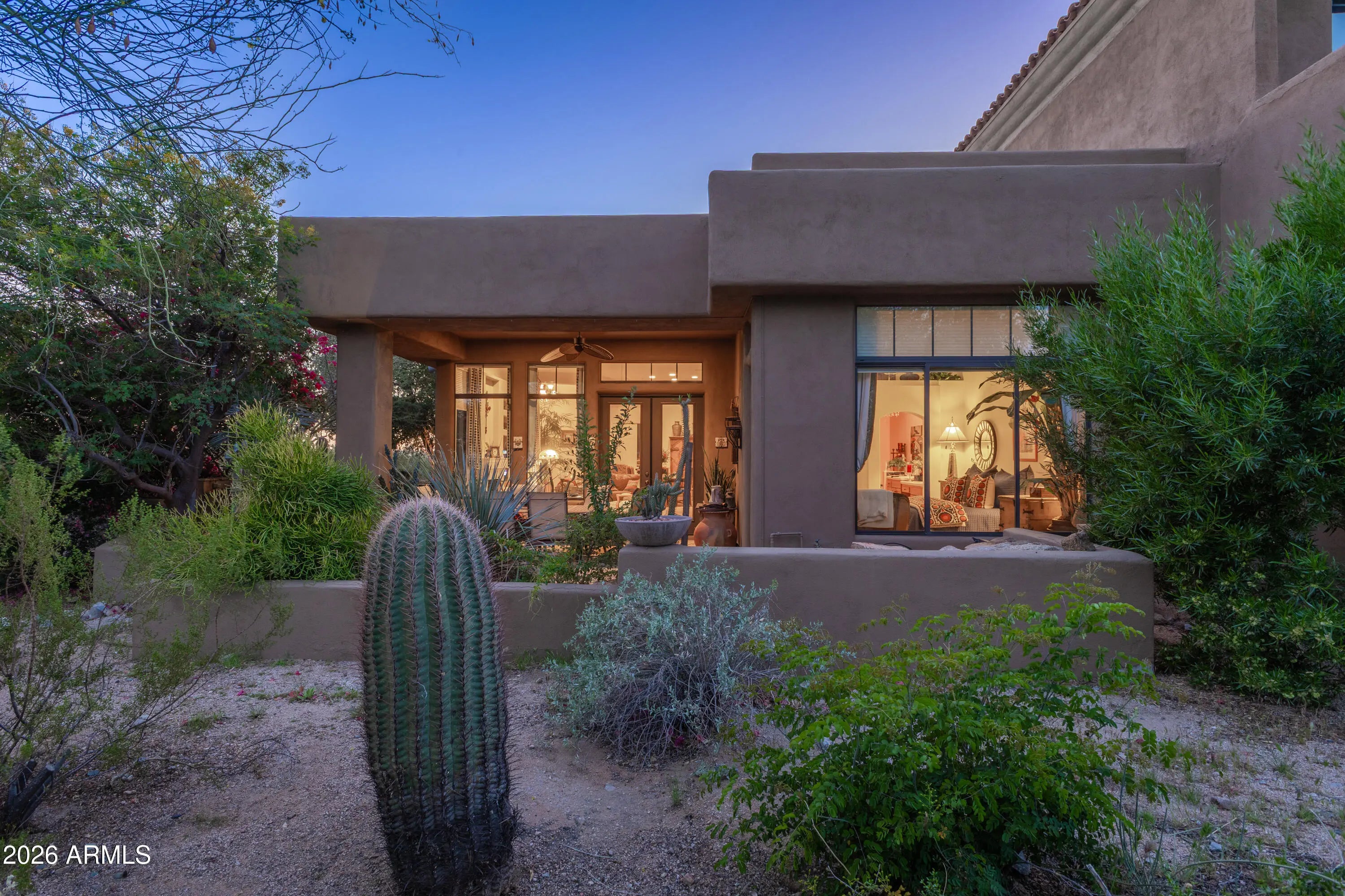 Warm and inviting, this single-level Columbia townhome is ideally positioned along the golf course in the guard-gated Country Club at DC Ranch neighborhood, offering picturesque views of the 7th green against the backdrop of the McDowell Mountains. Tucked at the end of a quiet cul-de-sac, this desirable end unit enjoys exceptional privacy and a serene setting--a rare opportunity within this sought-after enclave. Inside, the great room's charming interior décor creates a welcoming atmosphere while oversized windows and a glass slider capture natural light and showcase the sweeping views of both the golf course and surrounding desert landscape. The kitchen combines character and function with bright Mexican tile countertops and backsplash, double ovens including a Viking gas range, counter seating and a breakfast nook. The spacious primary suite is positioned to take full advantage of the golf course and mountain views and includes a private exit to the patio. A guest suite on the opposite end of the home offers excellent privacy for visitors, featuring its own exterior entrance/exit, a kitchenette with sink, built in fridge and microwave, and an ensuite bathroom. Two offices provide flexibility for work or hobbies, with one office easily convertible into a third bedroom if desired. The private back patio provides an ideal setting for entertaining or relaxing, complete with a built-in barbecue, misting system and a bubbling fountain. Exterior maintenance--including the roof and landscaping--is handled by the HOA, making this property an ideal lock-and-leave residence or a low-maintenance full-time home. This residence is available fully furnished by separate bill of sale for a true turnkey experience. Conveniently located just steps from a community walking path, the home is approximately a 3-minute stroll to the restaurants, boutique shops, and everyday conveniences of Market Street at DC Ranch. Residents also enjoy access to the Columbia neighborhood's private pool, spa, and fitness room, while all DC Ranch residents enjoy the Desert Camp Community Center, which offers a 15,000-square-foot clubhouse, state-of-the-art fitness center, lap pool, splash pad, tennis and pickleball courts, sport court, playground, grassy play areas, and welcoming community gathering spaces. The broader DC Ranch community features 47 parks connected by more than 50 miles of scenic landscaped paths and trails, creating an exceptional lifestyle surrounded by natural beauty and thoughtful amenities.