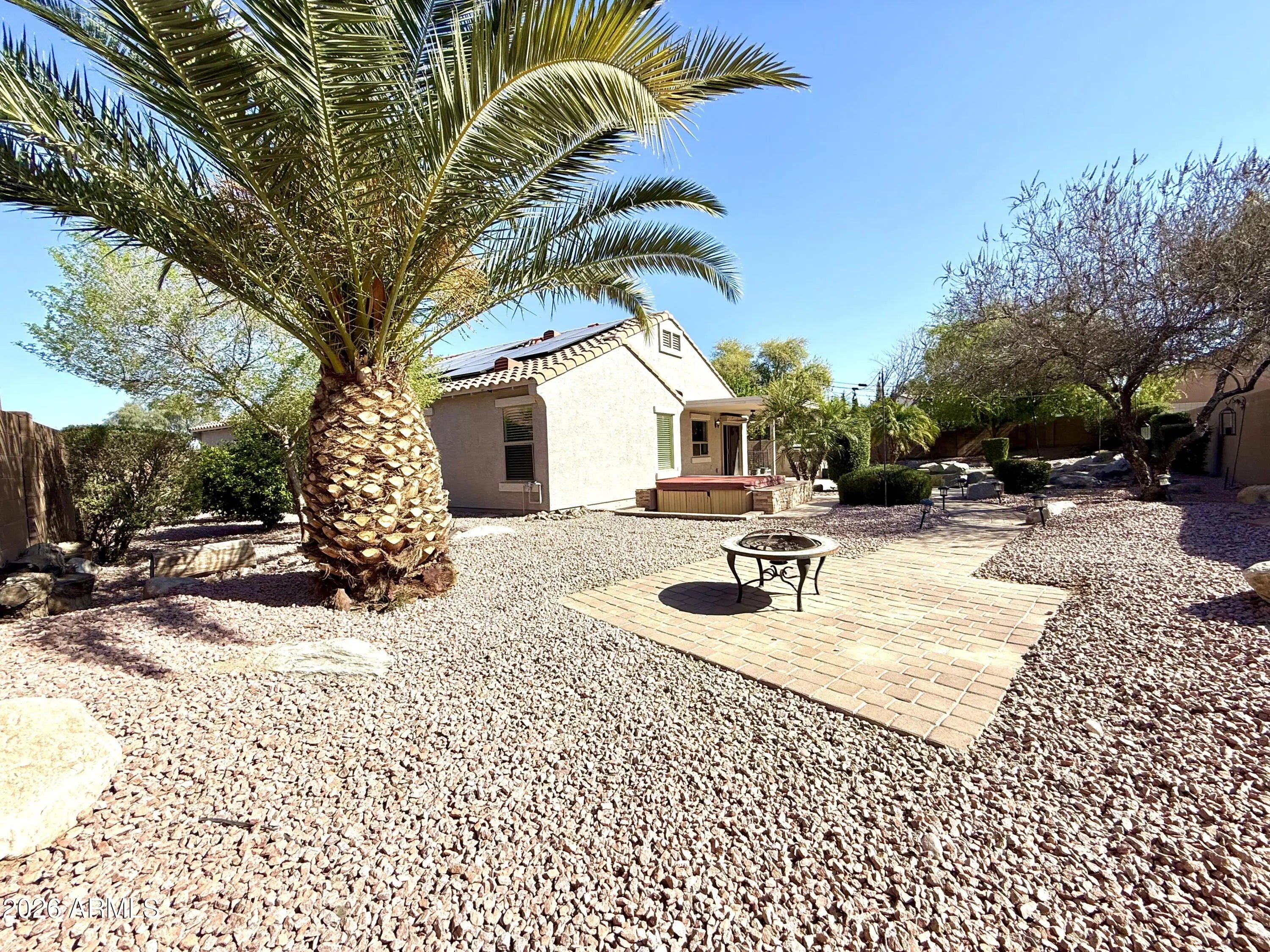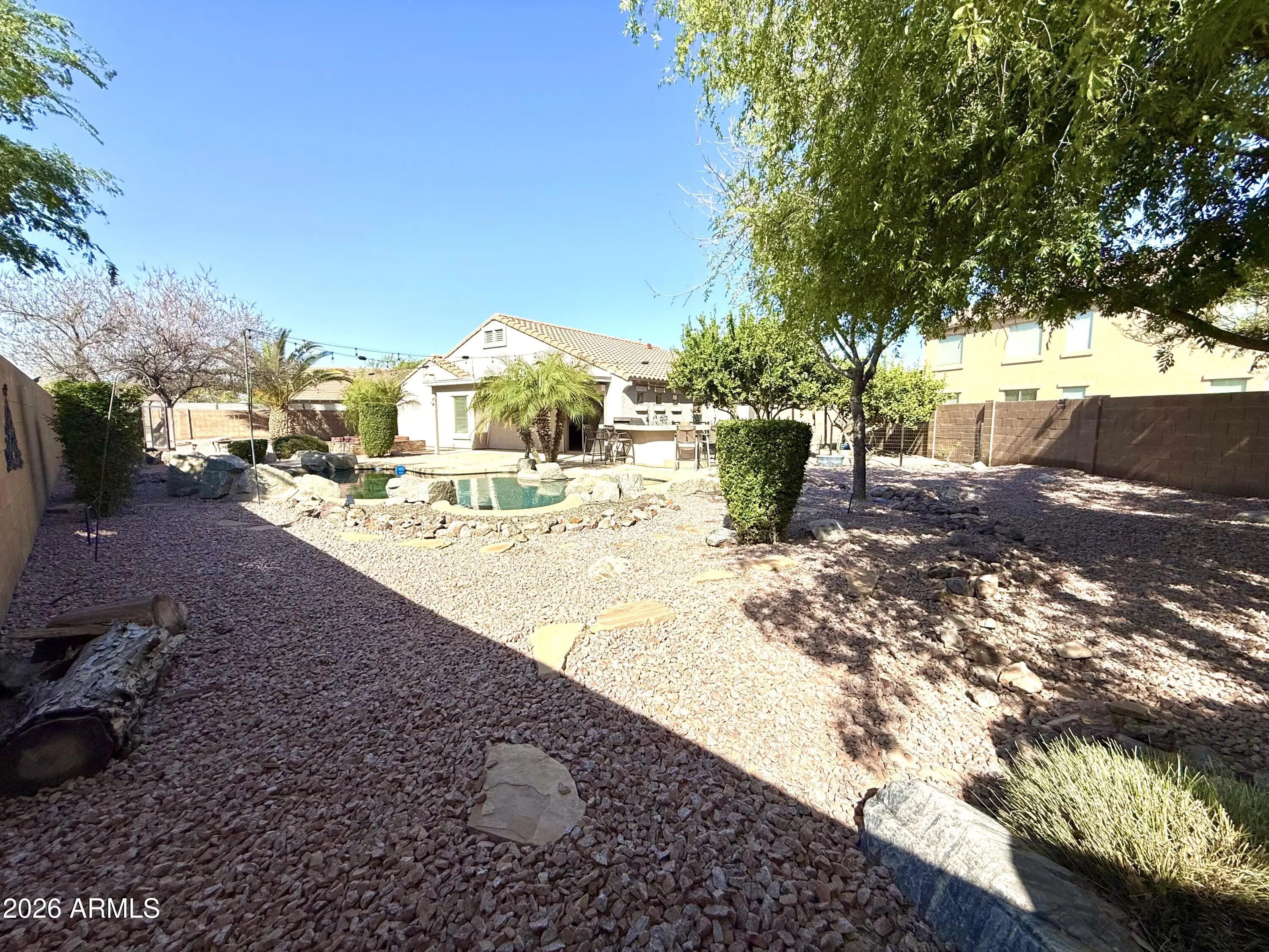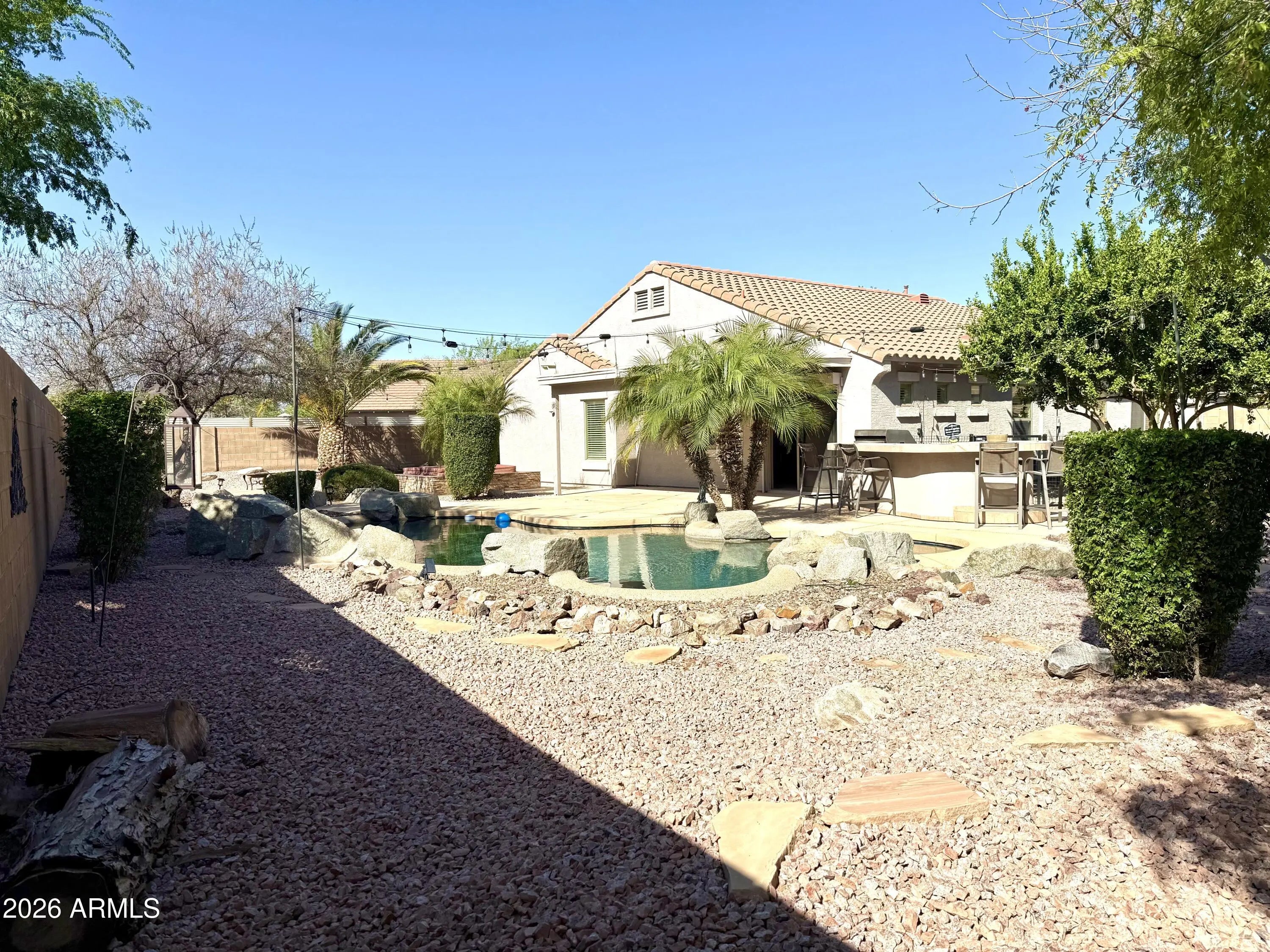Welcome to your private desert oasis! Nestled at the end of a quiet cul-de-sac on one of the largest homesites in Pecan Creek South, this beautifully maintained property sits on nearly a quarter-acre lot and offers the perfect blend of comfort, privacy, and resort-style living. The backyard is truly designed for entertaining and relaxation, featuring a sparkling pebble-finish pool, dramatic rock waterfall, in-ground spa, and an expansive built-in BBQ area--ideal for hosting gatherings or enjoying Arizona evenings at home. Mature shade trees, citrus trees, and flourishing grape vines create a lush, tranquil outdoor retreat that feels like your own private resort. Inside, the thoughtfully designed single-level split floorplan offers three bedrooms and two bathrooms. The private primary suite is separated from the secondary bedrooms for added comfort and privacy, and features an oversized en-suite bath. Throughout the home, you'll find brand-new Berber carpet and fresh interior paint, creating a clean, move-in-ready feel. Additional upgrades include a newer AC unit to keep you comfortable for years to come and fully paid-off solar, providing significant savings on monthly utility bills. Opportunities like this are rare--large cul-de-sac lots in Pecan Creek South seldom come to market. Don't miss your chance to own this exceptional home with space, upgrades, and an entertainer's backyard.