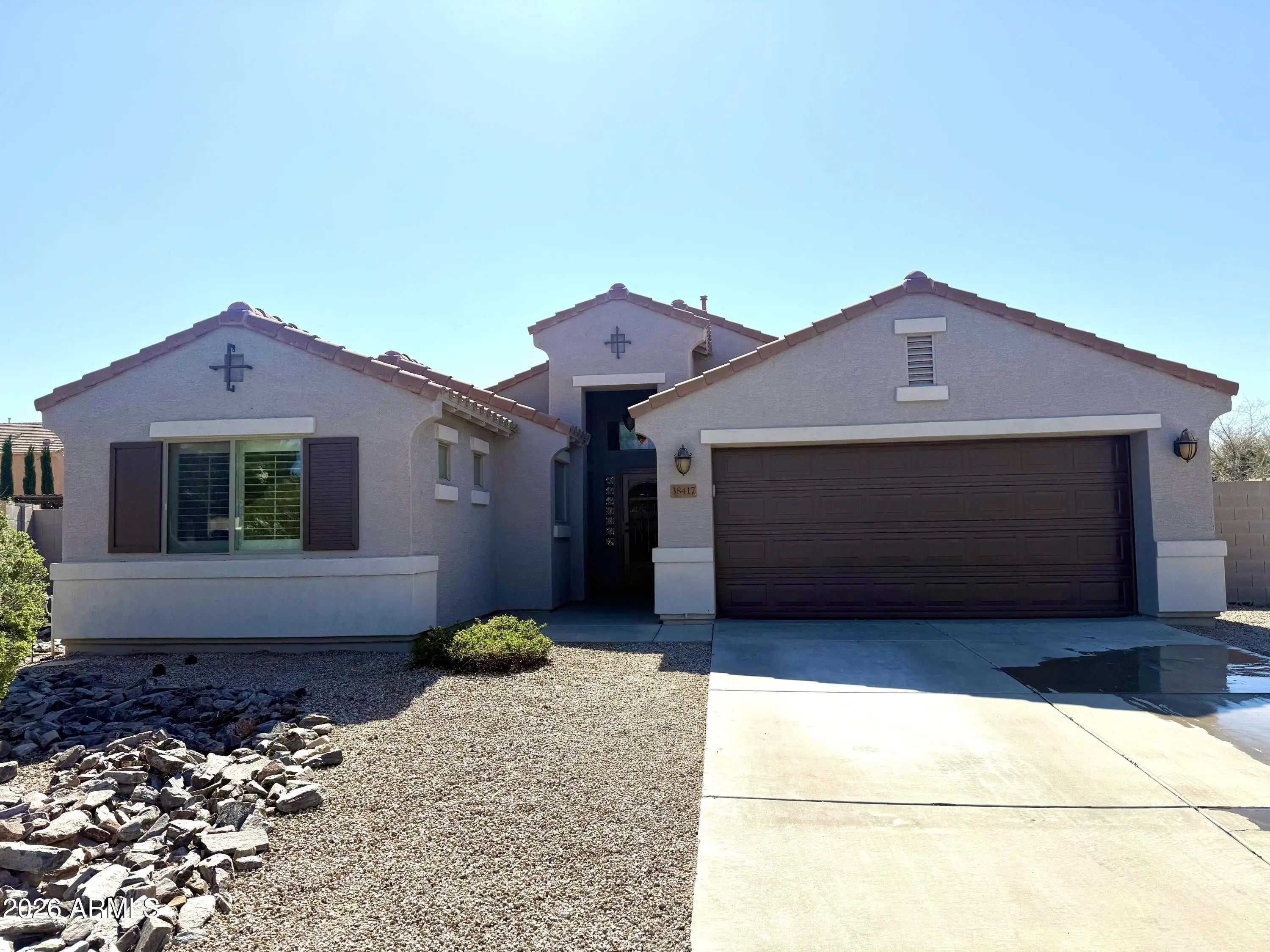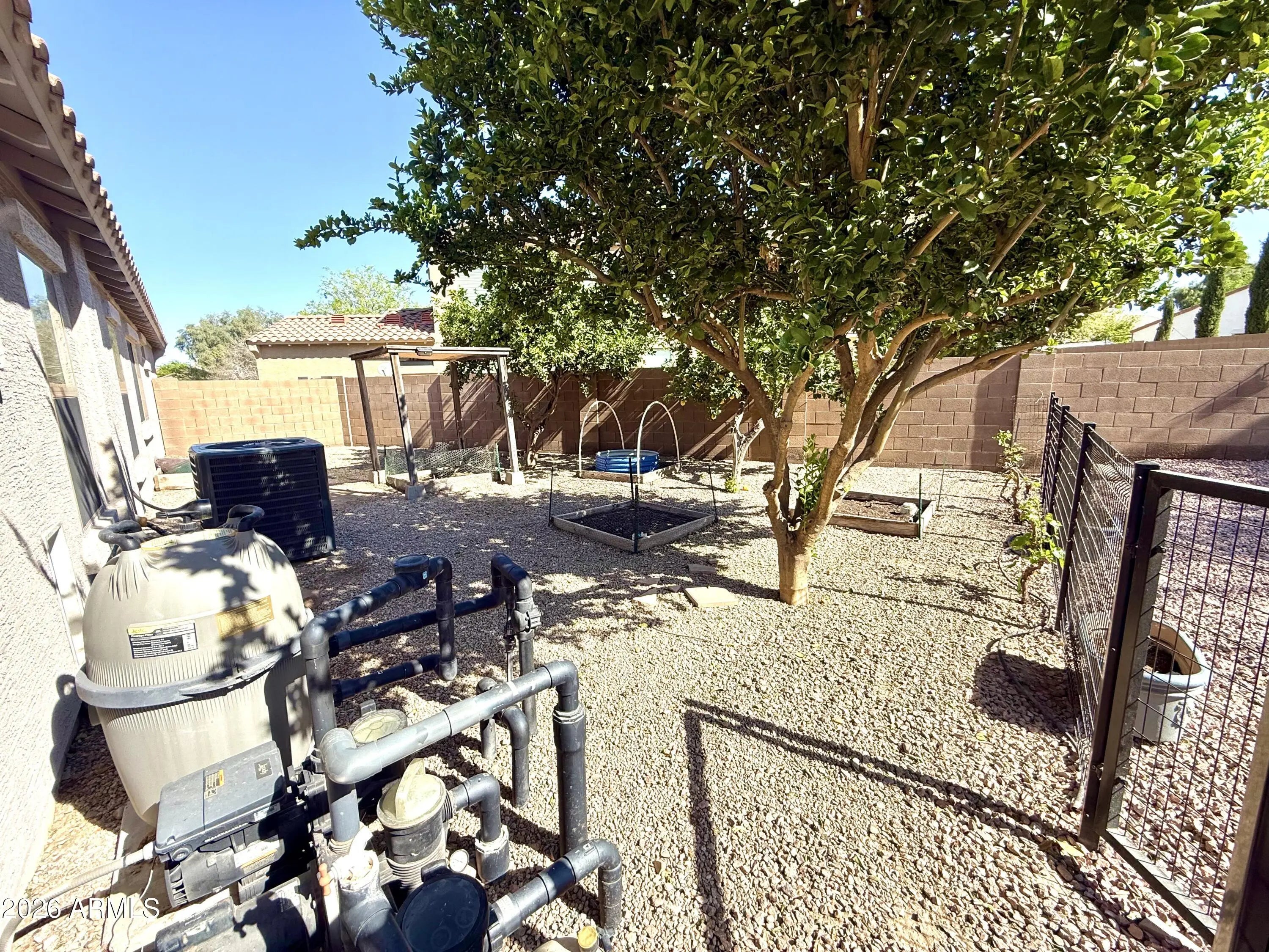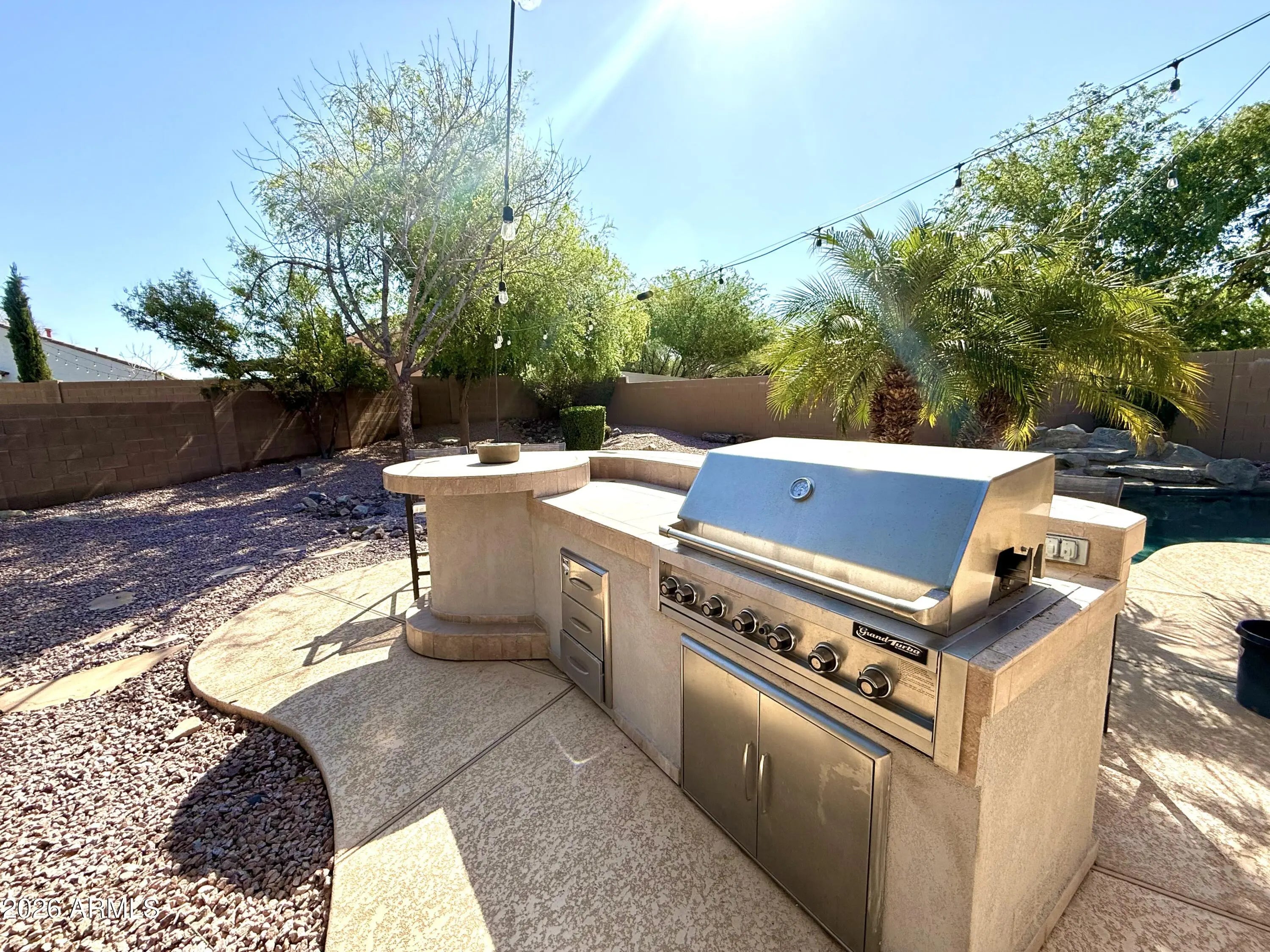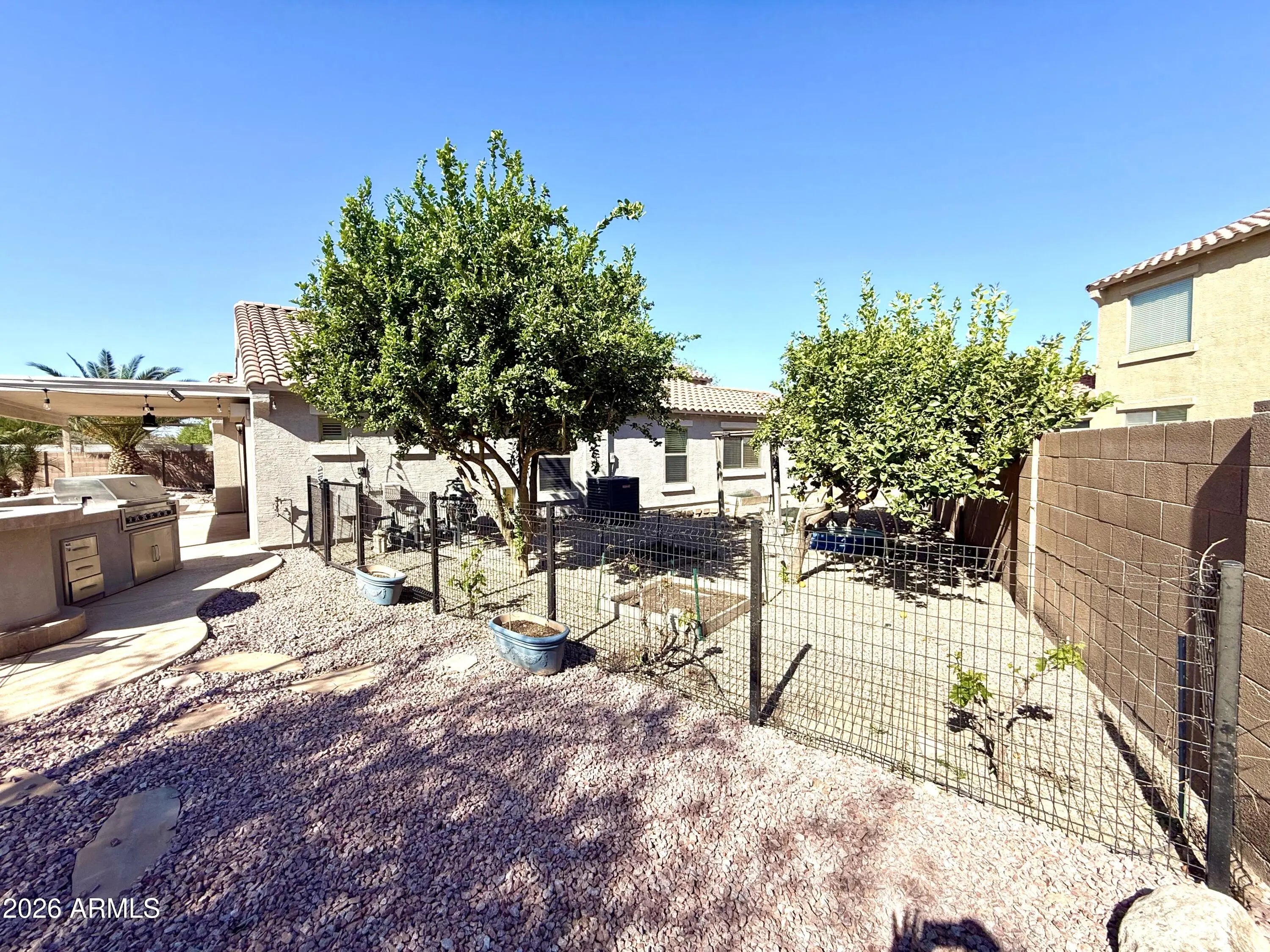 Welcome to your private desert oasis! Nestled at the end of a quiet cul-de-sac on one of the largest homesites in Pecan Creek South, this beautifully maintained property sits on nearly a quarter-acre lot and offers the perfect blend of comfort, privacy, and resort-style living. The backyard is truly designed for entertaining and relaxation, featuring a sparkling pebble-finish pool, dramatic rock waterfall, in-ground spa, and an expansive built-in BBQ area--ideal for hosting gatherings or enjoying Arizona evenings at home. Mature shade trees, citrus trees, and flourishing grape vines create a lush, tranquil outdoor retreat that feels like your own private resort. Inside, the thoughtfully designed single-level split floorplan offers three bedrooms and two bathrooms. The private primary suite is separated from the secondary bedrooms for added comfort and privacy, and features an oversized en-suite bath. Throughout the home, you'll find brand-new Berber carpet and fresh interior paint, creating a clean, move-in-ready feel. Additional upgrades include a newer AC unit to keep you comfortable for years to come and fully paid-off solar, providing significant savings on monthly utility bills. Opportunities like this are rare--large cul-de-sac lots in Pecan Creek South seldom come to market. Don't miss your chance to own this exceptional home with space, upgrades, and an entertainer's backyard.