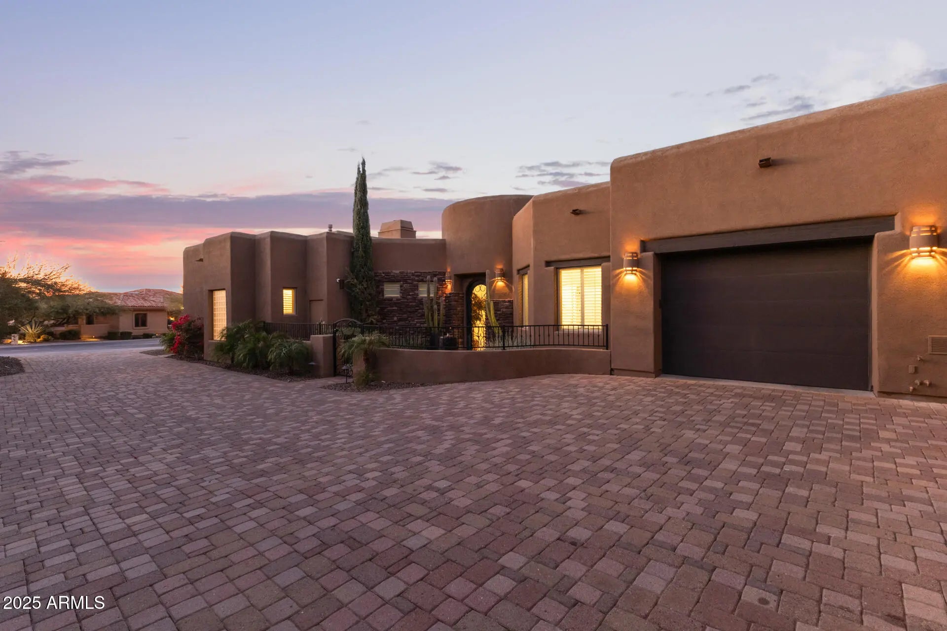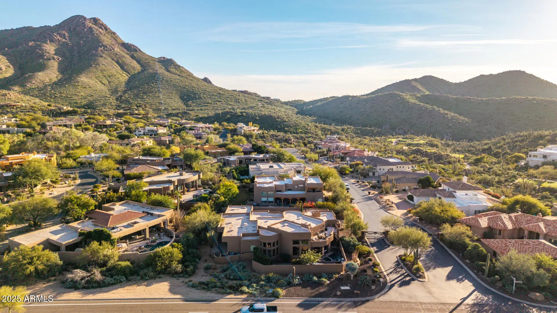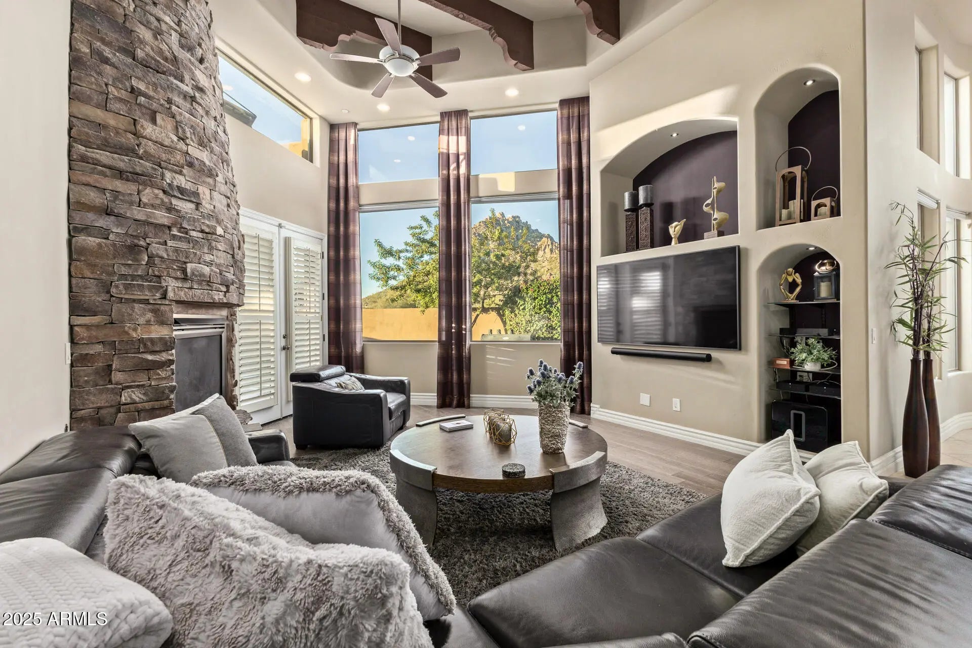 Custom 4600 sq.ft. contemporary masterpiece situated on a corner lot in Troon Ridge Estates with mountain views. Has a great room that connects the family room (with wet bar and stone fireplace's), living room, dining room and oversized gourmet kitchen with high end cabinetry throughout. Custom architectural elements including high ceilings, wood beams, large windows and multiple skylights make the unique space full of natural light. Split floor plan with 4 bedrooms, office and 3.5 bathrooms. The master suite features a sitting area, gas fireplace. Large walk-in closet with additional washer/dryer. Outdoor area has a heated pool & jacuzzi, water feature, and a spiral staircase that leads to the rooftop deck where you can take in the AMAZING views. and cozy, a spa-like bathroom with double oversized vanities and a separate shower & tub, as well as a large walk-in closet for all your belongings, with a built-in laundry area. The spacious den is perfect for an office or a creative space. The backyard hosts a covered patio ideal for unwinding after a long day, an area with travertine pavers, a built-in BBQ, a hot tub, a pool, and a beautifully manicured landscape with grass. A spiral staircase connects to the view deck, where you can sit around the fire pit with your loved ones while admiring the fantastic mountain views. This gem truly has it all! Don't miss your chance to own something truly special!
