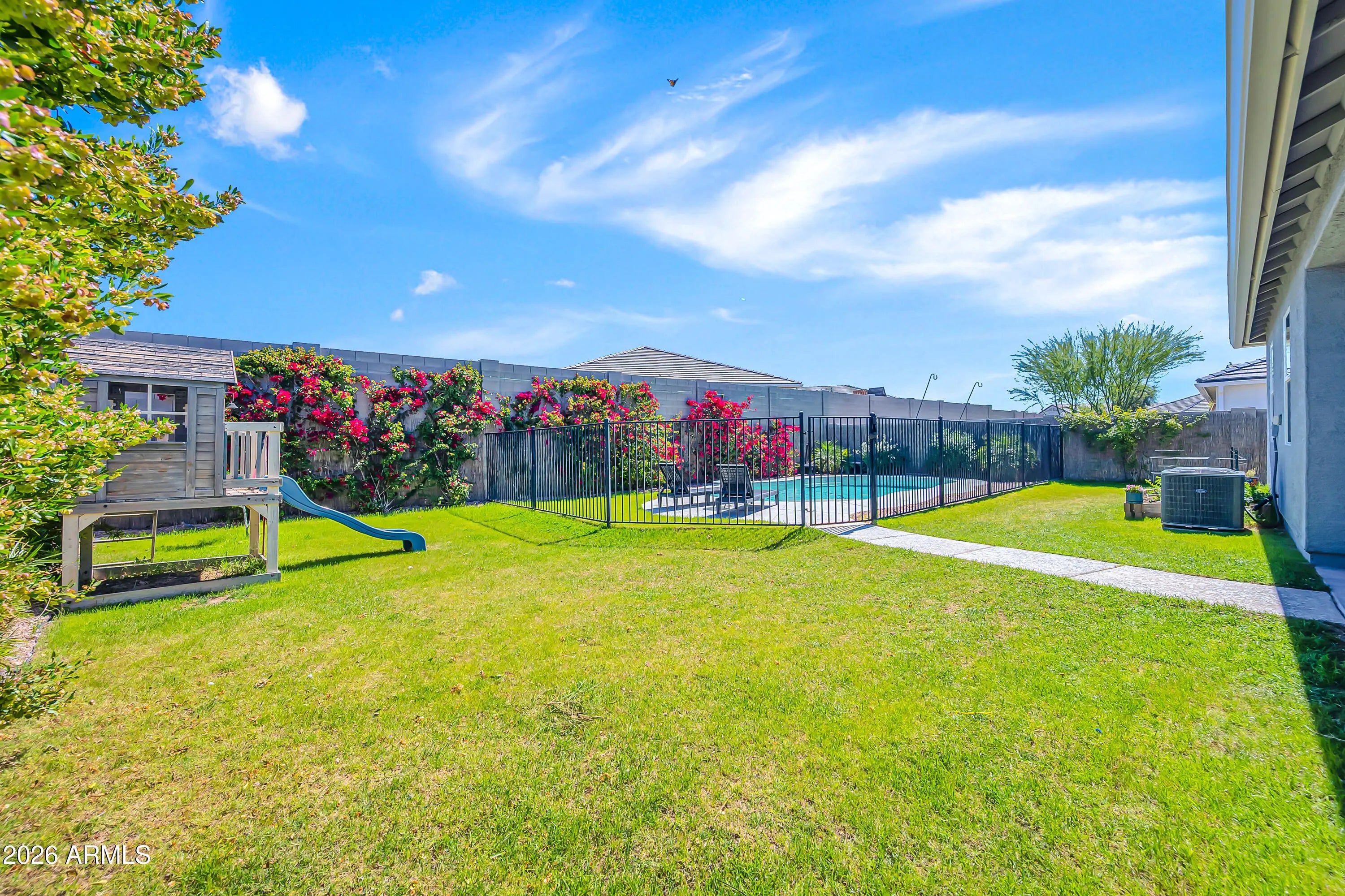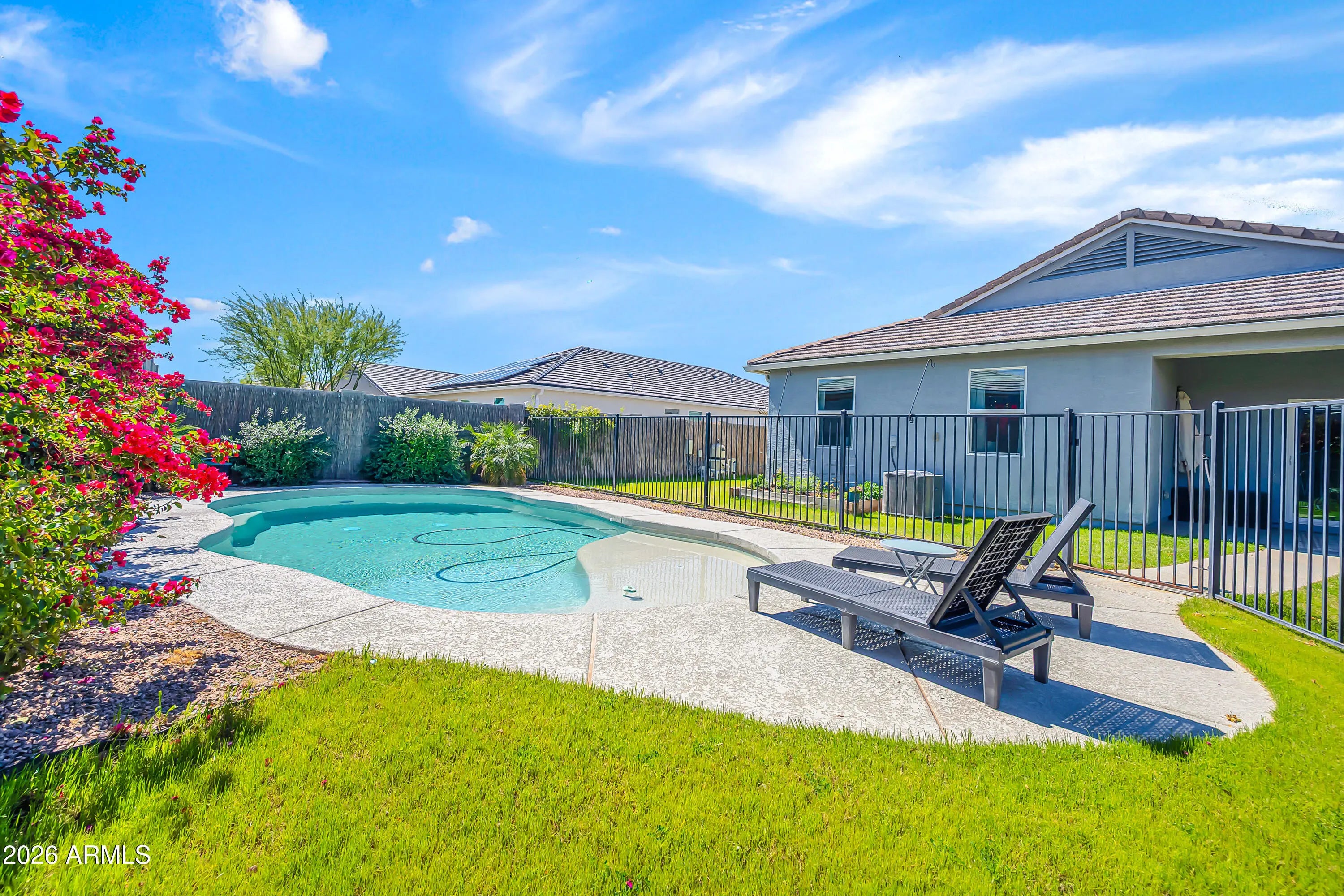 Welcome to Crestfield Manor at Arizona Farms Village! Built in 2020, this beautiful 4-bedroom, 2-bath home offers 2,227 sq ft of comfortable living space with a bright, open floor plan perfect for everyday living and entertaining. The spacious kitchen flows seamlessly into the main living area, while the primary suite provides a relaxing retreat. Step outside and experience a backyard that truly sets this home apart - better than new, featuring a stunning saltwater PebbleTec pool, lush real grass, and a thriving garden with tomatoes, a fig tree, and citrus trees. It's the perfect space for relaxing, gardening, or hosting gatherings! A wonderful opportunity to own a newer home with exceptional outdoor living in a desirable community.