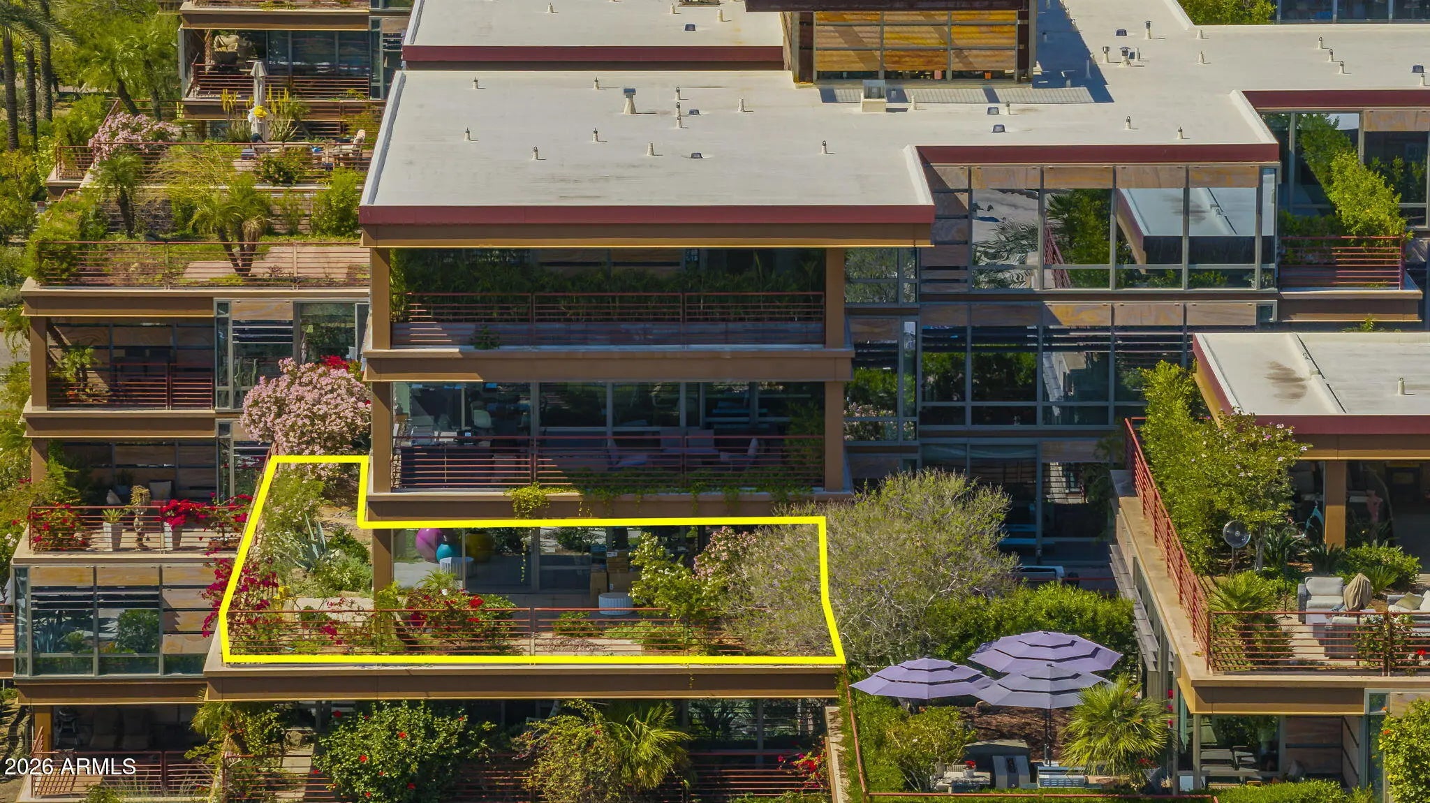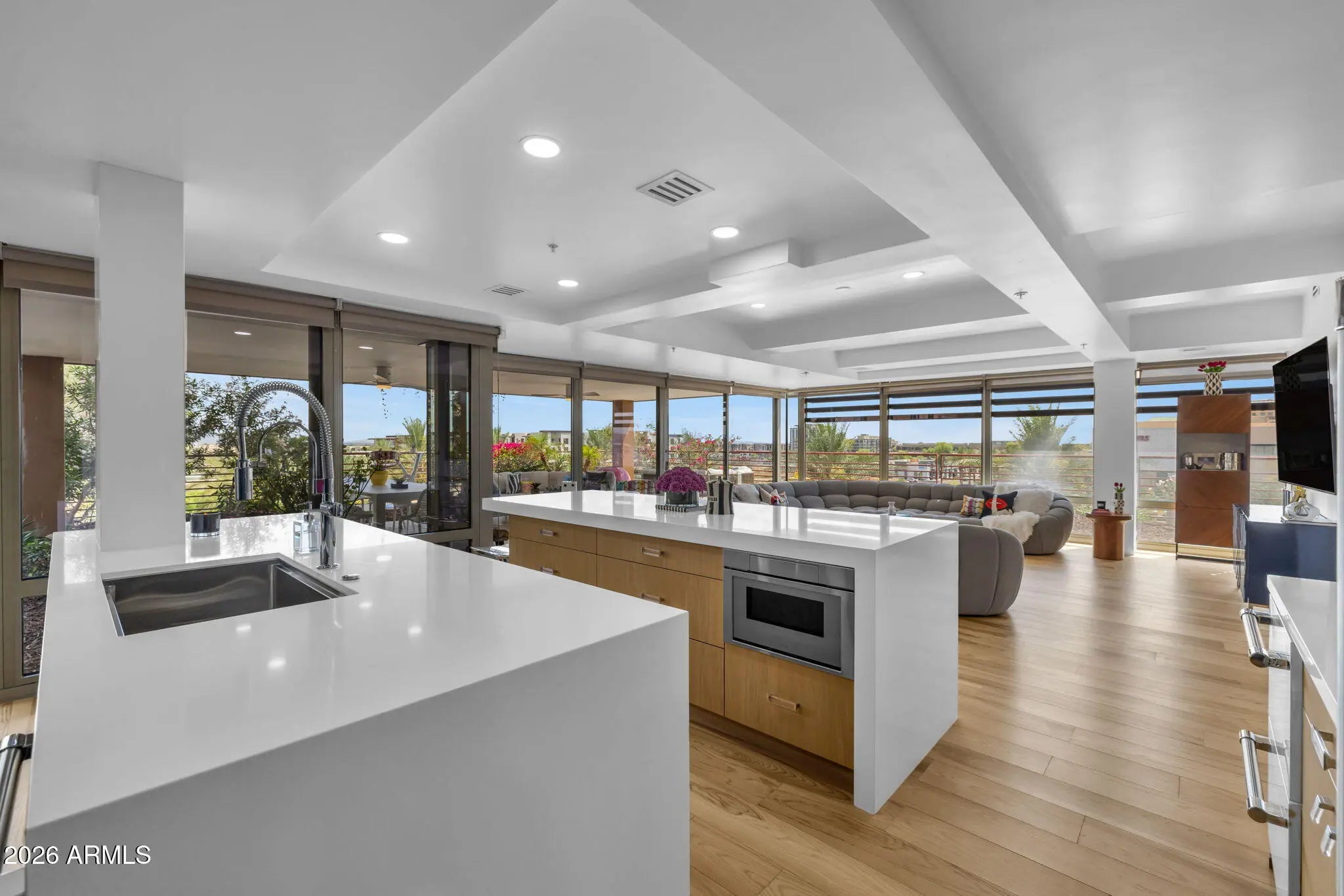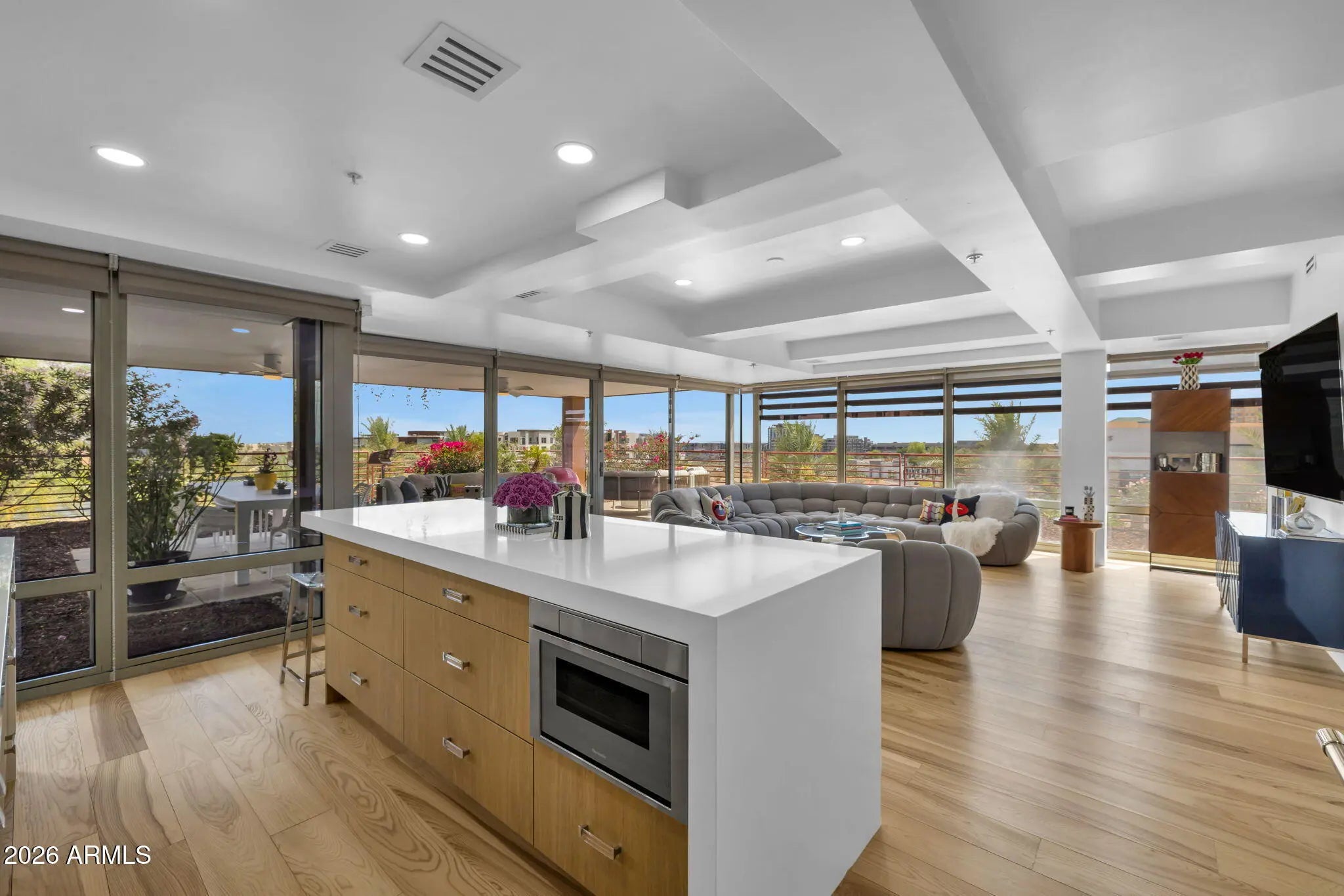 Corner unit with outdoor patio space wrapping the unit, which exceeds the indoor livable, and offers dramatic city views! Modern upscale complete renovation, including redesign of the main living space, kitchen, bathrooms and an expansive primary closet. Hardwood floors, custom cabinetry, beverage station, designer bath tile, custom doors, fixtures and lighting, creating the ultimate luxury urban residence. Camelview is the recipient of multiple international green design concept awards, including 2012 AIA National Housing Award, European Centre for Architecture 2010 International Sustainability Award, 2009 AIA The American Architecture Award, and the Crescorida 2008 Environmental Excellence Award. The innovative design has been immulated around the world. Lifestyle amenities includes 2 outdoor pools and spas, meandering green pathways, waterfalls and water features, green spaces and a world class workout facility, with an indoor lap pool and spa, fitness center yoga/aerobics room, basketball and handball courts, community clubhouse room and concierge office. This unit offers one of the most unique combinations of elevated views, expansive outdoor living and the ultimate urban lifestyle.