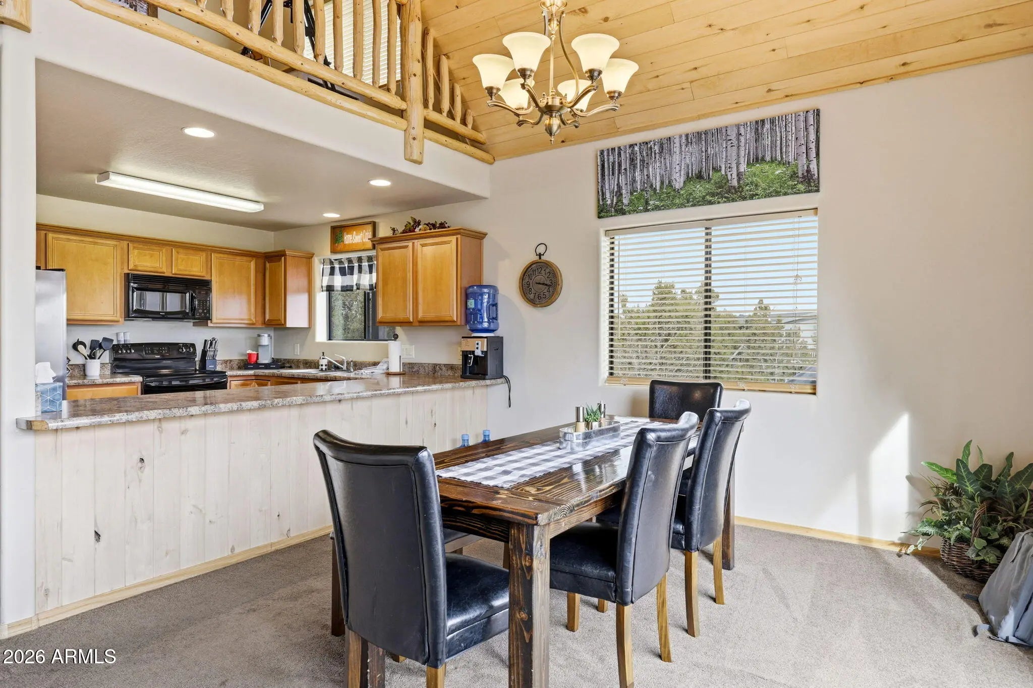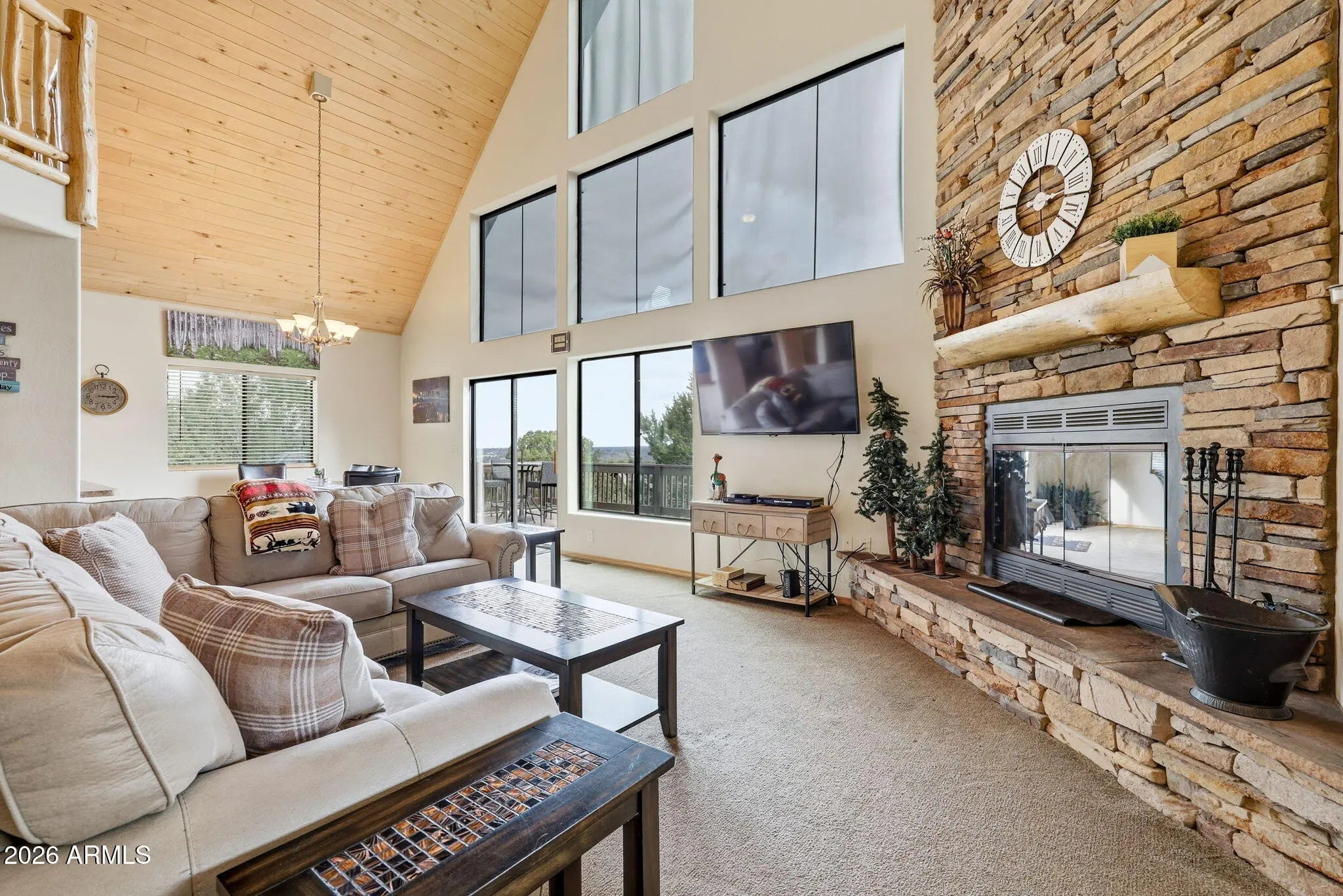 Chalet-Style Cabin Retreat - Fully Furnished & Move-In Ready- Experience true mountain charm in this beautiful 3-bedroom, 2-bath chalet-style cabin designed for comfort and unforgettable views. The open great room features a stunning floor-to-ceiling wood-burning fireplace and dramatic wall of windows that fills the space with natural light and brings the outdoors in. Upstairs, a spacious loft overlooks the great room below and captures breathtaking views through the floor-to-ceiling windows--perfect for a second living area, office, or guest retreat. Step outside to enjoy both covered and uncovered decks, where you can relax and take in the peaceful forest views. An attached 2-car garage and paved road access provide year-round convenience, and the cabin is being sold fully furnished--making it truly turnkey and ready for you to enjoy from day one. Perfect as a full-time home, weekend escape, or vacation rental in Arizona's beautiful high country.