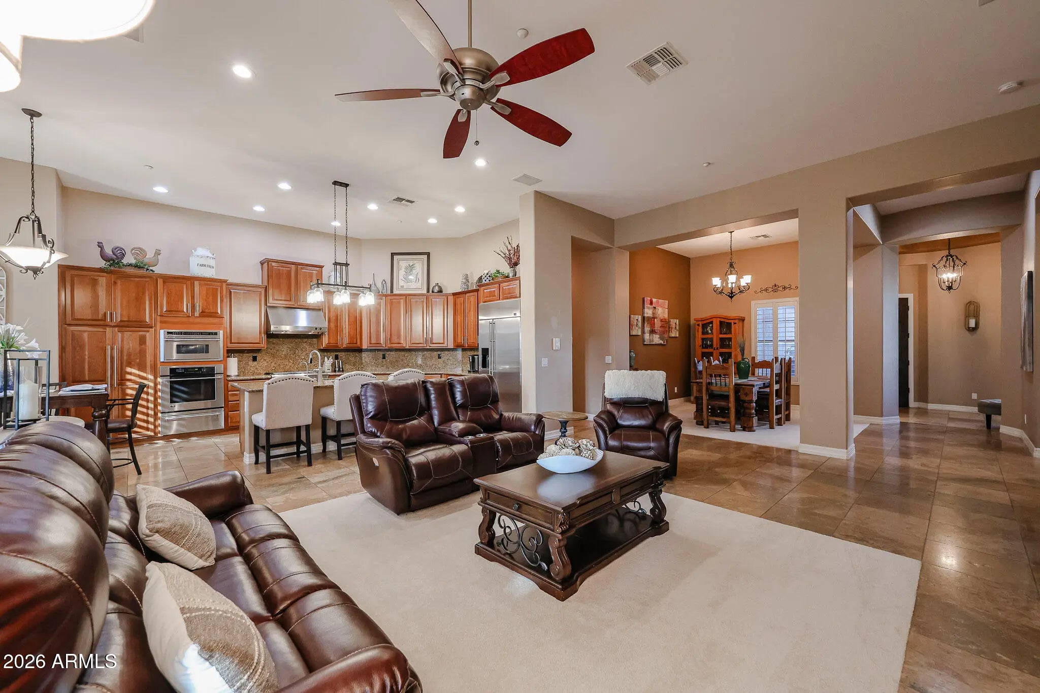 Welcome to 42114 N Alistair Way in Anthem Country Club! A popular Monterey model with resort-style outdoor living. The backyard features a sparkling pool, pavers, artificial turf and an extended pergola off the back patio with a built-in BBQ, bar, fire pit and TV-perfect for entertaining. Inside are 18'' tile floors, cherry cabinets, slab granite counters and backsplash, and GE Monogram appliances including a built-in fridge, 6-burner Chef Series gas cooktop, and warming drawer. Additional upgrades include plantation shutters, R/O, water softener, and hot water re-circulation. Flexible layout with 3 bedrooms, 2 ensuite guest rooms, a formal living/theater room with an office/optional 4th bedroom, and an extended primary suite. Extended epoxy garage with custom cabinets and overhead storage