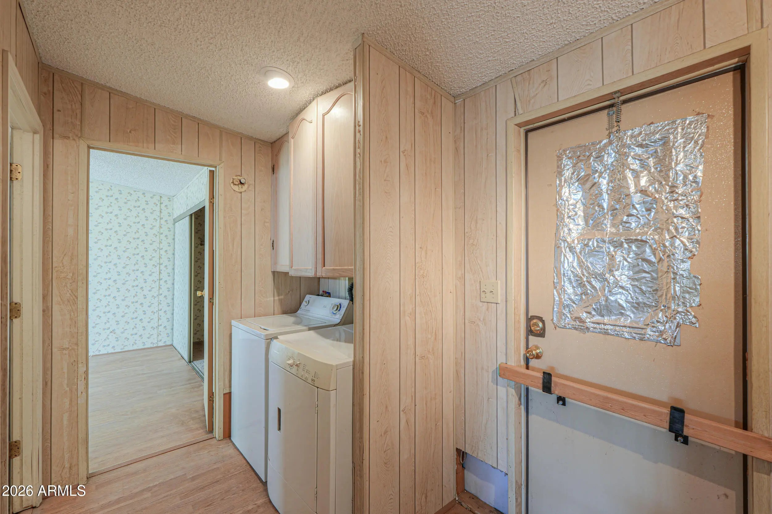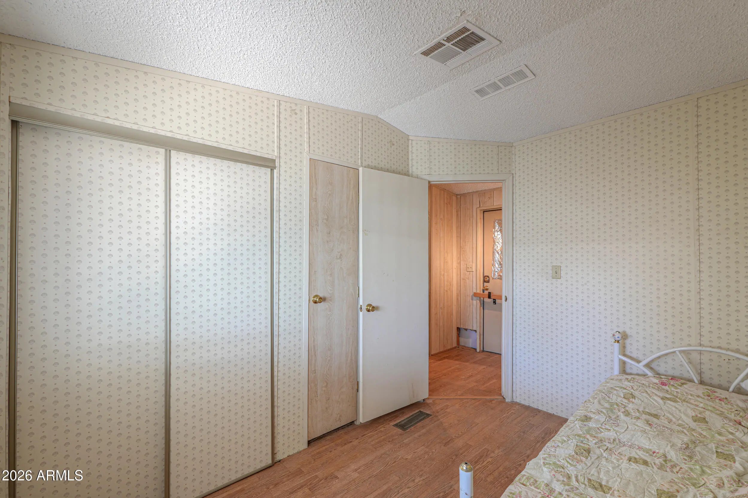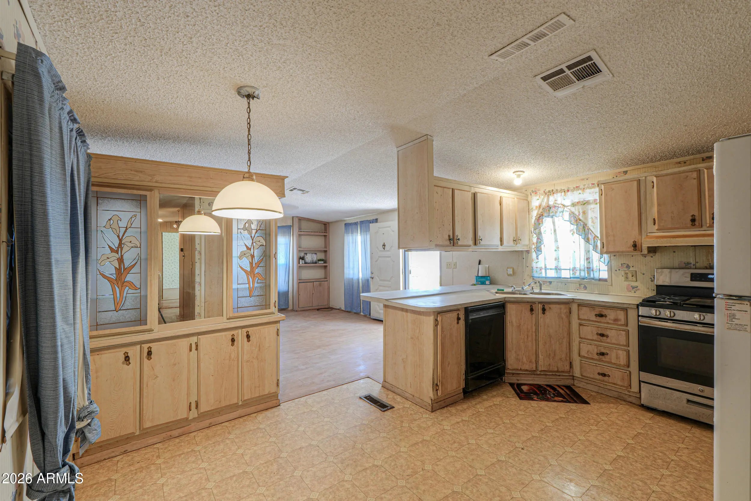 Welcome to the gated Safari Mobile Home Adult Community. Enjoy these included amenities: Community Pool & Clubhouse. This 1989 Palm Harbor single-wide manufactured home offers 2 bedrooms and one full bathroom with approximately 960 sq ft of living space. The Palm Harbor features newer exterior paint, textured and painted ceilings throughout, an updated bathroom, and updated flooring in the great room, hallway, and bedrooms. The great room includes built-in shelving plus unique built-in-storage with decorative glass. The kitchen has an eating bar, pantry, gas slide-in stove, refrigerator, and dishwasher. The electric washer and dryer are included. Additional features: full-size gas hot water heater, roof coating, attached parking, detached shed, security metal screen door & Window AC.