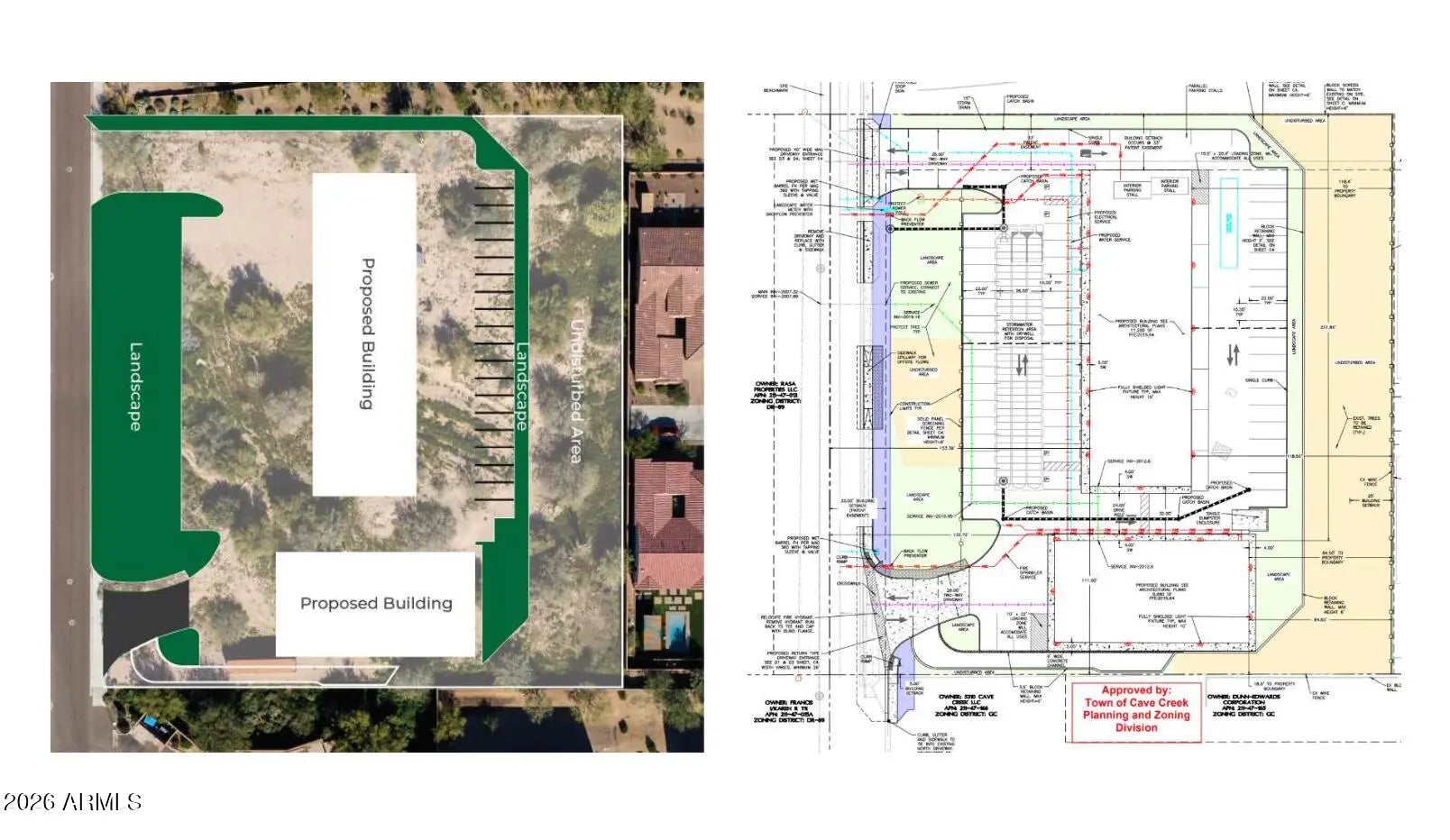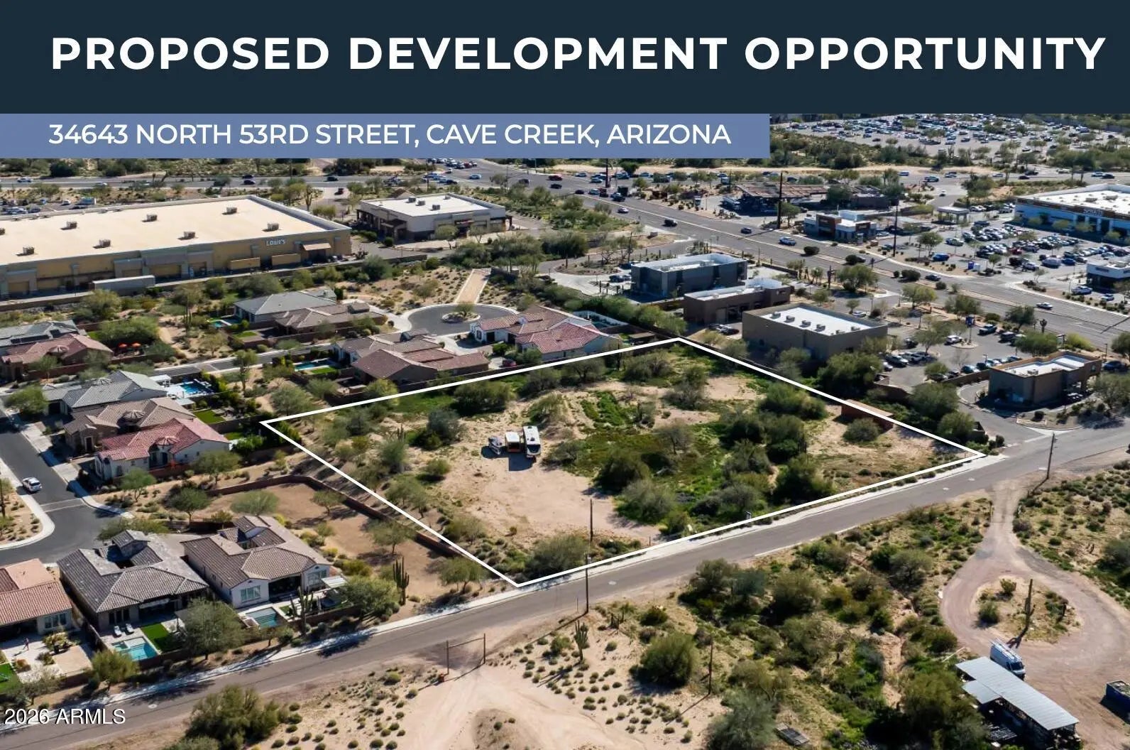 The Vickers Commercial Retail Center is an approved retail development located at 34643 North 53rd Street in Cave Creek, Arizona. The project has received Site Plan Review approval from the Town of Cave Creek under Case No. SPR-25-01 as of March 3, 2026. The approved development consists of two single-story commercial buildings totaling approximately 18,092 square feet designed for retail and service commercial tenants. The site plan includes parking areas, a relocated driveway access, retaining walls, drainage improvements, and new frontage improvements including curb, gutter, sidewalk, and a pedestrian trail connection.