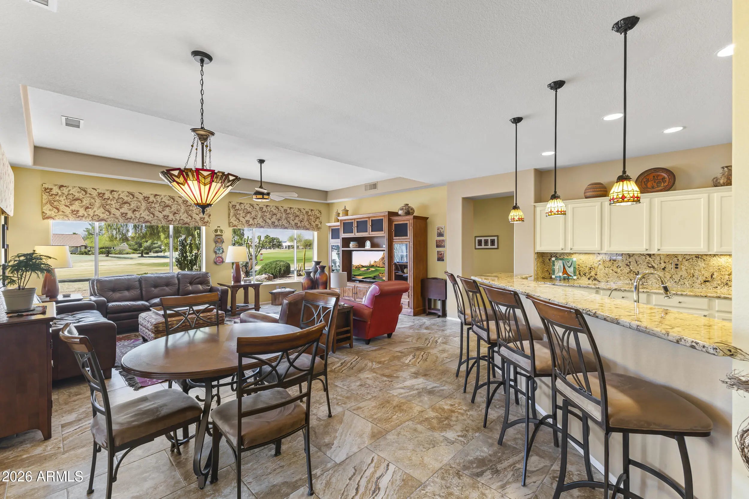 Located on the 14th hole of Deer Valley Golf Course in Sun City West, this EXPANDED Lakeside model offers 3 Bedrooms, 2 Baths, and a 2.5-car garage w/ BEAUTIFUL golf course views. The home features a pavered Driveway and Front courtyard, tile flooring in main Living areas, and carpet in the Bedrooms. The Kitchen includes GRANITE countertops, stainless steel appliances, GAS stove, Breakfast Bar, and ABUNDANT cabinetry. This SPLIT floor plan provides Two guest bedrooms and an updated Guest Bath with TILED shower and Granite vanity. The Primary suite features a TRAVERTINE walk-in shower, double Granite vanity, LARGE walk-in closet, and Private access to the PAVERED Back patio overlooking the course. The small flex room is perfect for a home office or crafts area. The Arizona room w/ three picture windows captures STUNNING Golf Course views with access to the back patio - perfect for entertaining family & friends. Additional features include 5 Power sunscreens, built-in Garage cabinets, and Major updates: Roof (2022), two high efficiency Trane units (2021), Water Heater (2020), Back patio & pergola covering (2022), and paint (2022). Welcome to this 55+ Active Adult Community with so many amenities. Golf course living at its finest. (Furniture and contents available outside of escrow).