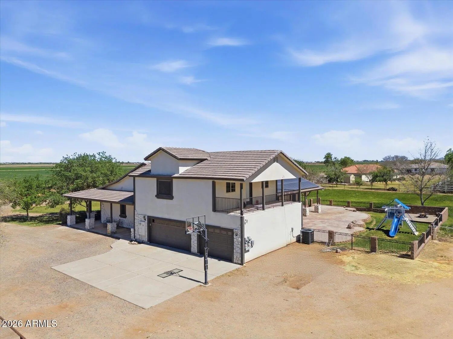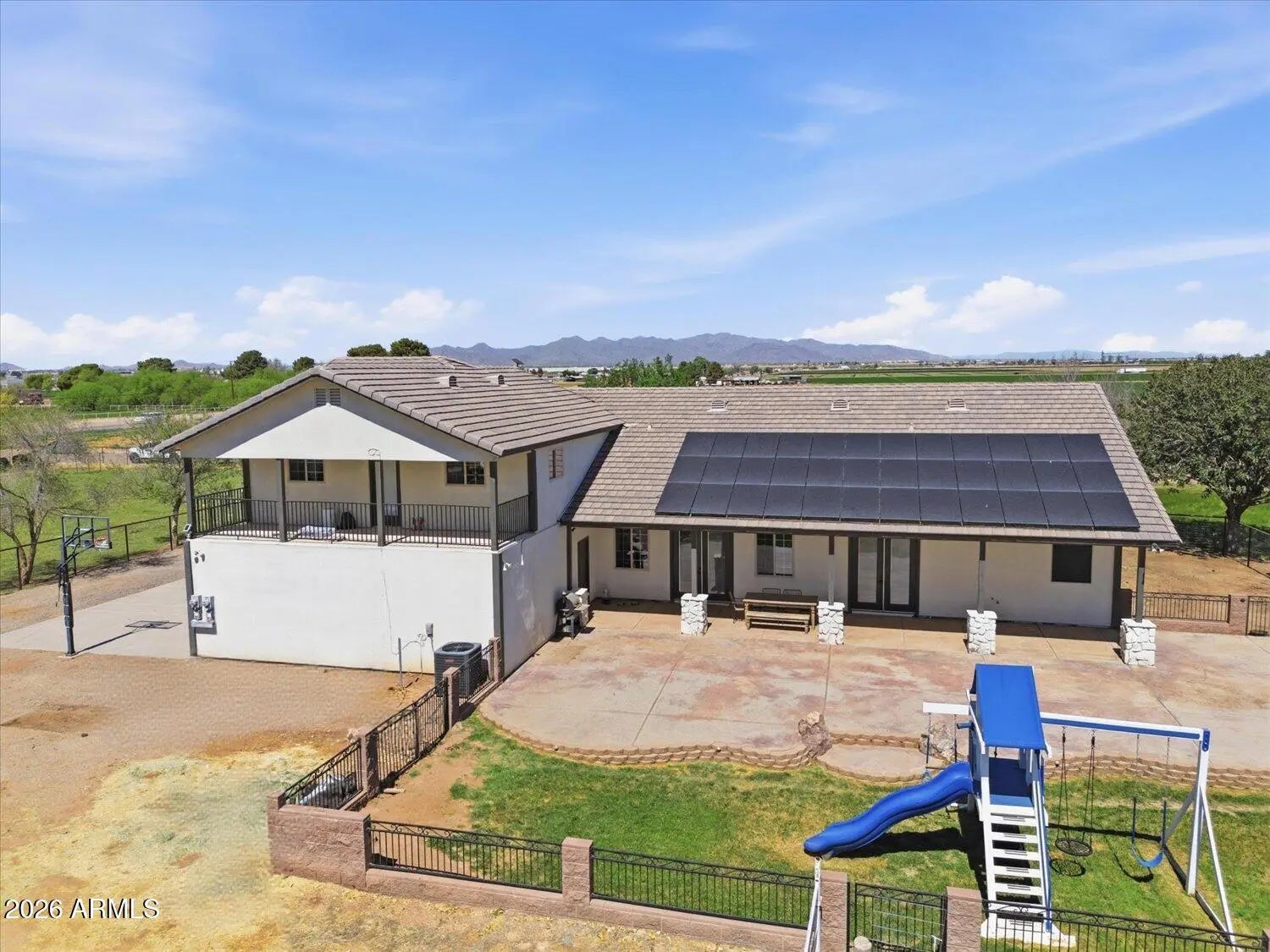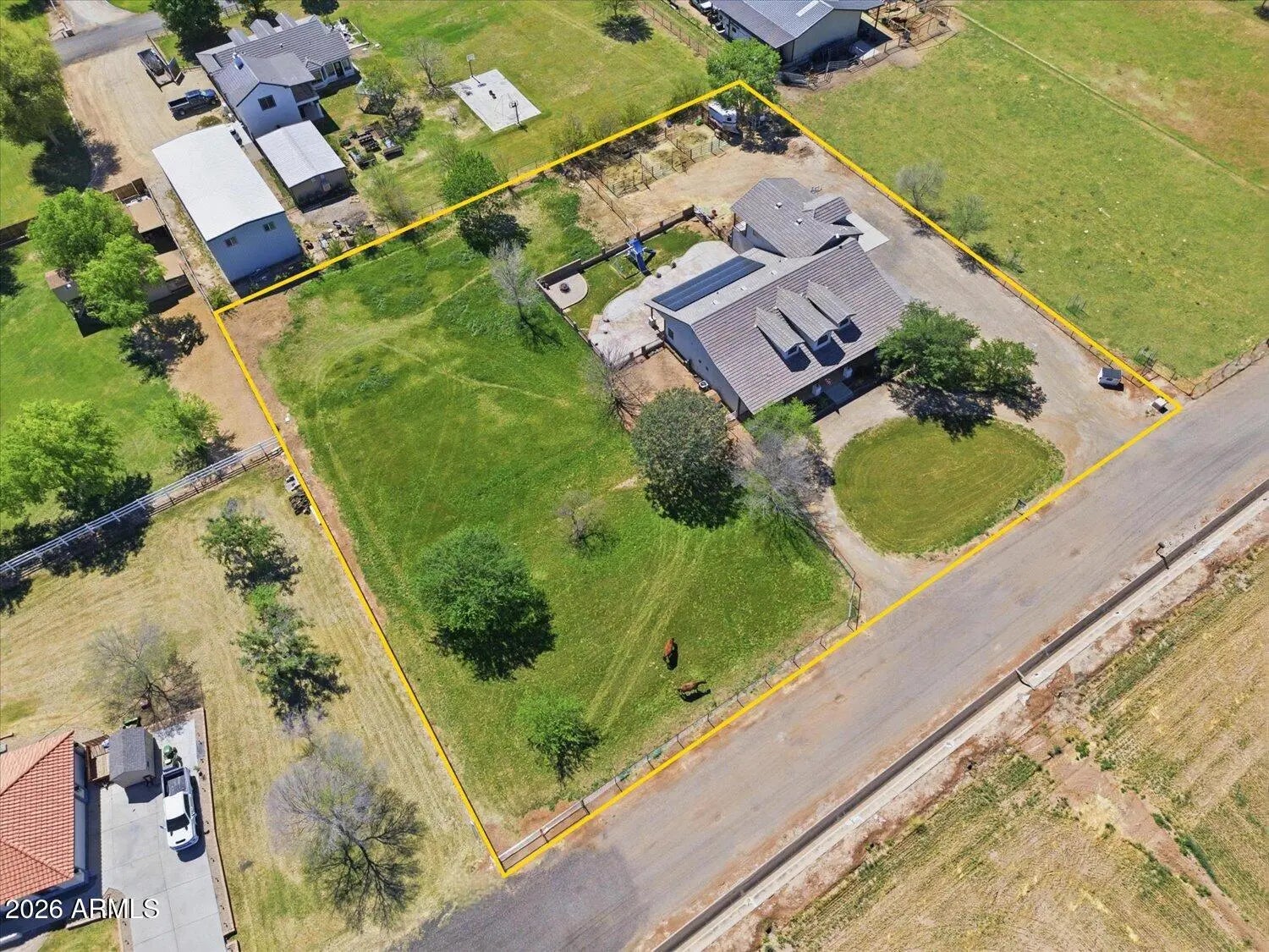 This beautifully and intentionally crafted home sits on just under 1.5 acres of fully fenced land with room for horses, RVs, pets, and toys, and includes irrigated pasture, horse corrals and a chicken coop. Offering nearly 3,700 sqft, the home features 6 bedrooms and 4 full bathrooms, including a large primary suite with private access. The gourmet kitchen with granite counters opens to a spacious great room, perfect for gathering and entertaining. Additional highlights include, solid wood doors, a grand 20' foyer entry, and 10' ceilings throughout. Upstairs offers a loft/flexible living space, and a private balcony with mountain and Arizona sunset views. The backyard features extended covered patios and seating areas, ideal for entertaining. No HOA, Horse Property and owned solar!