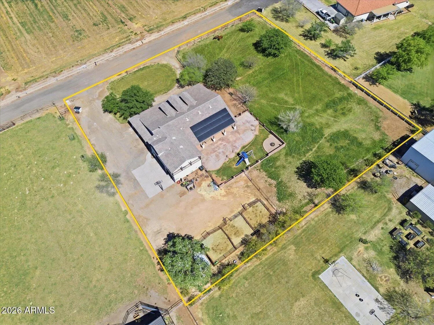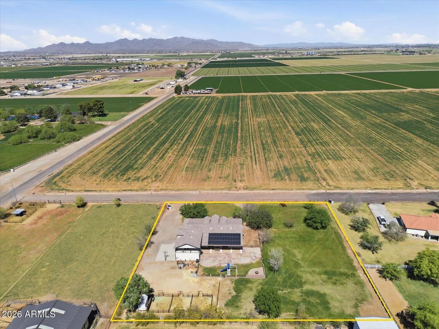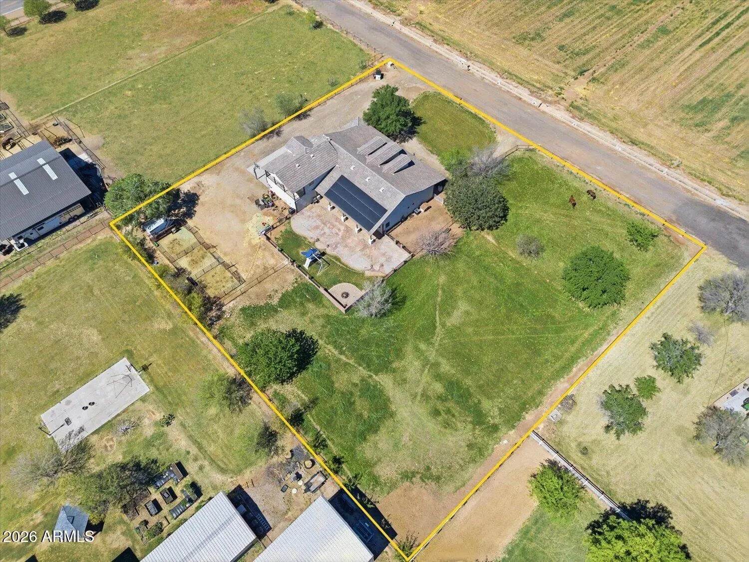 This beautifully and intentionally crafted home sits on just under 1.5 acres of fully fenced land with room for horses, RVs, pets, and toys, and includes irrigated pasture, horse corrals and a chicken coop. Offering nearly 3,700 sqft, the home features 6 bedrooms and 4 full bathrooms, including a large primary suite with private access. The gourmet kitchen with granite counters opens to a spacious great room, perfect for gathering and entertaining. Additional highlights include, solid wood doors, a grand 20' foyer entry, and 10' ceilings throughout. Upstairs offers a loft/flexible living space, and a private balcony with mountain and Arizona sunset views. The backyard features extended covered patios and seating areas, ideal for entertaining. No HOA, Horse Property and owned solar!