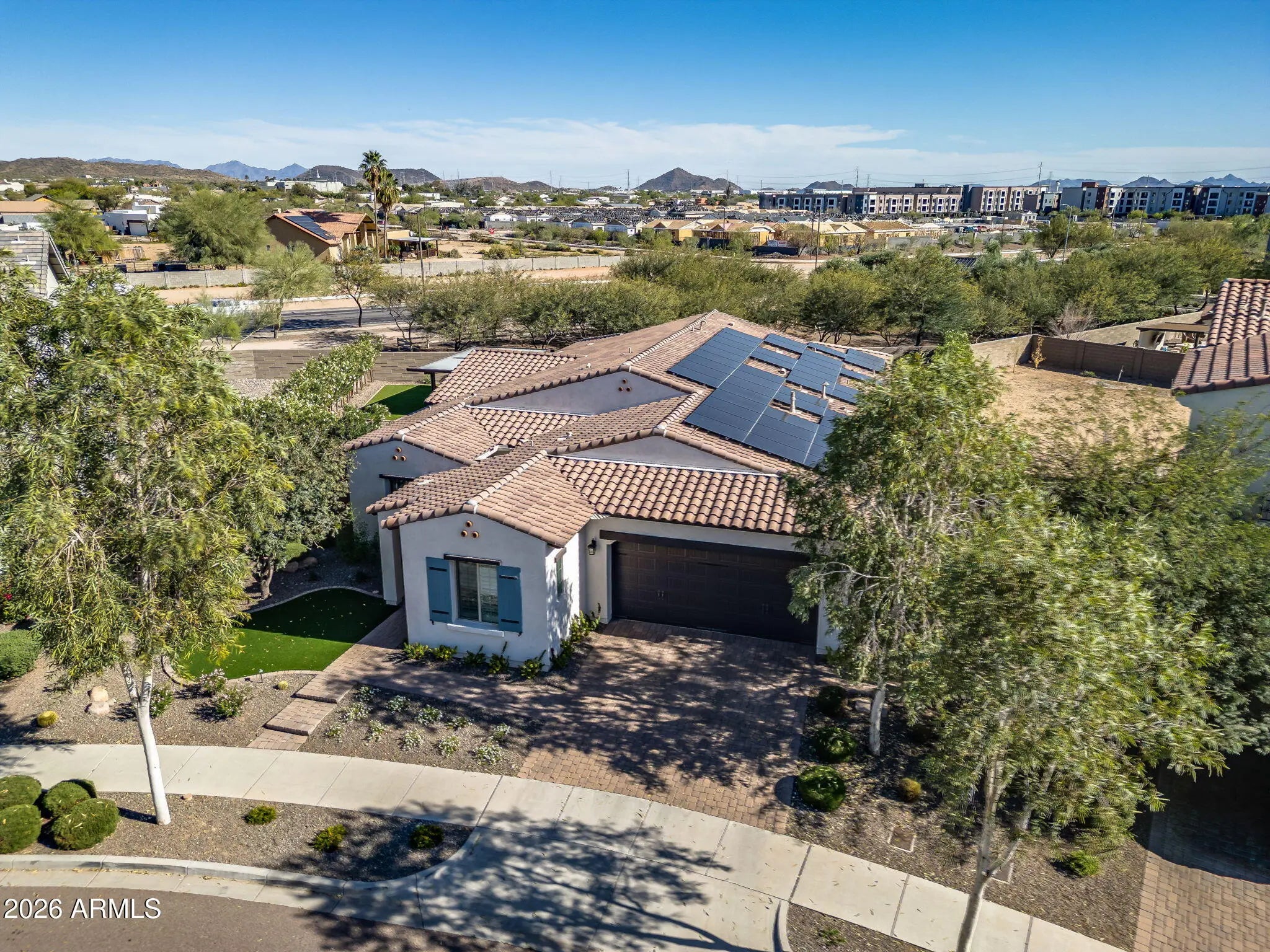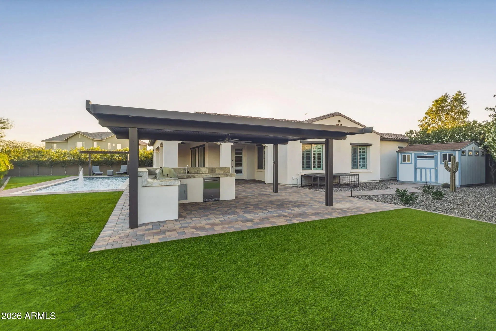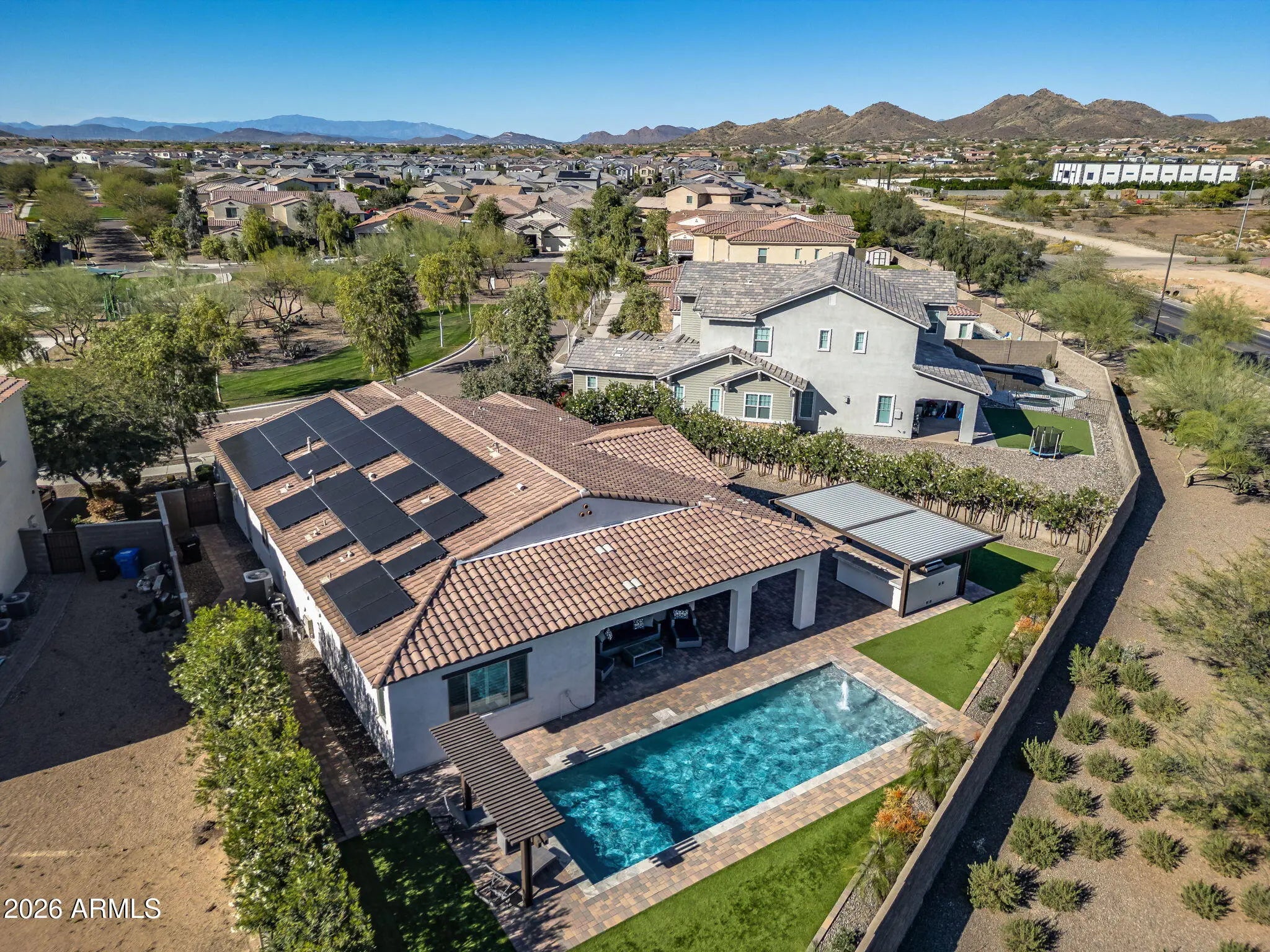 Discover exceptional desert living in this beautifully upgraded semi-custom home built by Cachet Homes, ideally positioned on a premium oversized lot in one of the community's most desirable and established areas. Located in the quieter, original phase of the neighborhood, facing a small community park and backing to open green space, this home offers added privacy and serenity while remaining close to everything that makes this area so sought after. Designed with thoughtful corner-lot articulation, the home features over 100 additional square feet of living space and an open-concept layout that seamlessly connects the great room, dining area, and kitchen while maintaining distinct spaces for everyday living and entertaining. The customized chef's kitchen is truly the heart of the home, featuring stacked cabinetry for extra storage, a 36-inch gas range, double ovens, a drawer microwave, and premium appliances, including an upgraded Sub-Zero refrigerator and Bosch dishwasher. Double islands maximizes both workspace and entertaining options, complemented by quartz and granite countertops and soft-close cabinetry throughout the home. Luxury vinyl plank flooring runs through the main living areas, with plush carpet in the bedrooms and elegant tile in the primary bath. Custom wood shutters add timeless style throughout the home, while powered blackout shades in the primary bedroom create the perfect retreat. The well-designed split floor plan offers four bedrooms and three and a half baths, providing flexibility for a variety of living arrangements. The private primary suite is separated from the rest of the home, while a secondary guest suite includes its own ensuite bath. An additional wing hosts two guest bedrooms and a full bath, plus a convenient powder room for visitors. Functionality continues with an oversized laundry room complete with extensive cabinetry, generous counter space, and a large granite sink, with room for a secondary refrigerator or additional storage. Step outside to a true backyard oasis designed for Arizona living. The expansive yard features custom pavers and turf thoughtfully arranged to maximize usability and comfort. A large, covered patio and adjacent ramada provide shaded gathering areas, while the impressive 38-by-13-foot pool features a spacious baja shelf and built-in water feature for resort-style relaxation. The outdoor kitchen is fully equipped with a built-in gas grill connected to a mainline, prep sink, under-counter refrigerator, and beautiful travertine countertops with bar seating--perfect for entertaining year-round. A custom-designed Tuff Shed blends seamlessly with the home while providing valuable additional storage. Additional upgrades add convenience and efficiency, including a 240-volt outlet in the garage ready for an EV fast charger, a fully owned oversized solar system that helps offset annual APS energy costs, and a whole-home water softener system with reverse osmosis at the kitchen sink. Combining luxury finishes, thoughtful design, and an unbeatable location in one of North Phoenix's fastest-growing areas, this exceptional home offers the perfect blend of comfort, style, and convenience. Residents enjoy access to outstanding community amenities, including scenic parks, a dog park, clubhouse, pickleball and basketball courts, and a resort-style pool complete with cabanas and Wi-Fi. Even more exciting, the community continues to grow with new restaurants currently under construction, additional shopping, and a future grocery store planned for upcoming phases. The location is truly unbeatable, with quick access to major freeways including Interstate 17, Loop 101, and Loop 303, placing you just minutes from the premier dining and shopping at Desert Ridge Marketplace, the expanding Taiwan Semiconductor Manufacturing Company campus, and everything the valley has to offer.