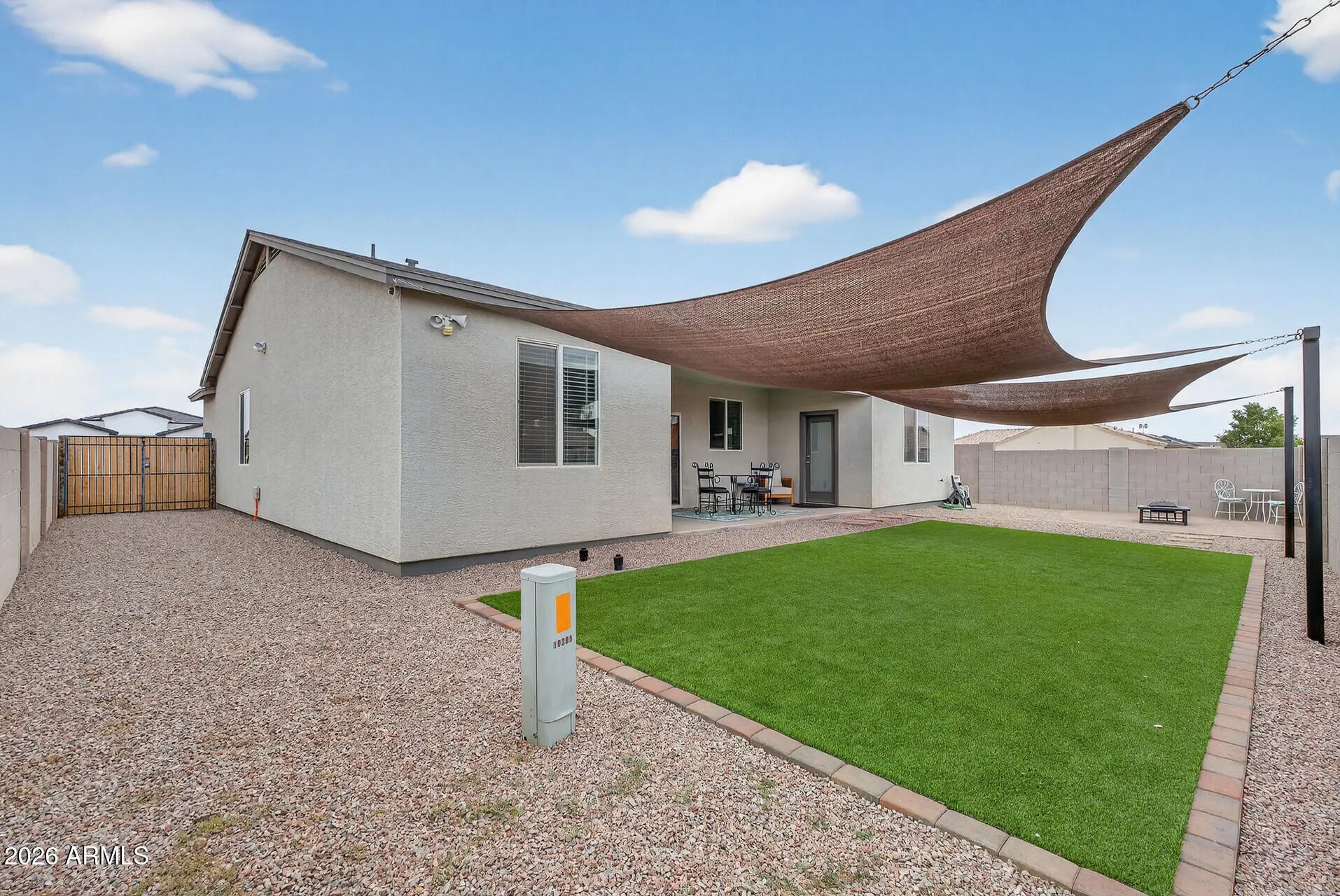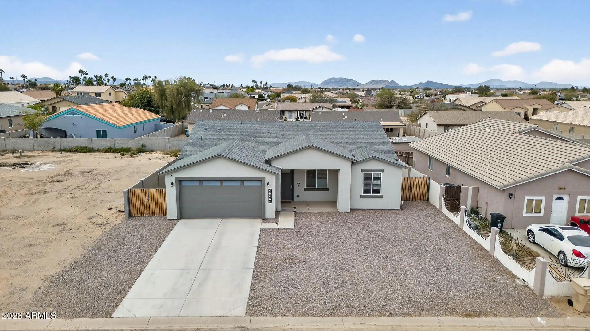 Step inside this beautifully crafted 2022 single level home and instantly feel the sense of calm that comes from thoughtful design and open, airy spaces. With 9 foot ceilings, natural light pouring in, and a layout that flows with ease, this 4 bed, 2 bath residence feels like the kind of place where life slows down just enough for you to savor it. The heart of the home is its spacious great room and modern kitchen complete with granite countertops, a generous island, and stainless steel appliances. Whether you're hosting Sunday brunch or enjoying a quiet morning coffee, this space is designed to bring people together. The split primary suite offers a peaceful retreat, featuring a beautifully tiled walk in shower, double vanity, and a roomy closet that makes everyday living feel effortless. Three additional bedrooms give you the flexibility to create a home office, guest space, or playroom. Whatever your season of life calls for. Step outside to a large 7,341 sq ft lot with complete fencing, offering privacy and room to dream. Add a garden, create an outdoor lounge, or bring in the toys, your RV gate makes it easy to store what fuels your adventures. Every detail, from the low maintenance landscaping to the modern finishes was chosen to make life simpler, warmer, and more enjoyable. And with no HOA and a peaceful Arizona City location, you get the freedom and space to truly make this home your own. This isn't just a house. It's the backdrop for birthday parties, quiet evenings on the patio, and the kind of everyday moments that become your favorite memories. Welcome home to the place where your next chapter begins.