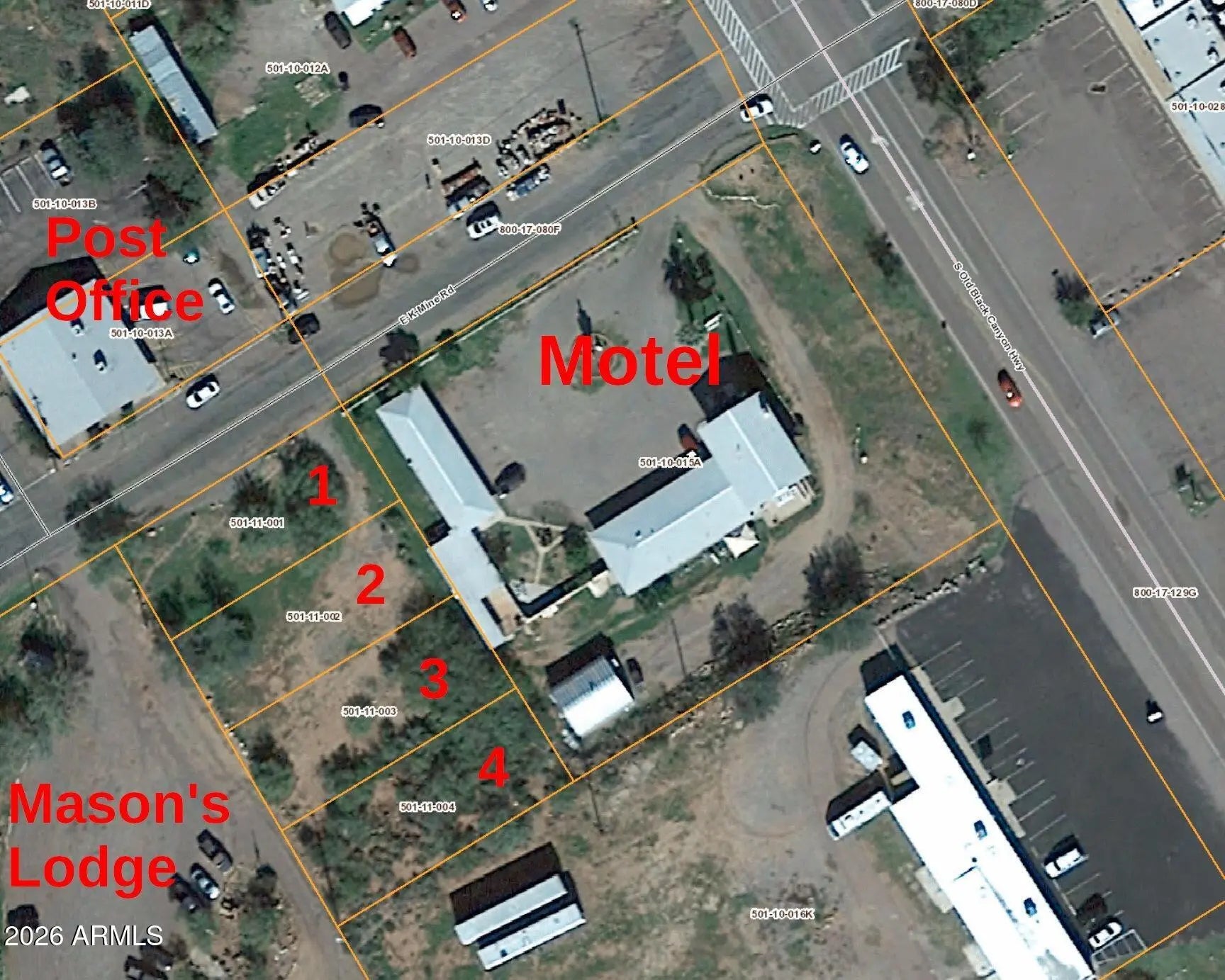 Four contiguous commercial parcels totaling 0.57 acres in the heart of Black Canyon City's commercial district! Ideally located directly across from the BCC Post Office, just off the main street and quick access to I-17. Zoned C-1 and suitable for retail, office, service businesses, multi-unit residential, RV park, single-family homes, or live/work units. Less than 30 minutes from TSMC's North Phoenix semiconductor plant, it's positioned for growth amid expanding economic activity. Ideal for investors or developers seeking immediate development or long-term appreciation. Water & natural gas available in the street. Power at the lot. Seller carry financing available