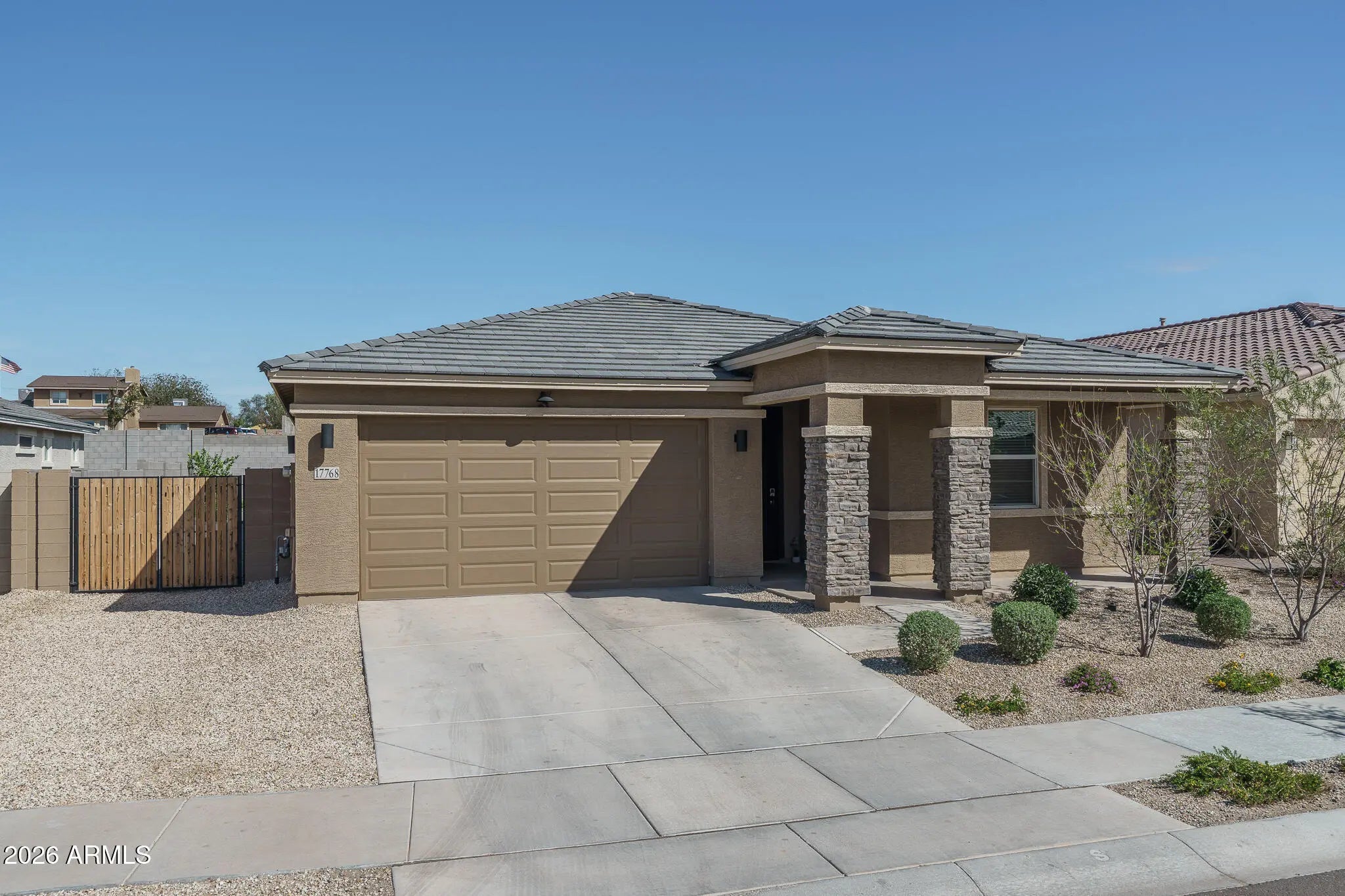 Welcome to this beautifully maintained, move-in ready home situated on a desirable north/south facing lot. Offering 4 bedrooms and 3 baths across 2,079 SqFt, this residence features an open great room design with a thoughtful split floorplan, perfect for both comfortable family living and effortless entertaining. The stylish kitchen showcases granite countertops, a subway tile backsplash, stainless steel appliances, a spacious island with breakfast bar seating, and a walk-in pantry for added convenience. Sliding doors extend the living space to a covered patio and a low-maintenance backyard complete with fruit trees lemon lime and apple, artificial turf, an extended paver patio, and a cozy firepit--ideal for relaxing evenings outdoors. The side yard includes an RV gate, additional paver patio space, and a garage side entry. The primary suite offers a peaceful retreat with a dual-sink vanity, oversized shower, and generous walk-in closet, while a secondary bedroom with its own en-suite bath provides a perfect setup for guests. Additional highlights include granite countertops in all bathrooms, neutral two-tone paint throughout, an attractive stone exterior elevation, a storage shed, and a 2-car garage.