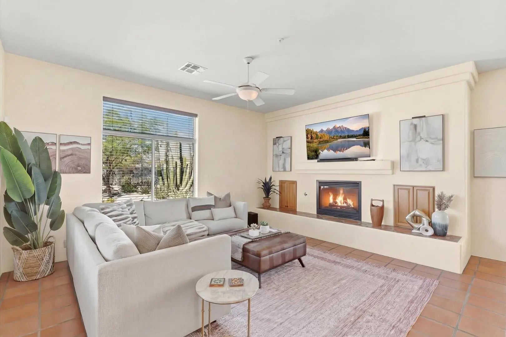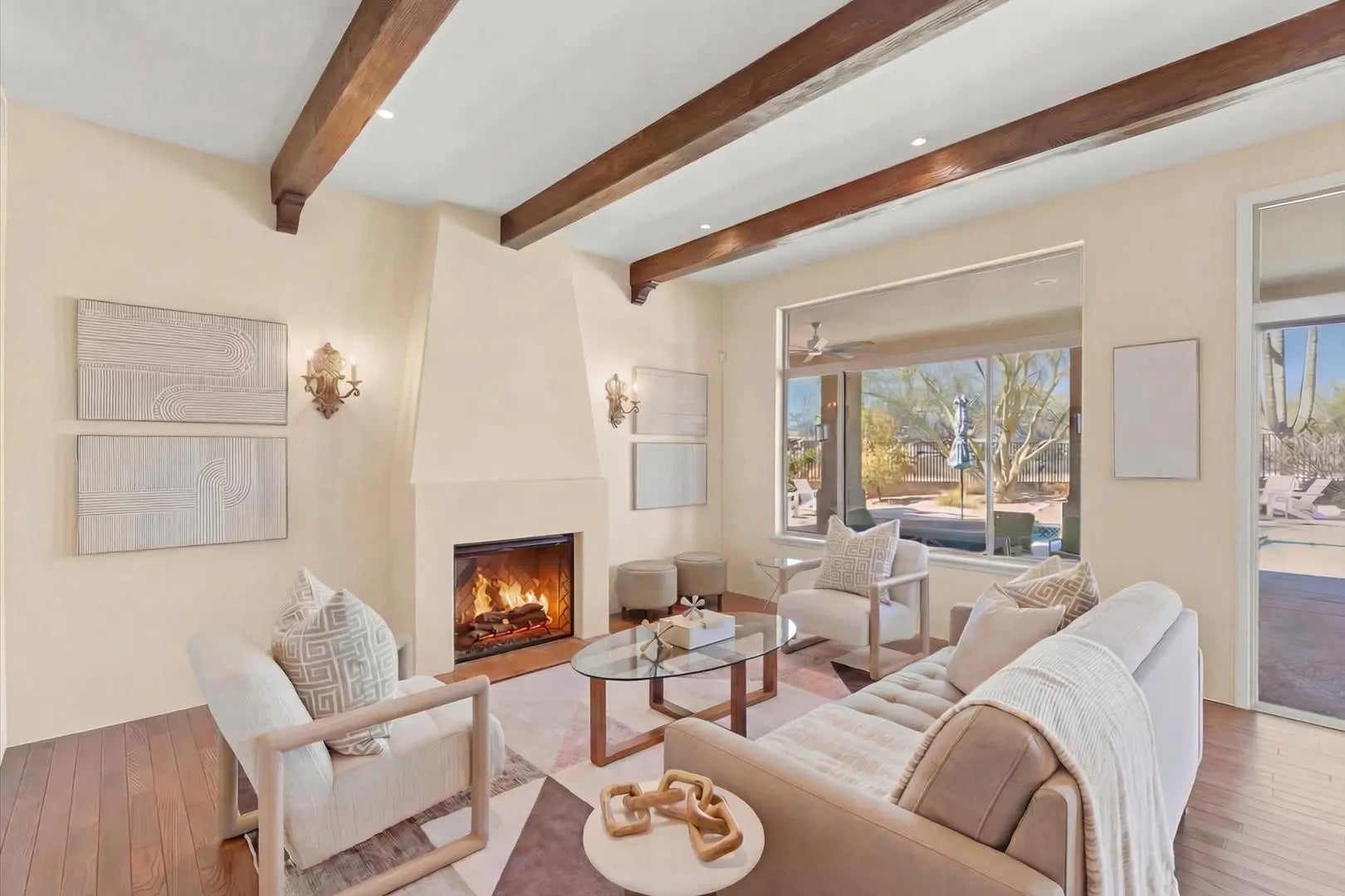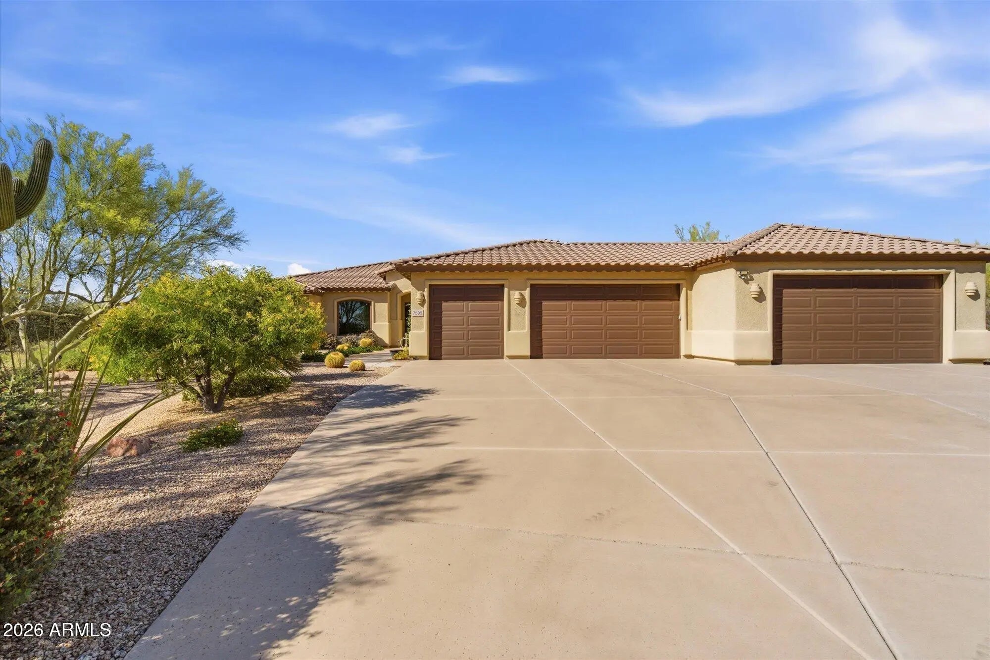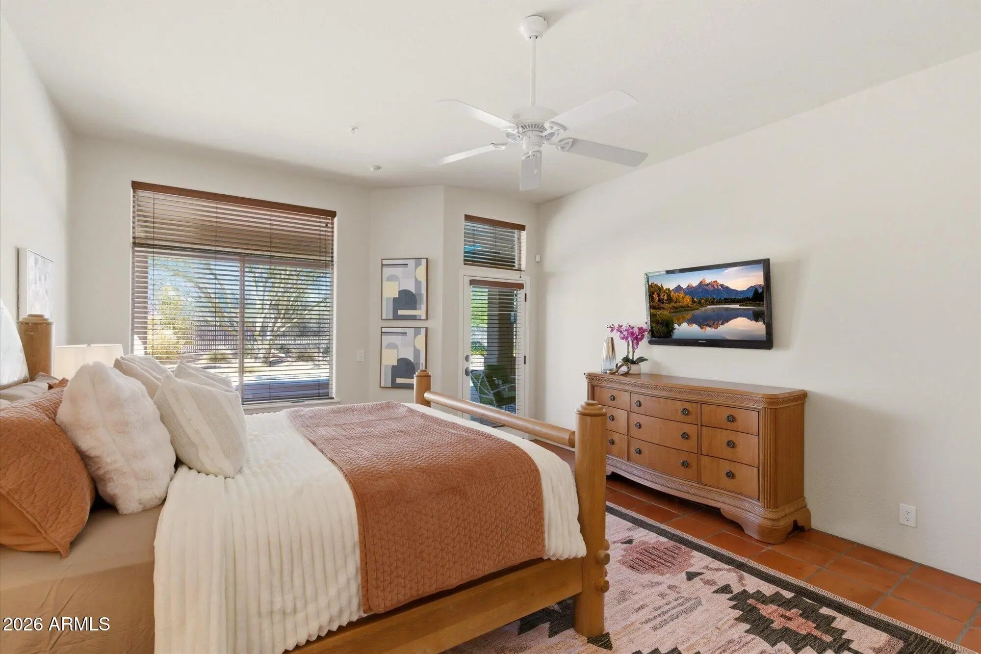 Welcome to Monterra, one of North Scottsdale's premier communities, and this beautifully updated fully furnished single-level home available for lease on a private 1.33-acre cul-de-sac lot featuring a rare 5-car garage. Offering an exceptional combination of space and privacy, this property is ideal for families, car enthusiasts, hobbyists, or anyone needing additional room for vehicles, storage, or recreational equipment. The 2,955 sq. ft. residence features a thoughtfully designed split floor plan with 4 bedrooms, a dedicated office near the front entrance, and 3 full bathrooms, providing flexibility for families, guests, or those working from home. The home showcases a warm Southwestern and Mediterranean character, highlighted by Saltillo tile flooring, solid oak hardwood floors, exposed ceiling beams, recessed lighting, updated window coverings, and remodeled bathrooms. With tile flooring throughout and no carpeting, the home offers durability and easy maintenance. At the center of the home is a spacious open-concept kitchen and family room designed for comfortable everyday living and entertaining. The kitchen blends charm with modern functionality and features granite countertops, Sub-Zero refrigerator/freezer, 5-burner gas cooktop, double wall ovens, a large granite island, and abundant cabinet storage. The space flows seamlessly into the family room with a gas fireplace, breakfast nook, TV area, and French doors opening to the covered patio and backyard. The home also includes a formal living room with gas fireplace and a formal dining room, creating multiple spaces for relaxing or hosting guests. From the dining area, enjoy serene mountain views that enhance the home's peaceful desert setting. The primary suite is spacious and private, offering room for a comfortable sitting area overlooking the backyard patio. The remodeled primary bathroom features dual sinks, custom tilework, a large walk-in shower, and a walk-in closet with built-in shelving for organization. Three additional bedrooms are located in their own private wing of the home. Two bedrooms share a Jack-and-Jill bathroom with separate sink areas, while the fourth bedroom has convenient access to another full bath, creating a functional layout for family members or guests. One of the standout features of the property is the rare 5-car garage configuration, consisting of a separate 3-car garage and a climate-controlled 2-car garage equipped with 220V power. This versatile space is ideal for car collectors, hobbyists, workshop use, a home gym, or additional storage. The resort-style backyard is designed for Arizona's indoor-outdoor lifestyle. Enjoy multiple conversation areas including a north-facing covered patio for summer shade, a gas firepit with Adirondack seating, lounge areas with umbrellas, and Kool Deck surfaces throughout. The fully remodeled heated pool and spa feature PebbleTec resurfacing, updated tile, deck jets, water features, and new pool decking, creating a private retreat perfect for relaxing or entertaining. The beautifully landscaped yard also includes view fencing for open desert views and snake-proof perimeter fencing for added peace of mind. Additional features include an owned 7kW solar system for lower electric bills and energy efficiency, updated HVAC systems, whole-house water softener, central vacuum system, and recently refreshed exterior paint. With over an acre of land, extensive garage capacity, resort-style outdoor living, and a quiet private setting, this meticulously maintained home offers a rare rental opportunity in North Scottsdale for tenants seeking both comfort and functionality. MINIMUM RENTAL PERIOD IS 6 months.