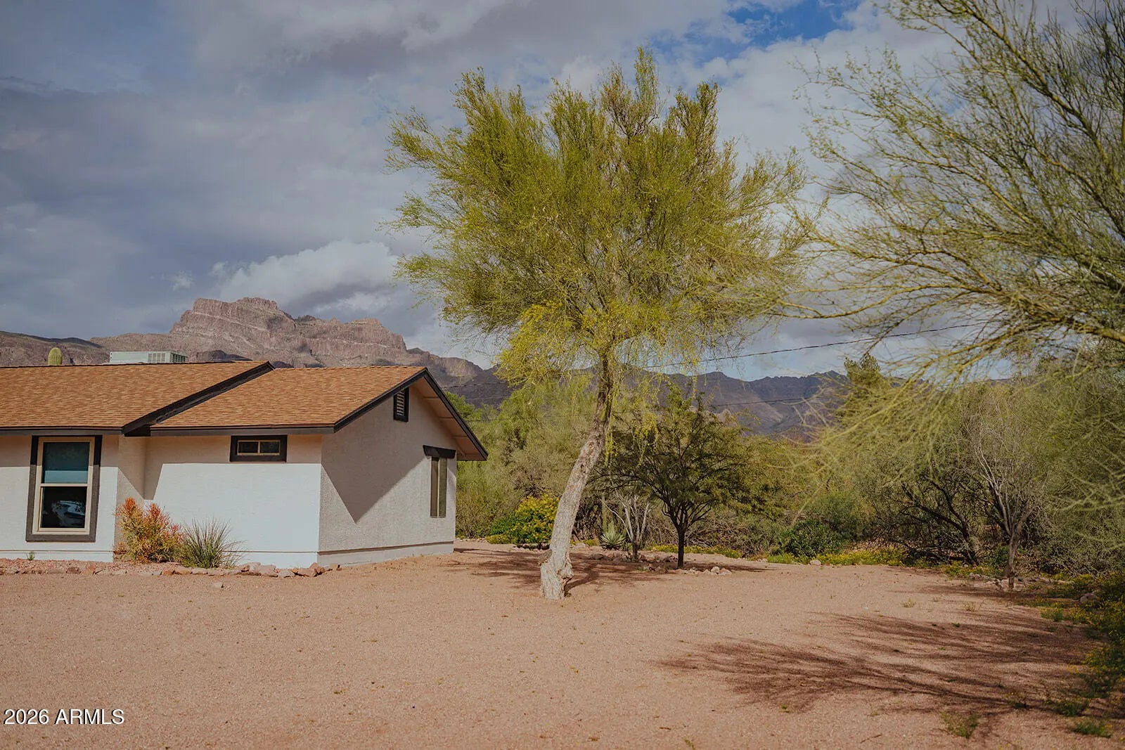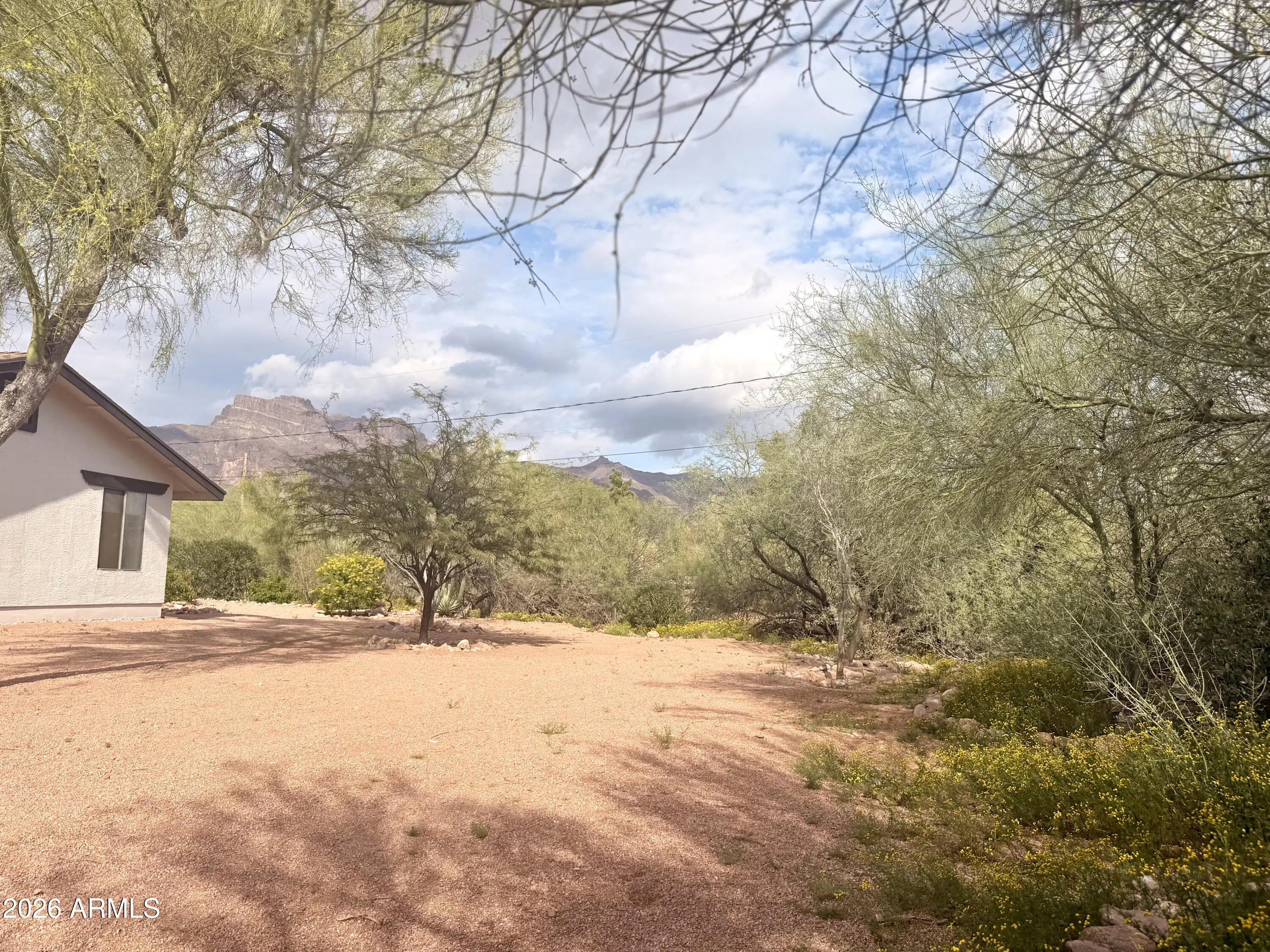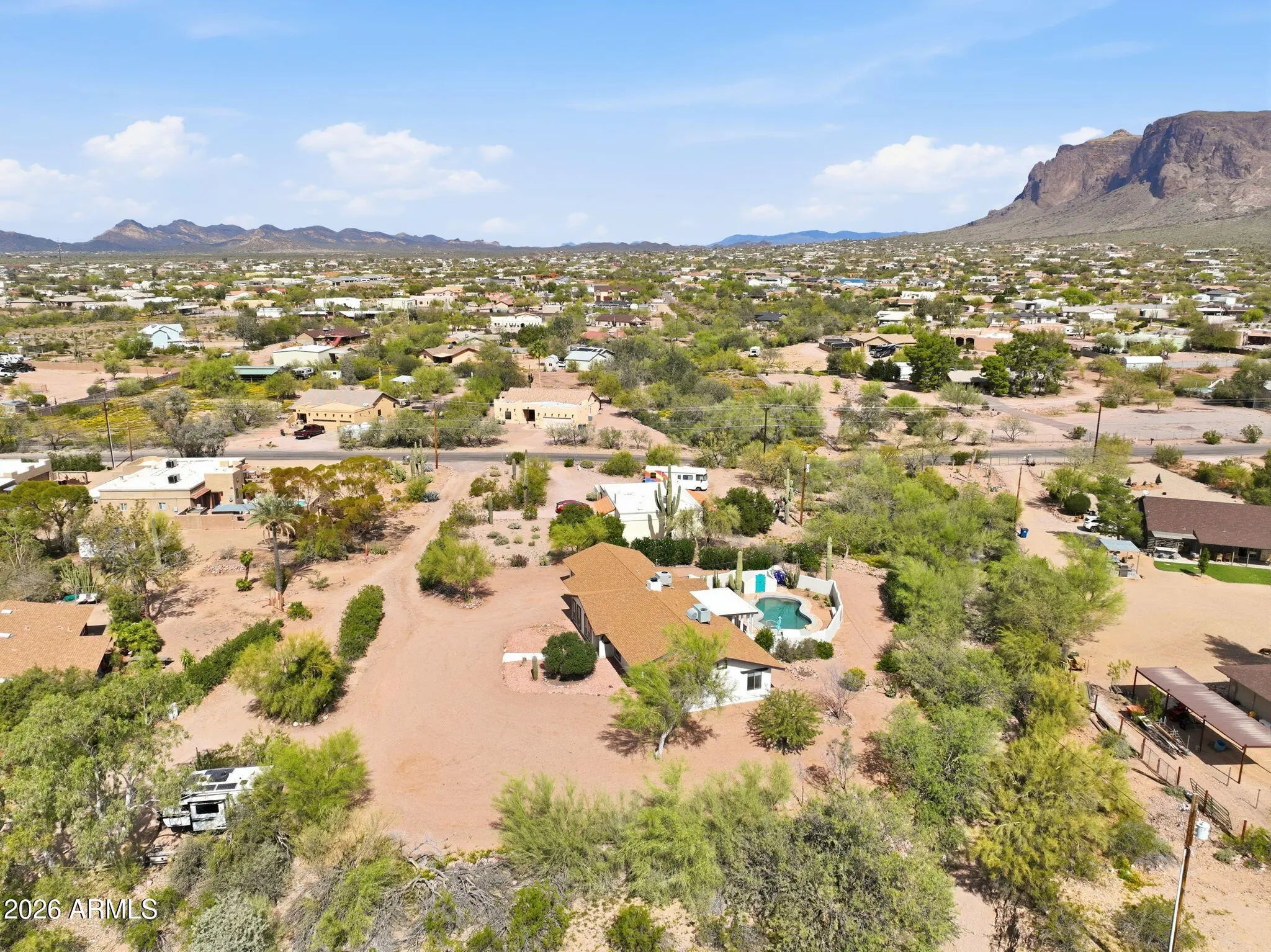 JOIN US FOR A PROPERTY SHOWCASE THIS SATURDAY 3/14 FROM 10AM TO 2PM. Your clients won't need to look any further. This home is filled with Southwest charm and is privately situated near the base of the Superstition Mountains, offering the iconic Flat Iron backdrop everyone is searching for. From the moment you arrive, you'll be captivated by the breathtaking mountain views and the peaceful setting of this quiet, no-HOA neighborhood. There is also plenty of room to add a casita or additional garage, making this property even more versatile. Inside, the home showcases tile flooring throughout and a spacious layout designed for comfort and entertaining. The expansive living room provides ample space for gatherings and features a striking two-way beehive fireplace that beautifully connects the living areas. Quality dual-pane windows, tile accents, and updated shades add both style and efficiency throughout the home. The kitchen is beautifully appointed with white cabinetry, upgraded fixtures, and an enormous pantry that offers exceptional storage. The primary suite serves as a peaceful retreat, featuring stunning Superstition Mountain views, a private exit to the backyard, and an oversized walk-in closet. The remodeled ensuite bathroom includes a stylishly tiled walk-in shower and dual sinks. Guest bedrooms offer their own decorative charm with updated paint colors and custom-made barn doors that add character and warmth. Step outside to your resort-style backyard, where a sparkling PebbleTec saltwater pool, charming outdoor shower, and beautiful desert landscaping create a private oasis surrounded by incredible mountain views. Car enthusiasts and outdoor adventurers will appreciate the huge oversized garages, large enough to accommodate your boat or large vehicles, including a taller garage door for trucks or recreational equipment. With a home like this, every day feels like a vacation. Come experience the views, privacy, and charm for yourself--this is truly a must-see home.
