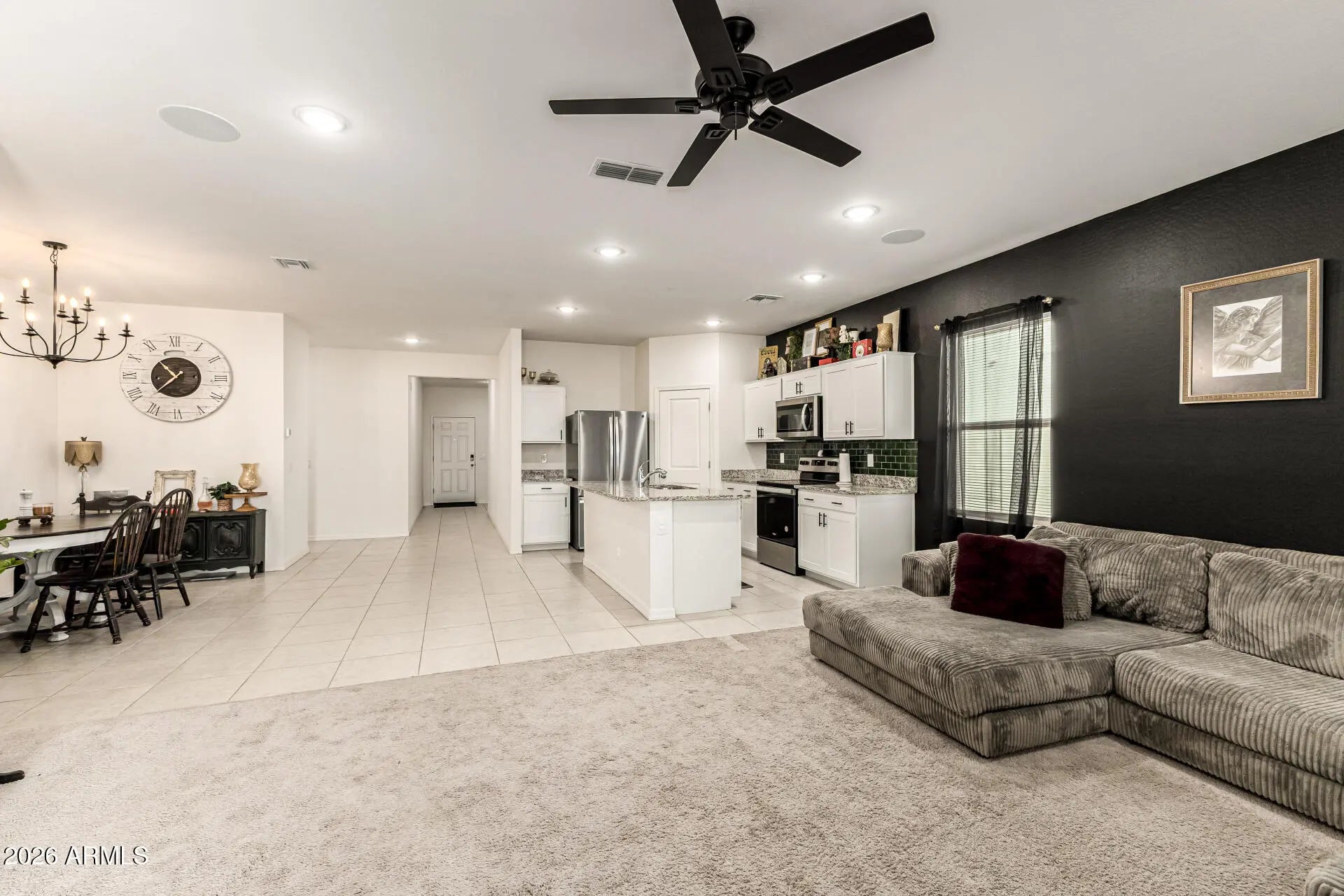 Move-in ready with designer finishes and mountain views! This beautifully upgraded home sits on a spacious lot and features white shaker cabinetry, granite countertops, stainless steel appliances, and soaring 9' ceilings that create a bright, open feel. The owner's suite offers a generous walk-in closet, providing plenty of storage and a comfortable private retreat. Energy-efficient features include dual-pane windows, WiFi programmable thermostats, and insulated garage doors for year-round comfort. The home is pre-wired for surround sound, making it perfect for entertaining or relaxing with your favorite music or movies. Step outside to enjoy Arizona living with a charming front porch, covered patio, and landscaped front yard. The neighborhood offers multiple parks, playgrounds, p areas, and greenbelts, all surrounded by beautiful mountain views. Conveniently located near Hwy 347 and I-10, you're just minutes from Fry's, Walmart, CVS, shopping, dining, and highly rated schools. No rear neighbors!