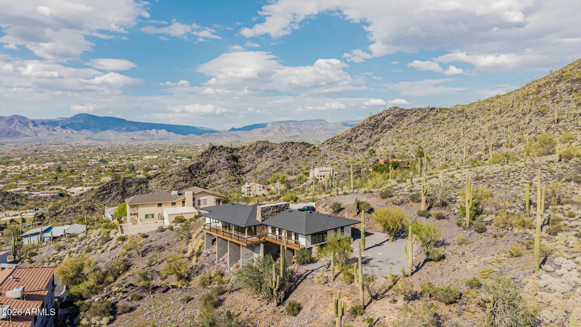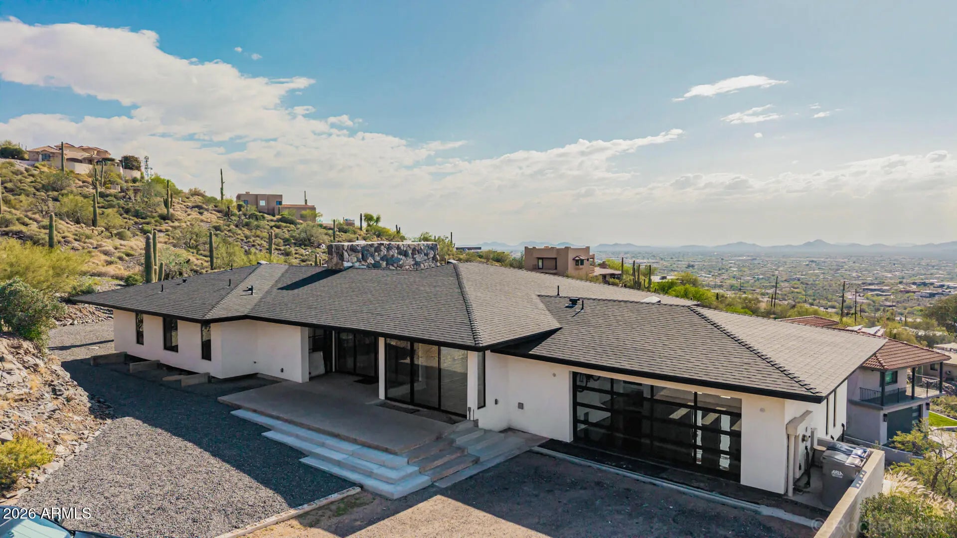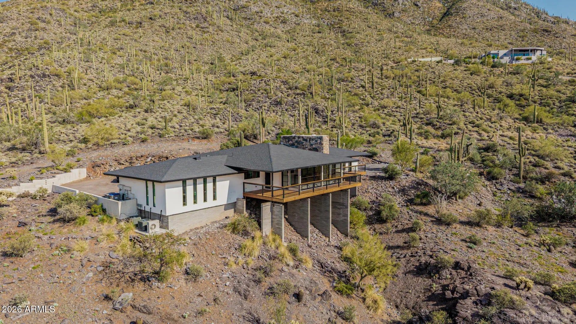 Perched on dramatic view piers high on Black Mountain in Cave Creek, this rare, fully remodeled Desert Contemporary retreat offers a true open-concept layout, panoramic 360° mountain vistas, expansive floor-to-ceiling windows protected by deep overhangs for energy efficiency. Seamless indoor-outdoor living designed to capture light, privacy, and breathtaking Arizona desert views from every angle. Gorgeous new designer kitchen features luxury Fisher & Paykel appliance suite, Namibia granite counters, and sommelier-level wine storage. Unique wine cellar in living area featuring wooden floors and custom LED lighting. Luxurious new bathrooms appointed with premium Japanese TOTO water-saving toilets that blend advanced technology with sleek, spa-inspired designs. Read on for more: NOTE: New outdoor decking, new driveway, and new exterior walls will be completed on this exceptional property by mid-April 2026. Home was fully reimagined with a design by Spry Architecture, completed in 2026, featuring beautiful hardwood and Italian tile throughout, high end designer finishes, new roof, two new HVAC units (plus one new mini-split system for garage), all new windows, nearly all-new plumbing and electrical. The clean, minimalist lines of this striking home accentuate the magnificent views from every room. Large glass sliders on both sides of the home help create a feeling of openness, allowing you to fully appreciate the peaceful, beautiful desert surroundings. Sit and relax on your private outside deck and take in truly awe-inspiring sunsets. The spacious two car garage with expansive views, glass coat epoxy floors, air conditioning, and LED light package is ideal for the car enthusiast or hobbyist. The home is perfectly located close to hiking trails on Black Mountain, as well as in nearby Spur Cross Ranch Conservation Area, ideal for those seeking outdoor adventure. Unique shopping and entertainment close by in Cave Creek and Carefree, both locations enhancing your unique desert living experience in this truly exceptional property.