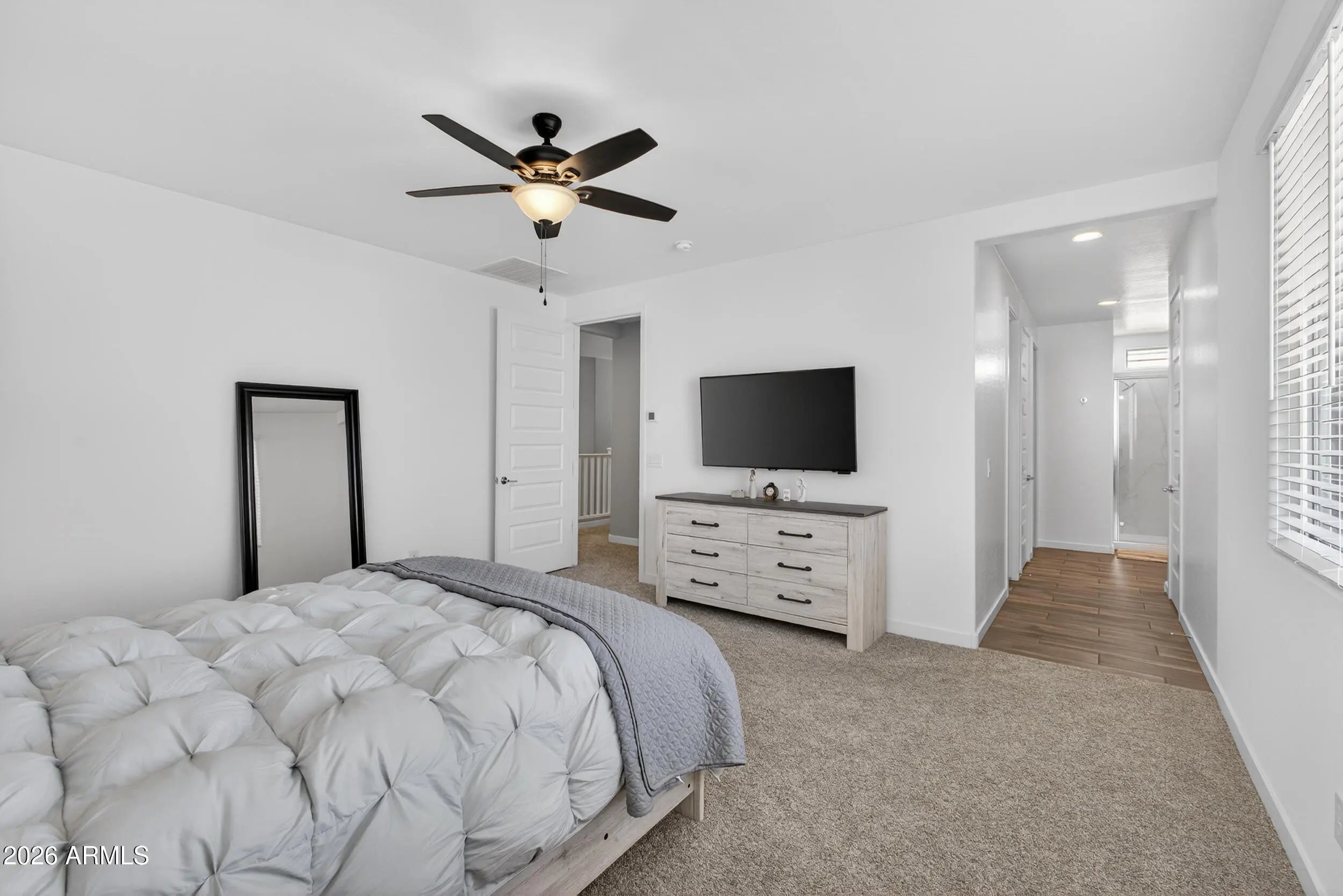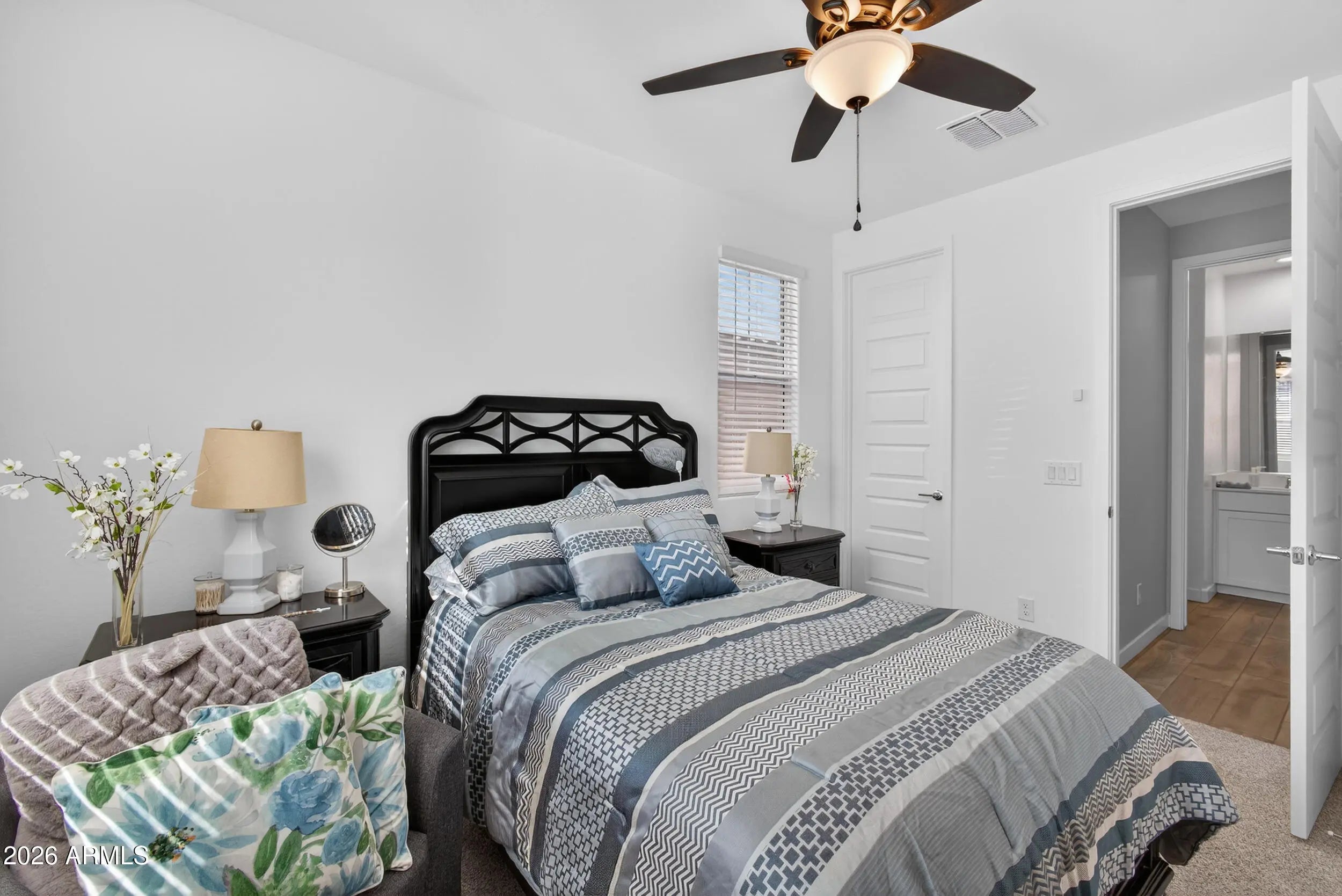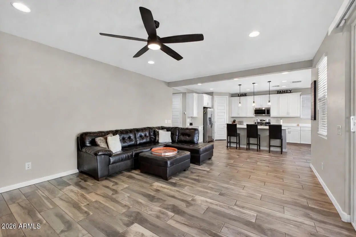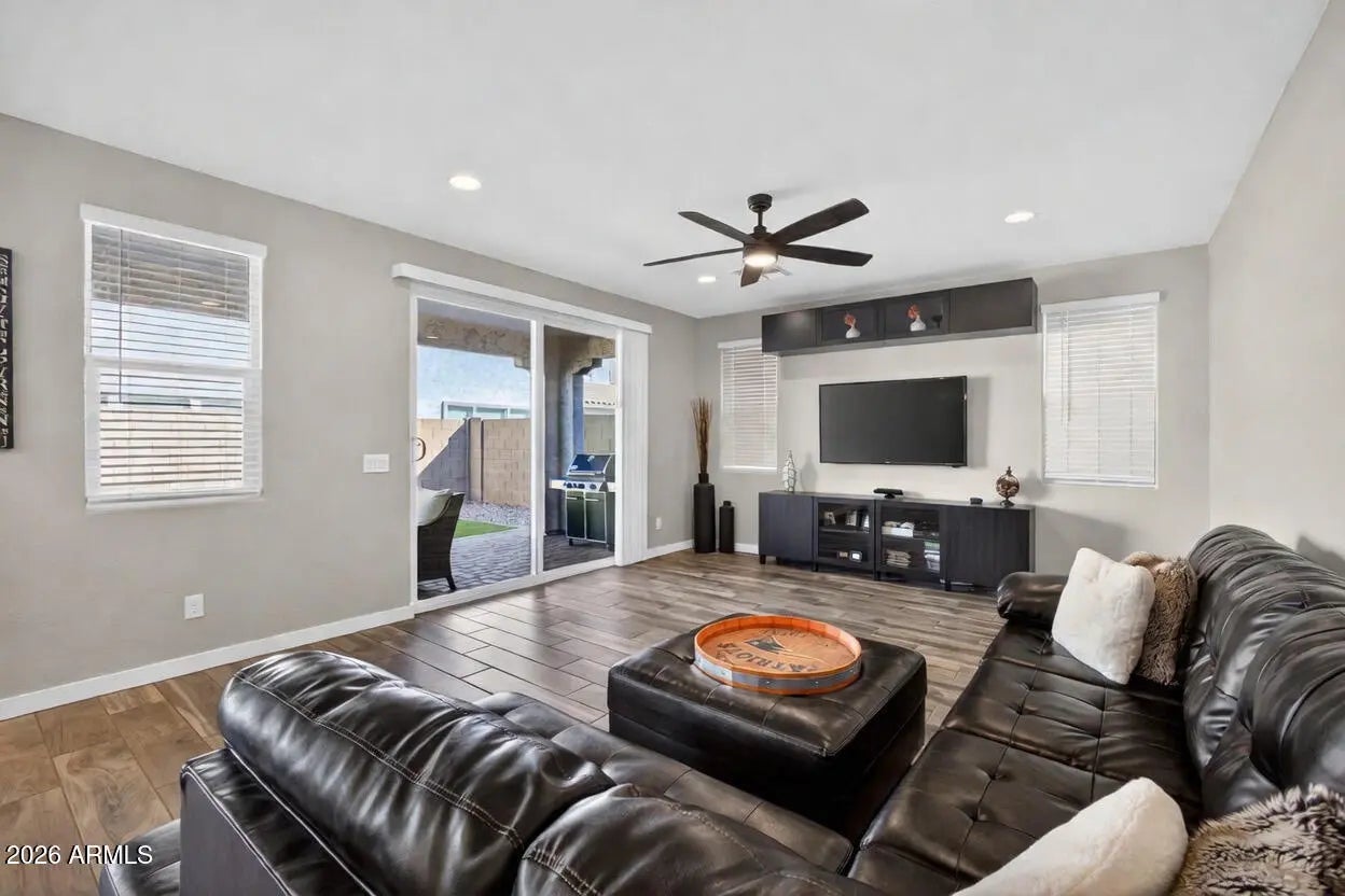 Nearly new 5-bedroom, 3-bath home with 2,679 sq ft in the sought-after community of Hawes Crossing! Thoughtfully upgraded throughout with 9' ceilings and wood-look tile flooring in all main living areas, hallways, and bathrooms, plus plush carpet in the bedrooms. The flexible floor plan features a downstairs bedroom and full bath-perfect for guests, multigenerational living, or a home office. The open-concept great room is designed for both everyday living and entertaining. The gourmet kitchen boasts 42'' bright white shaker cabinets with crown molding, extended cabinetry along the full west wall, quartz countertops, a large island with pendant lighting, stainless steel appliances including a gas range and built-in microwave, reverse osmosis system, and an oversized walk-in pantry. Upstairs you'll find a spacious primary suite filled with natural light featuring dual vanities, a large marble-surround shower, private toilet room, and two walk-in closets. Three additional bedrooms, a full bath, and a convenient upstairs laundry room complete the second level. Enjoy the beautifully landscaped backyard with a large covered patio with pavers, BBQ area, extended turf yard, and paved side yard with gate access. Additional upgrades include a gas tankless water heater, soft water loop, epoxied garage floors, and gas stub for future outdoor enhancements. Located in a prime Mesa location with quick freeway access and close to shopping, dining, and recreation!