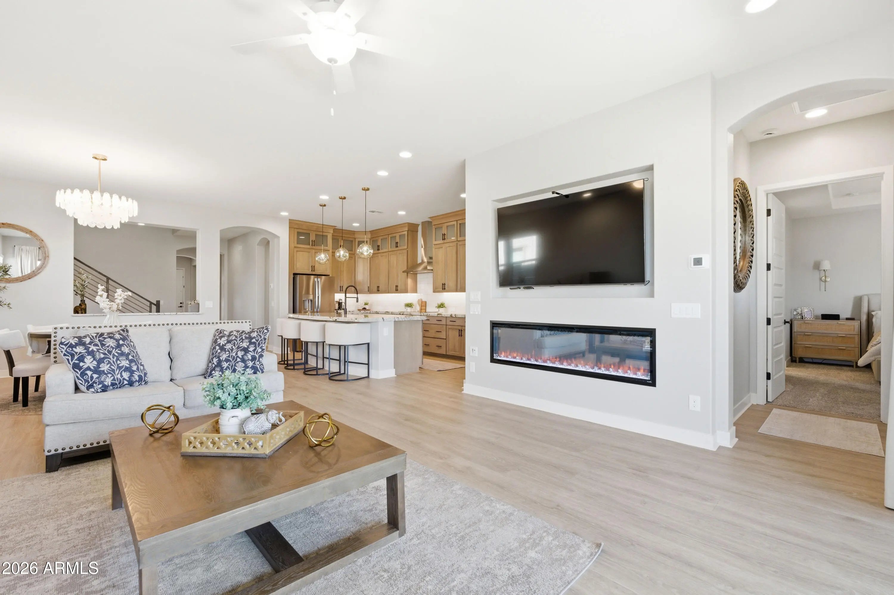 Beautifully upgraded home with $118K+ in premium upgrades & a desirable gourmet kitchen layout. The chef's kitchen features upgraded stacked cabinetry, granite countertops, sleek cooktop, convection oven w/Advantium, decorative tile backsplash, & designer pendant lighting. The open great room is highlighted by a 74'' contemporary fireplace and a 16' glass atrium door that creates seamless indoor-outdoor living to a backyard with pergola & artificial turf. The primary suite offers a spa-inspired tiled shower, while additional upgrades include luxurious wood flooring. Spacious loft offers additional living space. Located in the sought-after Barney Farms community with lakes, pools, pickleball, trails, & more--just steps from Queen Creek Frontier Family Park, Rec Center, and Aquatic Center.