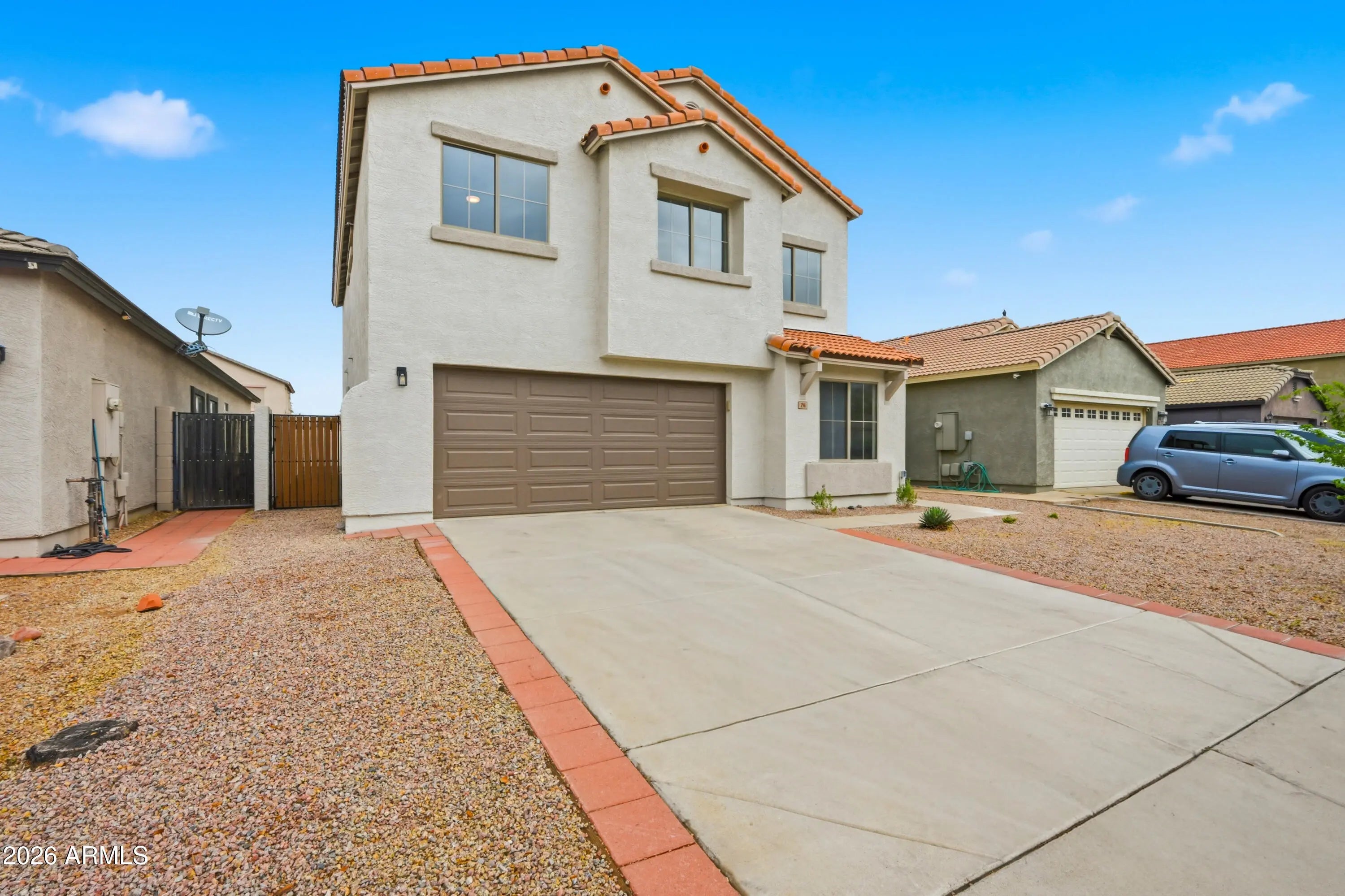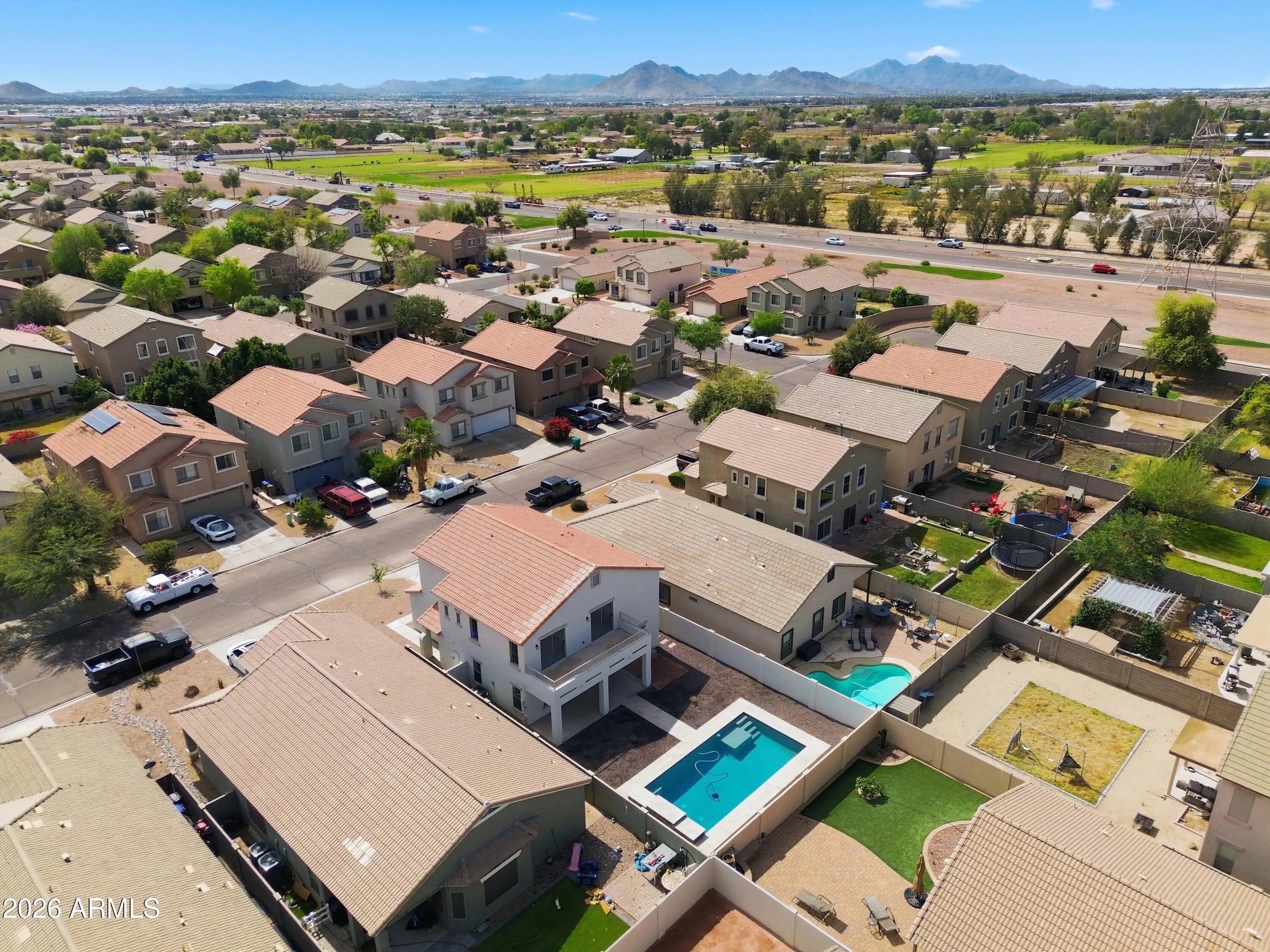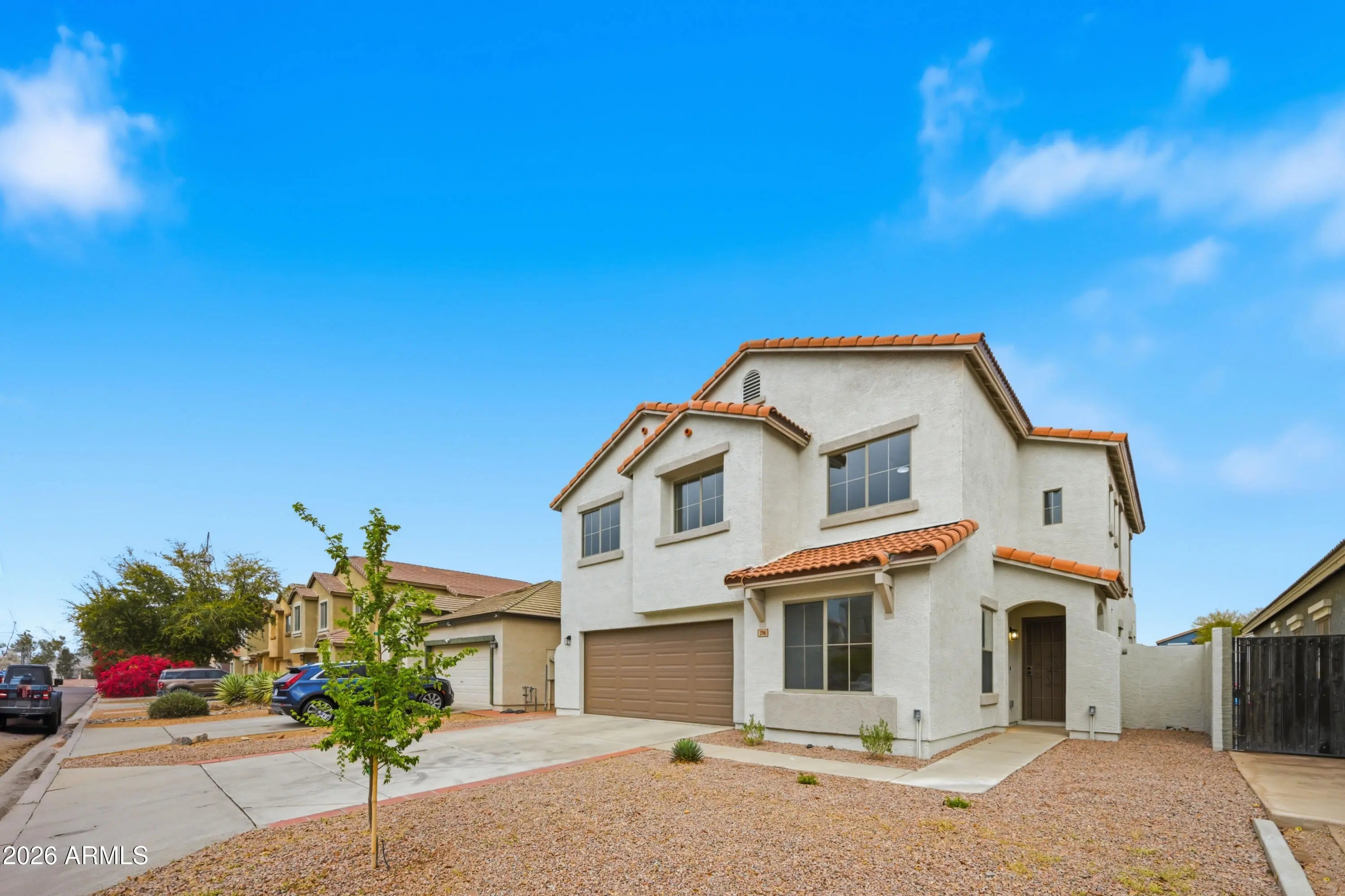 Welcome to this beautifully fully updated 2,150 sq ft home, offering space, style, and thoughtful upgrades throughout. With 5 bedrooms, a downstairs den, and 2.5 bathrooms, this versatile layout provides plenty of room for living, working, and hosting. The main level features a private den, perfect for a home office, playroom, or flex space. The home has been refreshed with brand new flooring, fresh interior and exterior paint, and new appliances, creating a clean, modern feel from the moment you walk in. Upstairs you'll find generously sized bedrooms, including a spacious primary suite with a fully updated bathroom designed with modern finishes. The upstairs secondary bathroom has also been refreshed with a new vanity, mirror, and toilet, adding to the home's move-in ready appeal. Step outside to enjoy your private backyard with a pool and covered patio, perfect for relaxing or entertaining. One of the home's standout features is the balcony with access from both the primary bedroom and bedroom #5, creating a unique outdoor retreat overlooking the backyard. Major system upgrades provide peace of mind, including a brand new A/C unit and new roof, along with many other thoughtful updates throughout. Ideally located with convenient access to shopping, dining, and everyday essentials in San Tan Valley and nearby Queen Creek. Enjoy local favorites like the Queen Creek Olive Mill, along with extensive retail, restaurants, and entertainment just a short drive away at SanTan Village. This location offers the perfect balance of neighborhood living while staying close to everything you need.