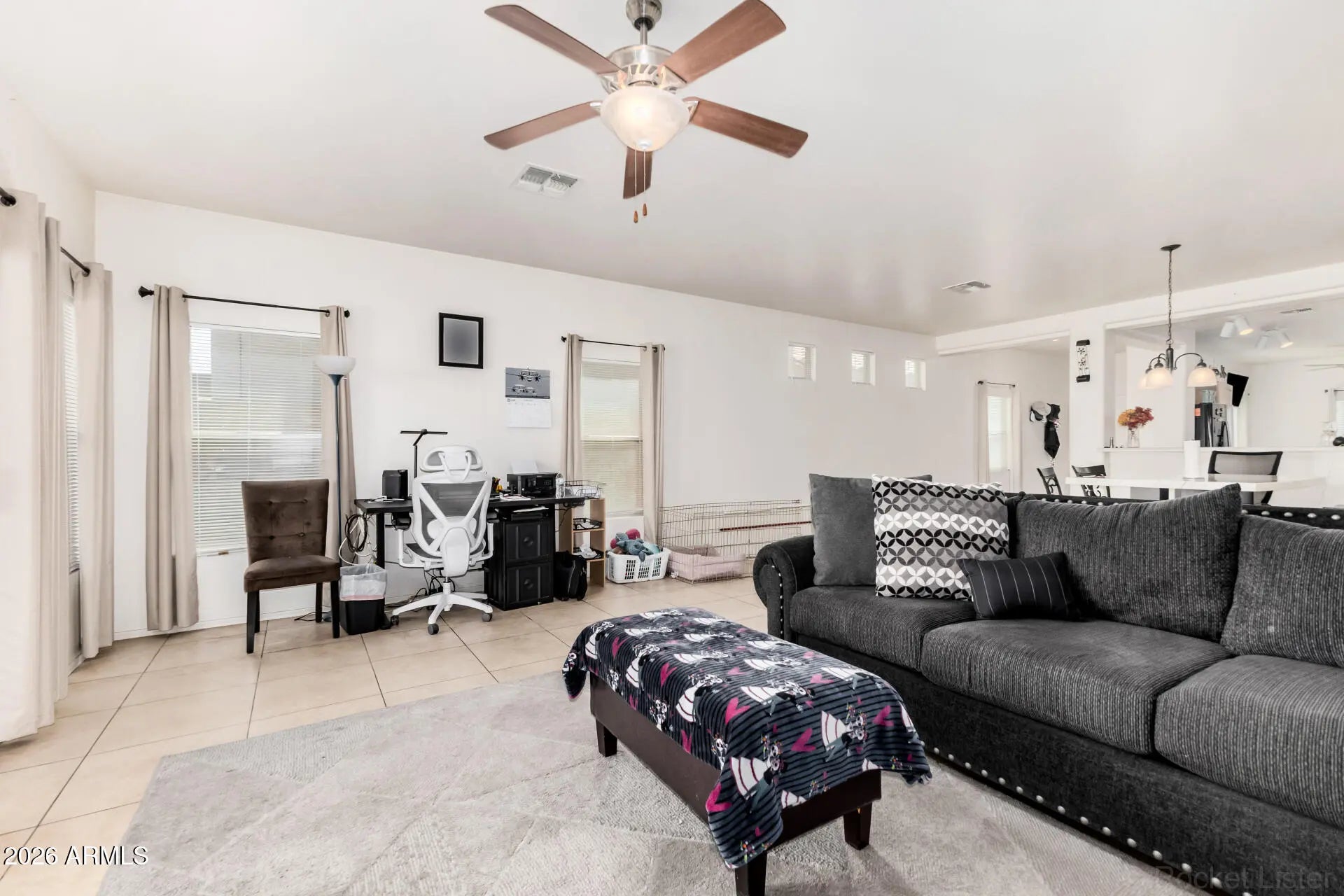 Don't miss the opportunity to own this charming single-level home in Laveen Crossing! Providing 3 beds, 2 baths, and a 2-car garage. Discover an inviting interior featuring abundant natural light, a neutral palette, and tile flooring t/out for easy maintenance. You'll love the spacious, seamlessly flowing living & dining room with sliding doors to the back! The kitchen boasts built-in appliances, track lighting, ample wood cabinets, a center island, and a breakfast nook. The main bedroom has a private bathroom for added comfort. Check out the backyard offering a grassy area and a covered patio w/extended pavers! With your creative ideas, you can make it a complete outdoor living space. Conveniently close to parks, schools, shopping, dining options, and easy freeway access. Make this yours!