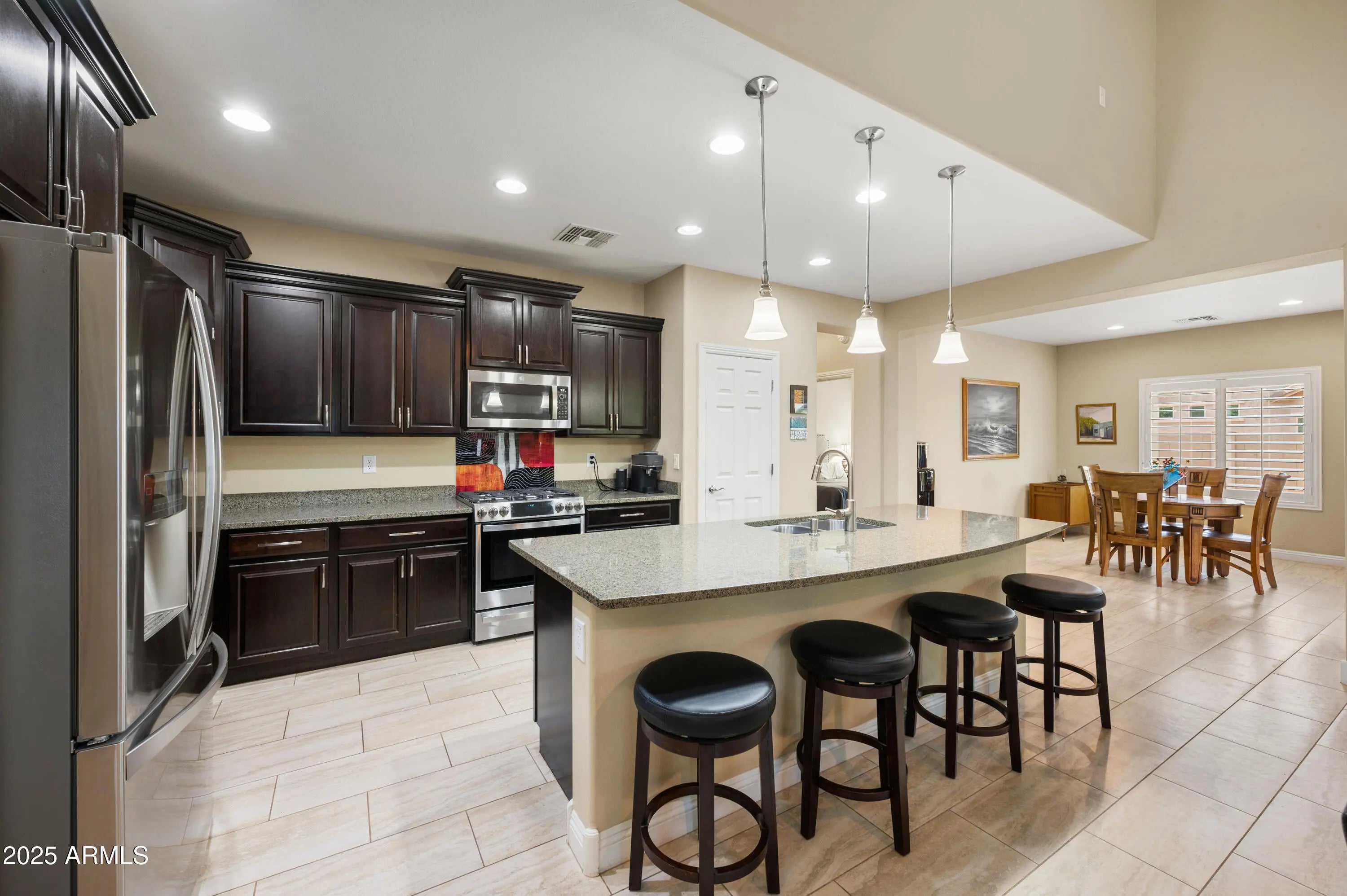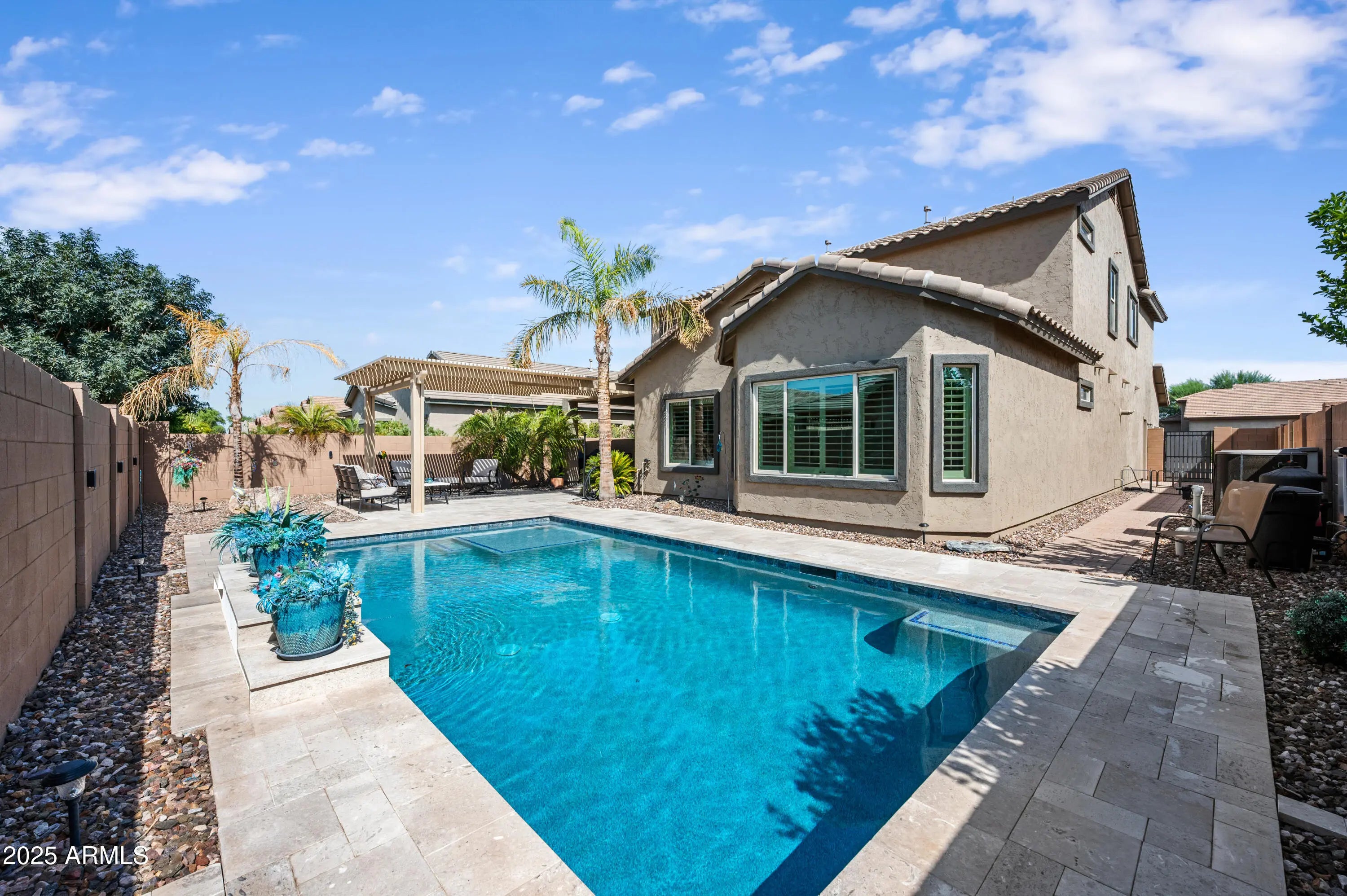 Stunning 4BR/3.5BA home with 2,693 sq. ft. of upgraded living space in highly desired East Mesa location. Built in 2012 and meticulously maintained, this split floor plan offers a main-level primary suite with en-suite bath & walk-in closet, open great room with surround sound wiring (up & down), and an upstairs bonus loft. Gourmet kitchen features espresso-stained staggered cabinets with crown molding, granite countertops, GE Profile gas range & Convection Microwave (bakes & air fries), Kenmore Elite & LG stainless refrigerator. Step outside to your private backyard oasis with a Sparkling Pebble-Finish Heated Pool, travertine decking, and a custom pergola, perfect for relaxing or entertaining. Neutral décor, energy efficient design, and move-in ready condition make this home exceptional. Conveniently located near top schools, shopping, and freeway access.