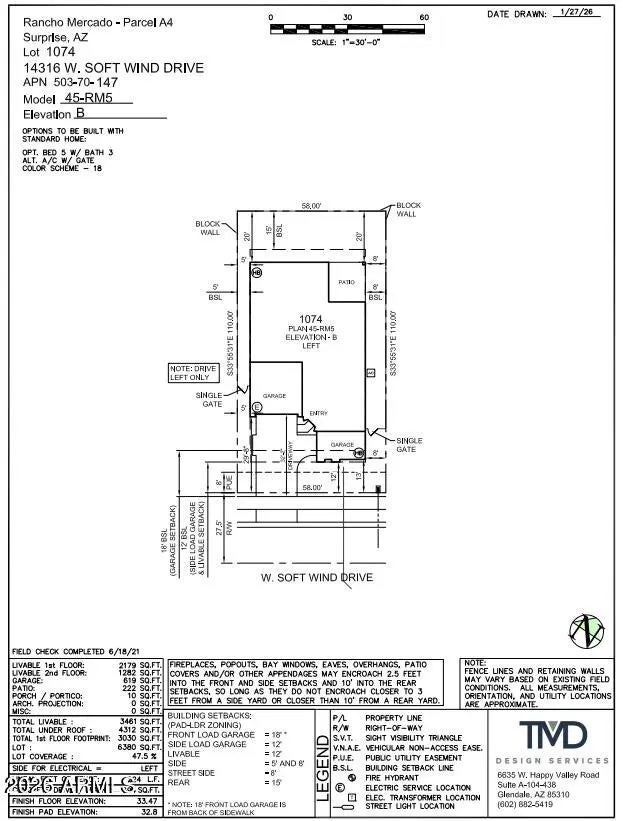 What's Special: South Facing Lot | North Facing Patio | Final Opportunity. New Construction - September Completion! Built by America's Most Trusted Home Builder. Welcome to the 45RM5 at 14316 W Soft Wind Drive in Almeria at Rancho Mercado! This spacious floor plan is designed to welcome you in with comfort and charm. Step into the foyer to find a flexible room perfect for your needs, along with a convenient half bath and easy access to the garage. Further inside, the heart of the home opens beautifully with an airy kitchen that flows into the casual dining area, great room, and formal dining space -- offering plenty of room for gatherings big or small. MLS#6997538 The primary suite is tucked at the back of the main floor, featuring a serene bath with a separate tub and shower, dual vanities, and a generous walk-in closet. Upstairs, a bright loft connects four secondary bedrooms, including one with an ensuite bath, plus a shared full bath and a thoughtfully placed laundry room. Meandering walks along lush trails and competitive volleyball or basketball games can become your new normal. There's even a dog park for your furry friends! Enjoy the connectivity of a master-planned community. Beautiful trails connect a playground to sports courts and a dog park. Hello, natural light! There's no shortage of windows to enjoy the Arizona sunshine. Additional Highlights Include: Bedroom 5 with bath 3, alternate AC location with gate, and 8' interior doors.