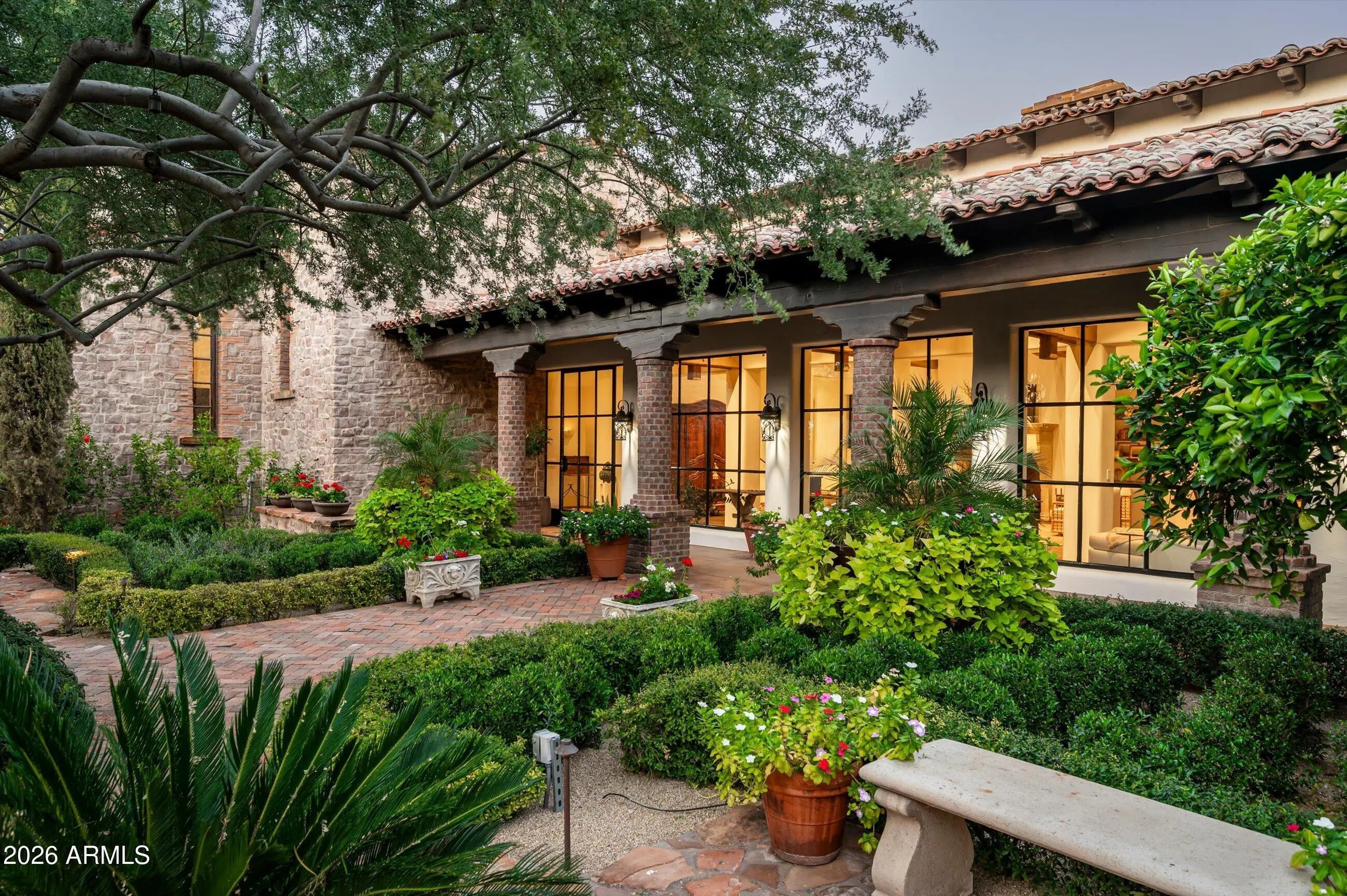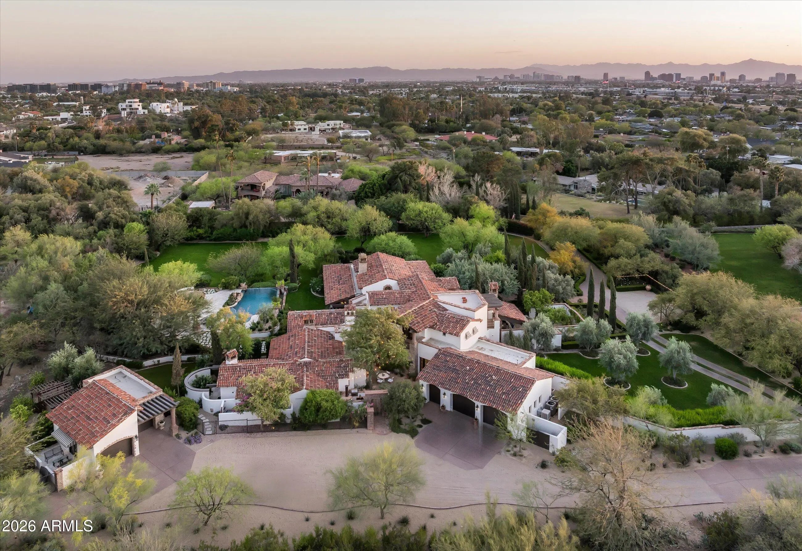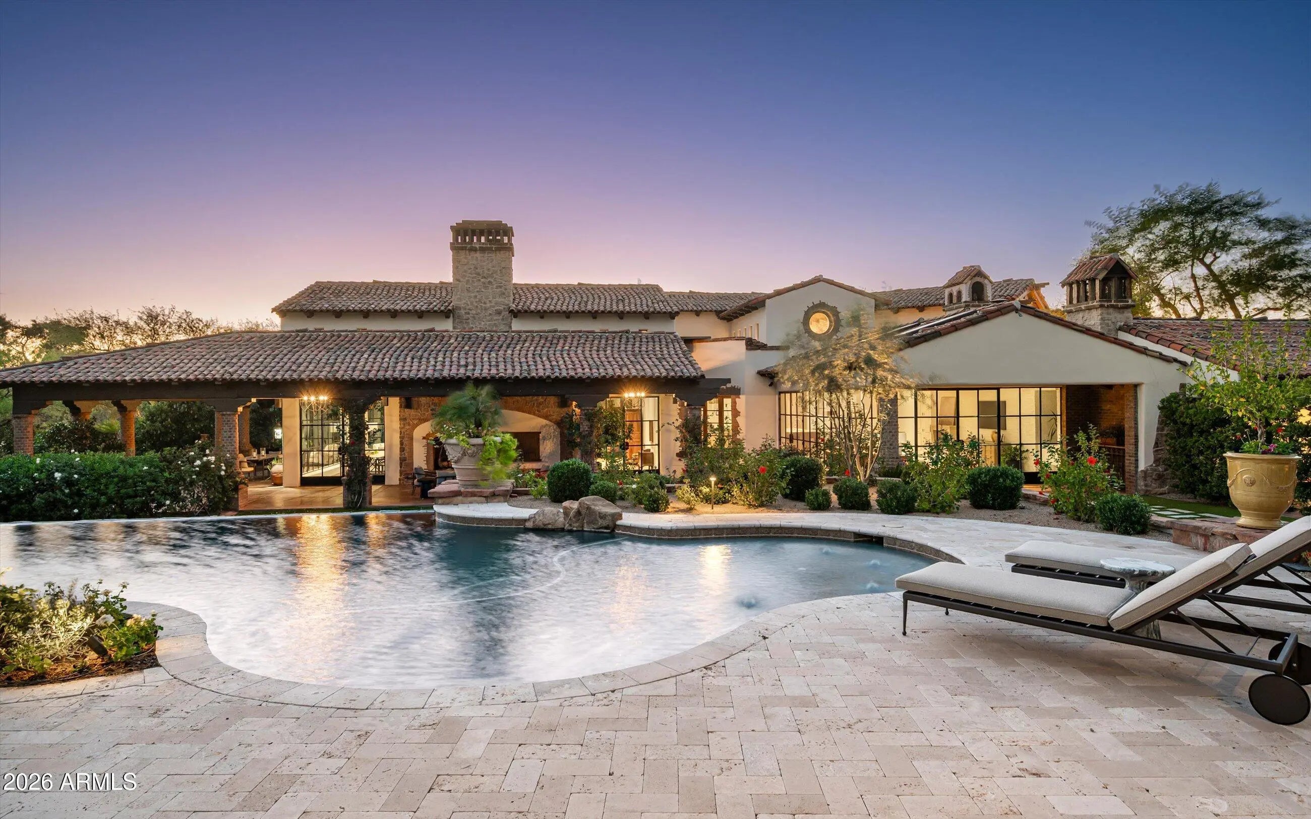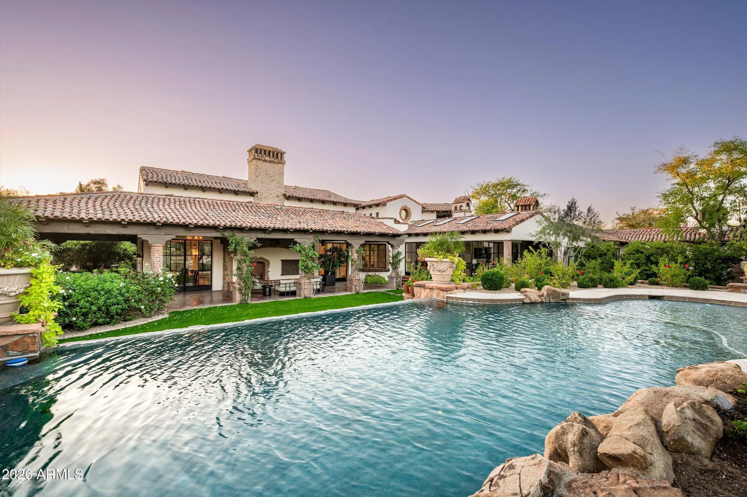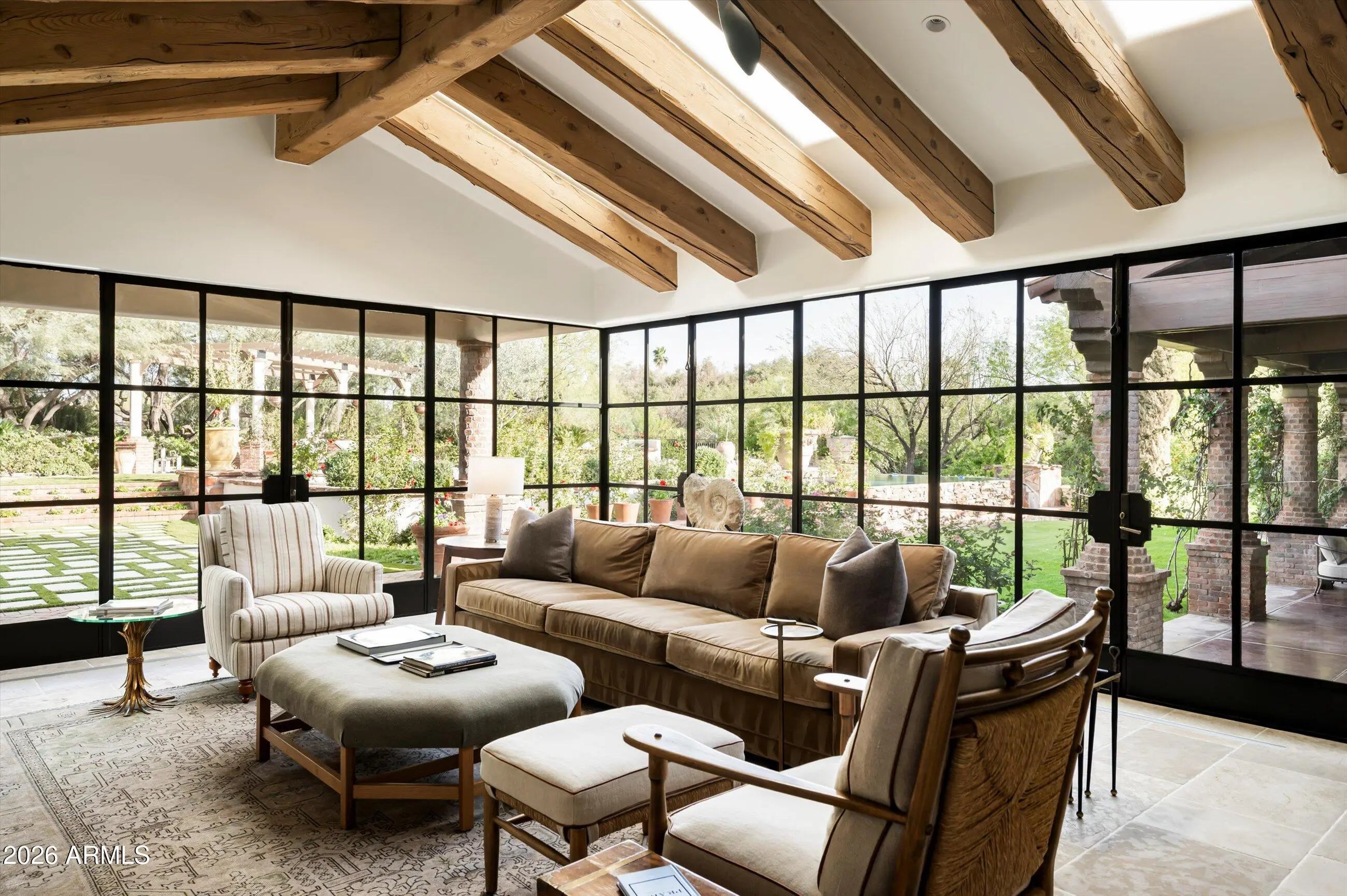 Fully remodeled and masterfully reimagined with interiors by the renowned firm Nate Berkus Associates, this more than 7,000-square-foot residence blends timeless European elegance, impeccable craftsmanship, and curated luxury. Set on expansive private grounds, the estate offers a rare opportunity to experience resort-style living in a home of extraordinary design and refined sophistication. Soaring ceilings and walls of glass fill the home with natural light, highlighting its grand scale and refined architectural detailing. Rich wood and limestone flooring create warmth and continuity throughout, while six hand-carved limestone fireplaces anchor the living spaces and reclaimed wood accents add depth and timeless character. The thoughtfully designed floor plan features four expansive en-suite bedrooms and four-and-a-half baths, each appointed with bespoke materials and elevated finishes. The private primary wing serves as a true sanctuary with two separate primary bathrooms, two generous custom closets, and a secluded courtyard with a private outdoor shower for a tranquil outdoor escape. At the heart of the home, the kitchen pairs beauty and performance. Custom cabinetry, slab marble surfaces, and a dramatic marble-and-bronze island form an architectural centerpiece, complemented by Sub-Zero refrigeration and a statement La Cornue range. A fully equipped secondary kitchen adds exceptional convenience for entertaining or daily living. The fully enclosed grounds evoke the feel of a private resort, with lush gardens, mature roses, vibrant blooms, and citrus trees, alongside a tranquil koi pond and wood-fired pizza oven. Multiple covered entertaining areas, artificial turf, and a dedicated greenhouse enhance both charm and versatility, while the infinity-edge pool, framed by limestone decking and a picturesque pergola, creates an idyllic setting for relaxation and entertaining. Two garages with space for 4.5 cars complete the offering. Located within walking distance of the iconic Arizona Biltmore, this exceptional estate offers a rare blend of privacy, scale, and resort-inspired living.