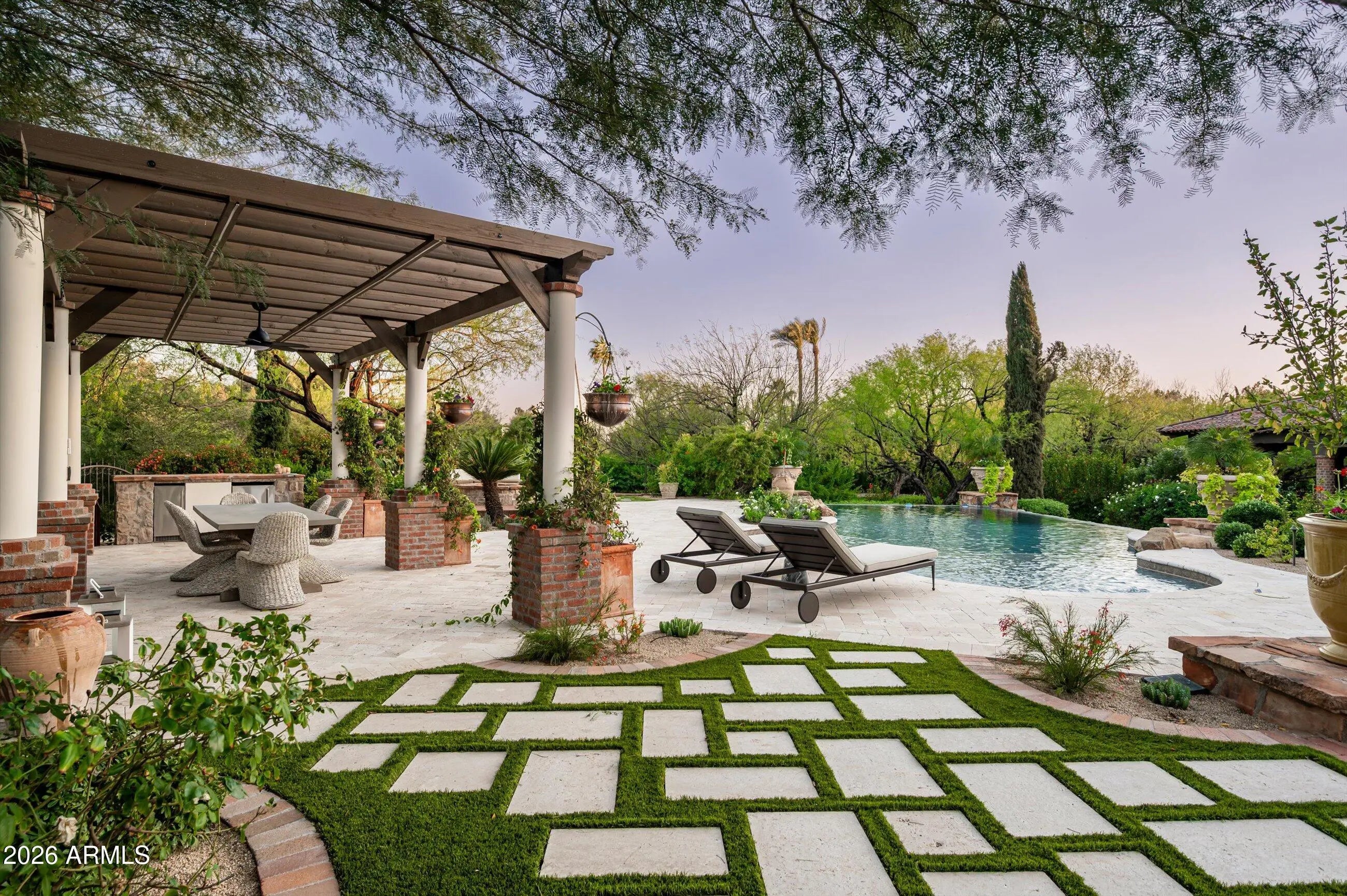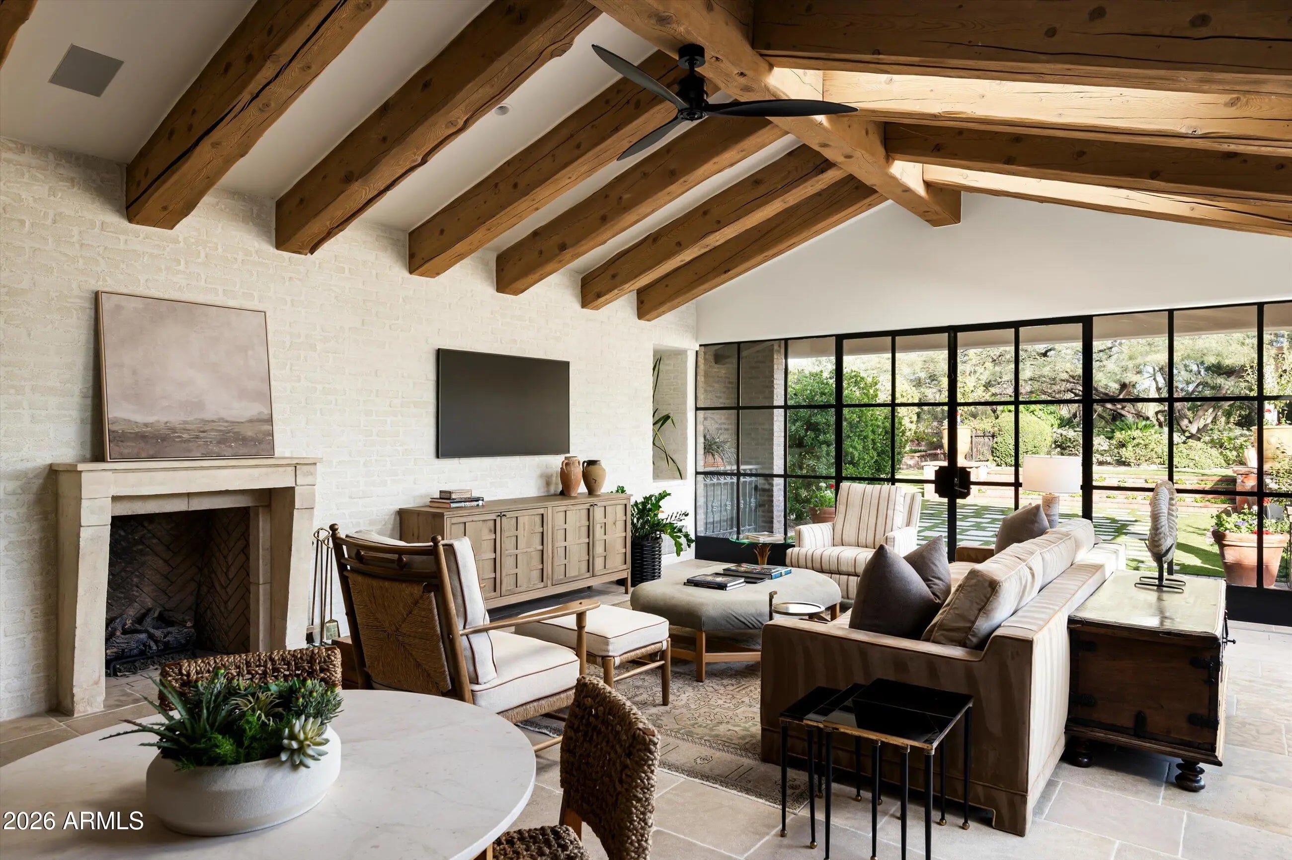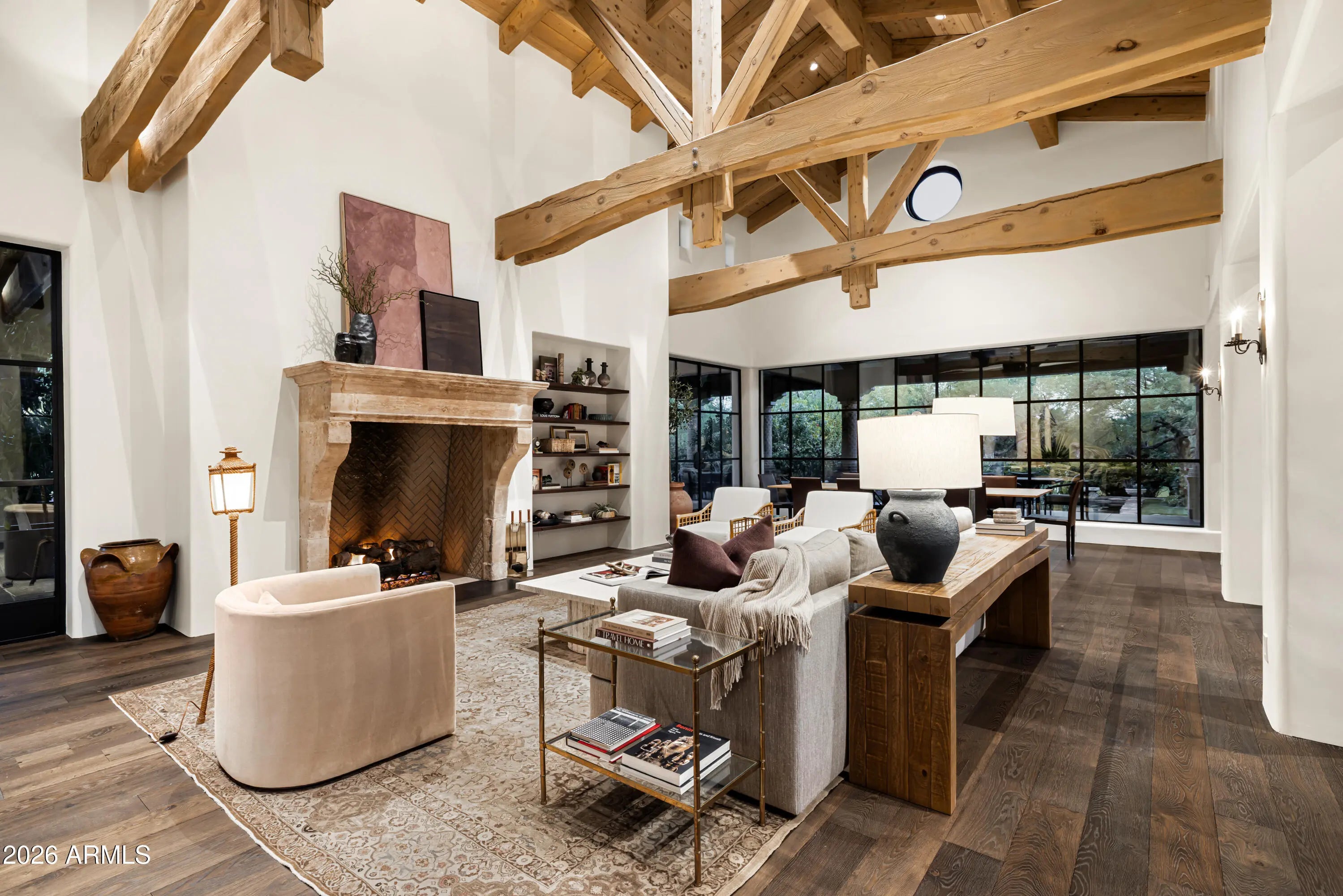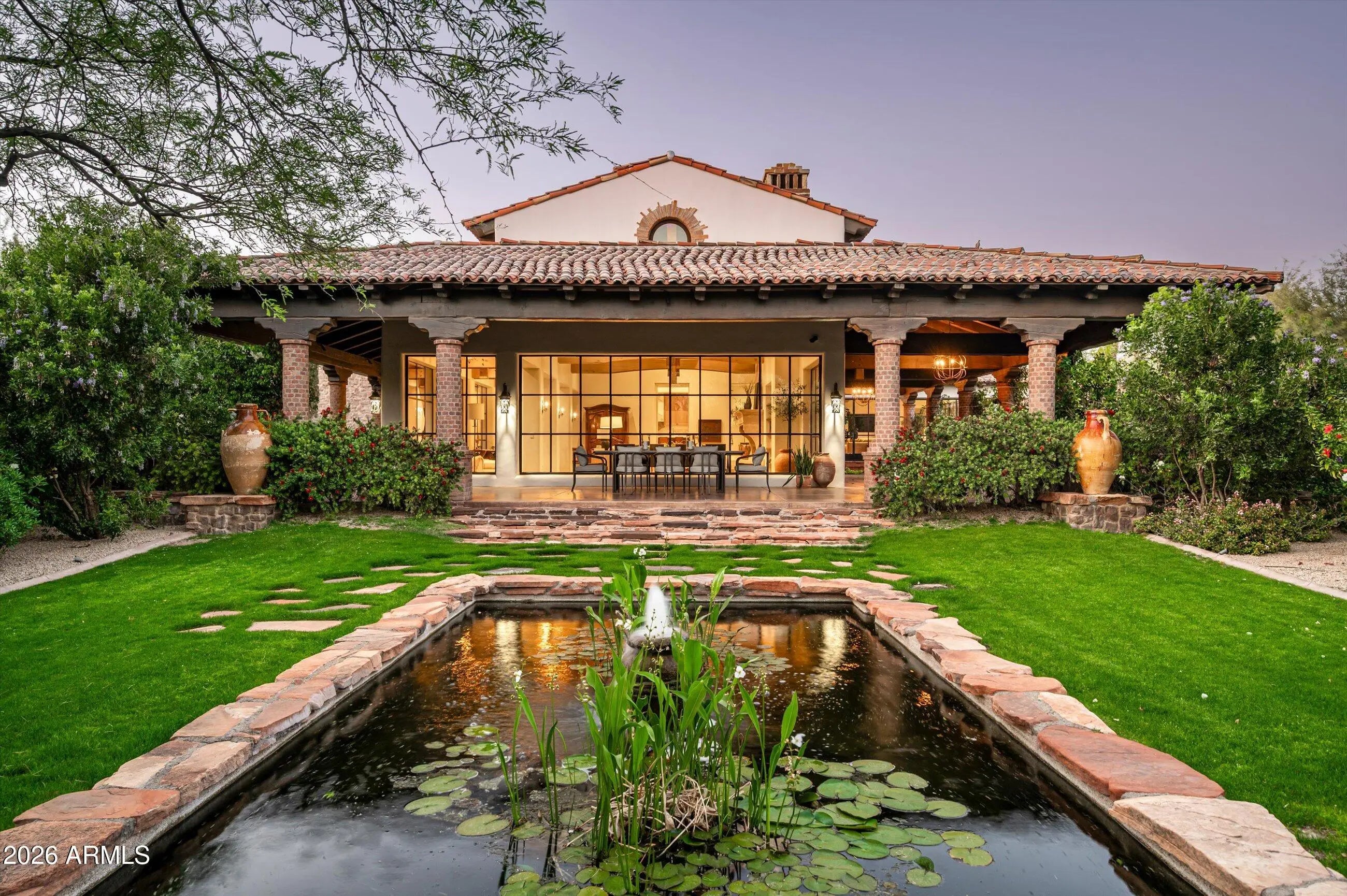 Fully remodeled and masterfully reimagined with interiors by the renowned firm Nate Berkus Associates, this more than 7,000-square-foot residence blends timeless European elegance, impeccable craftsmanship, and curated luxury. Set on expansive private grounds, the estate offers a rare opportunity to experience resort-style living in a home of extraordinary design and refined sophistication. Soaring ceilings and walls of glass fill the home with natural light, highlighting its grand scale and refined architectural detailing. Rich wood and limestone flooring create warmth and continuity throughout, while six hand-carved limestone fireplaces anchor the living spaces and reclaimed wood accents add depth and timeless character. The thoughtfully designed floor plan features four expansive en-suite bedrooms and four-and-a-half baths, each appointed with bespoke materials and elevated finishes. The private primary wing serves as a true sanctuary with two separate primary bathrooms, two generous custom closets, and a secluded courtyard with a private outdoor shower for a tranquil outdoor escape. At the heart of the home, the kitchen pairs beauty and performance. Custom cabinetry, slab marble surfaces, and a dramatic marble-and-bronze island form an architectural centerpiece, complemented by Sub-Zero refrigeration and a statement La Cornue range. A fully equipped secondary kitchen adds exceptional convenience for entertaining or daily living. The fully enclosed grounds evoke the feel of a private resort, with lush gardens, mature roses, vibrant blooms, and citrus trees, alongside a tranquil koi pond and wood-fired pizza oven. Multiple covered entertaining areas, artificial turf, and a dedicated greenhouse enhance both charm and versatility, while the infinity-edge pool, framed by limestone decking and a picturesque pergola, creates an idyllic setting for relaxation and entertaining. Two garages with space for 4.5 cars complete the offering. Located within walking distance of the iconic Arizona Biltmore, this exceptional estate offers a rare blend of privacy, scale, and resort-inspired living.