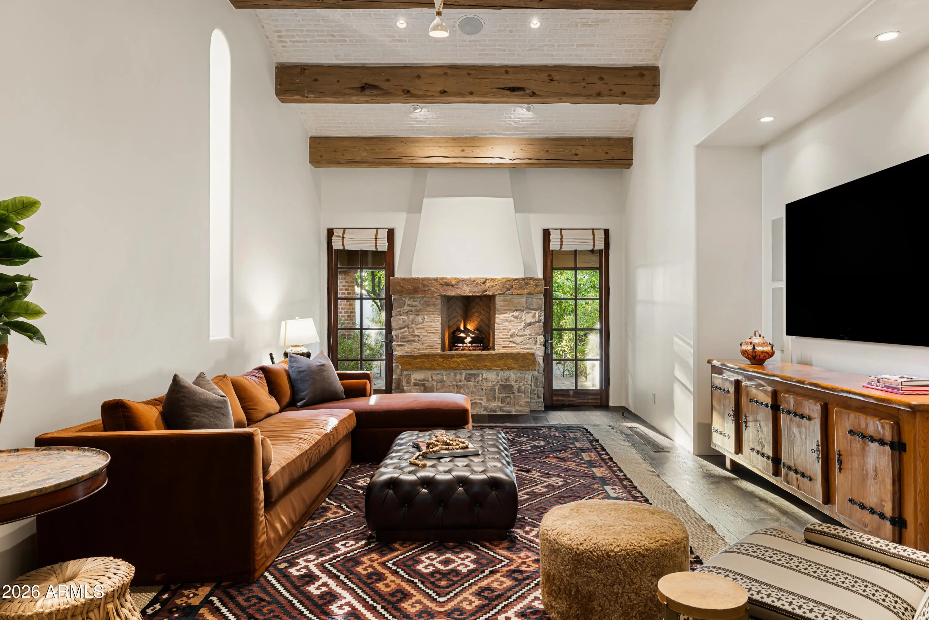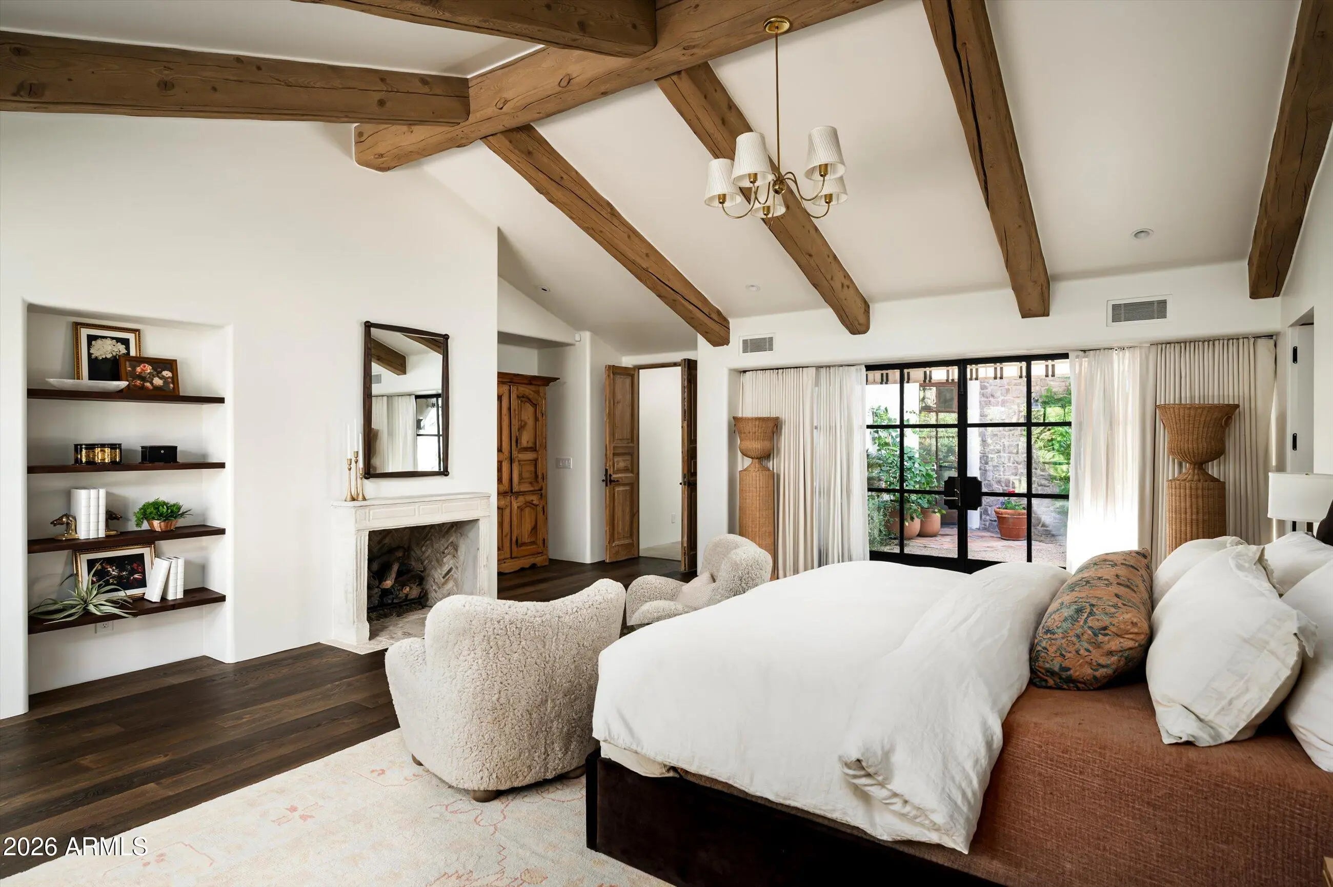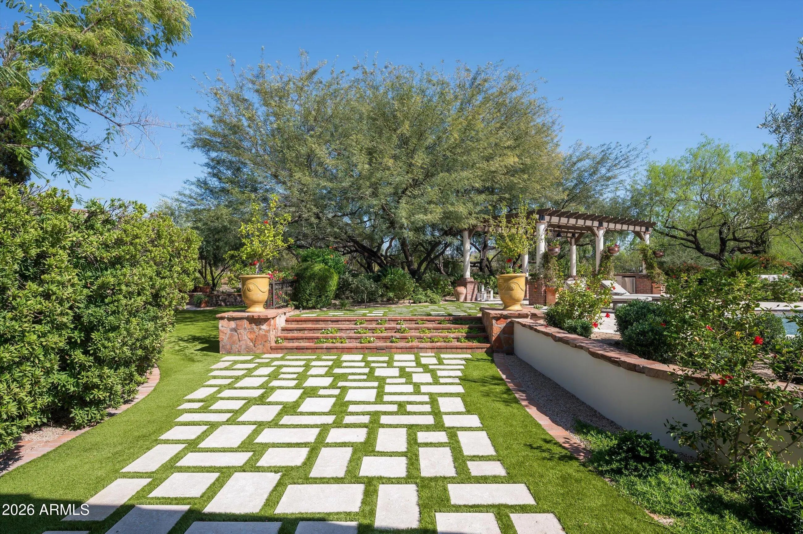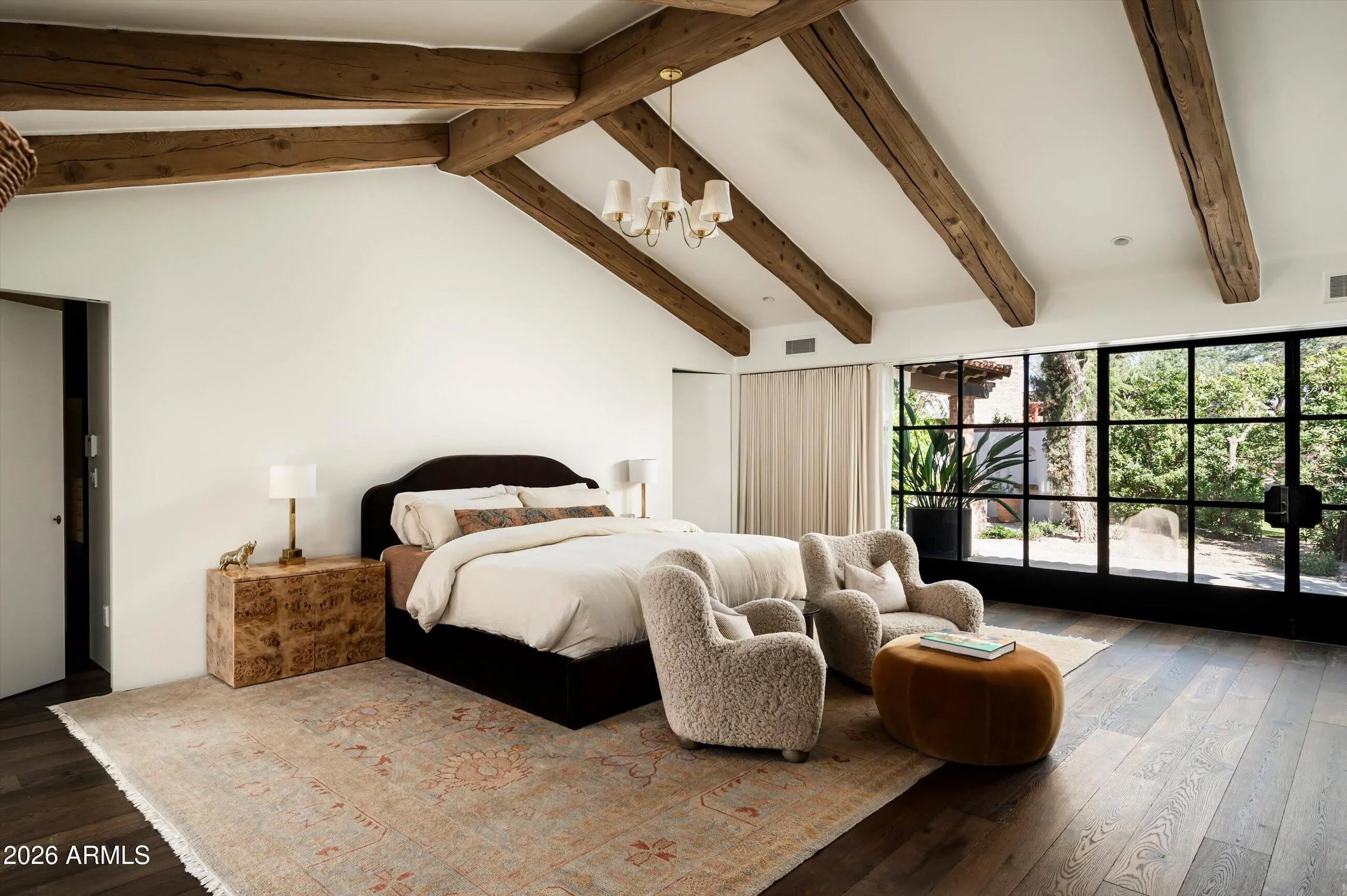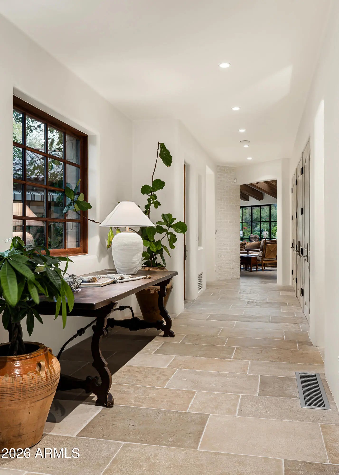 Fully remodeled and masterfully reimagined with interiors by the renowned firm Nate Berkus Associates, this more than 7,000-square-foot residence blends timeless European elegance, impeccable craftsmanship, and curated luxury. Set on expansive private grounds, the estate offers a rare opportunity to experience resort-style living in a home of extraordinary design and refined sophistication. Soaring ceilings and walls of glass fill the home with natural light, highlighting its grand scale and refined architectural detailing. Rich wood and limestone flooring create warmth and continuity throughout, while six hand-carved limestone fireplaces anchor the living spaces and reclaimed wood accents add depth and timeless character. The thoughtfully designed floor plan features four expansive en-suite bedrooms and four-and-a-half baths, each appointed with bespoke materials and elevated finishes. The private primary wing serves as a true sanctuary with two separate primary bathrooms, two generous custom closets, and a secluded courtyard with a private outdoor shower for a tranquil outdoor escape. At the heart of the home, the kitchen pairs beauty and performance. Custom cabinetry, slab marble surfaces, and a dramatic marble-and-bronze island form an architectural centerpiece, complemented by Sub-Zero refrigeration and a statement La Cornue range. A fully equipped secondary kitchen adds exceptional convenience for entertaining or daily living. The fully enclosed grounds evoke the feel of a private resort, with lush gardens, mature roses, vibrant blooms, and citrus trees, alongside a tranquil koi pond and wood-fired pizza oven. Multiple covered entertaining areas, artificial turf, and a dedicated greenhouse enhance both charm and versatility, while the infinity-edge pool, framed by limestone decking and a picturesque pergola, creates an idyllic setting for relaxation and entertaining. Two garages with space for 4.5 cars complete the offering. Located within walking distance of the iconic Arizona Biltmore, this exceptional estate offers a rare blend of privacy, scale, and resort-inspired living.