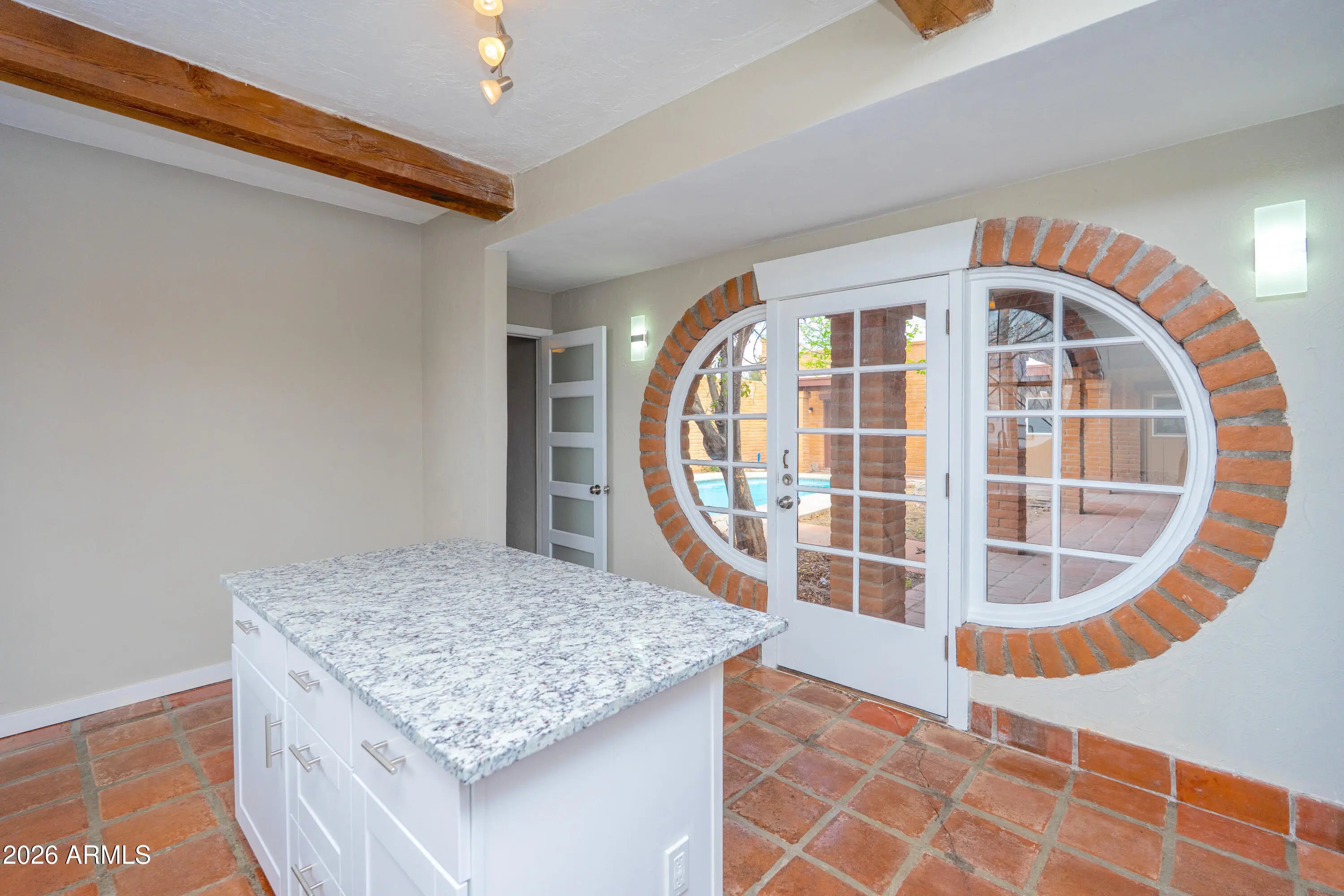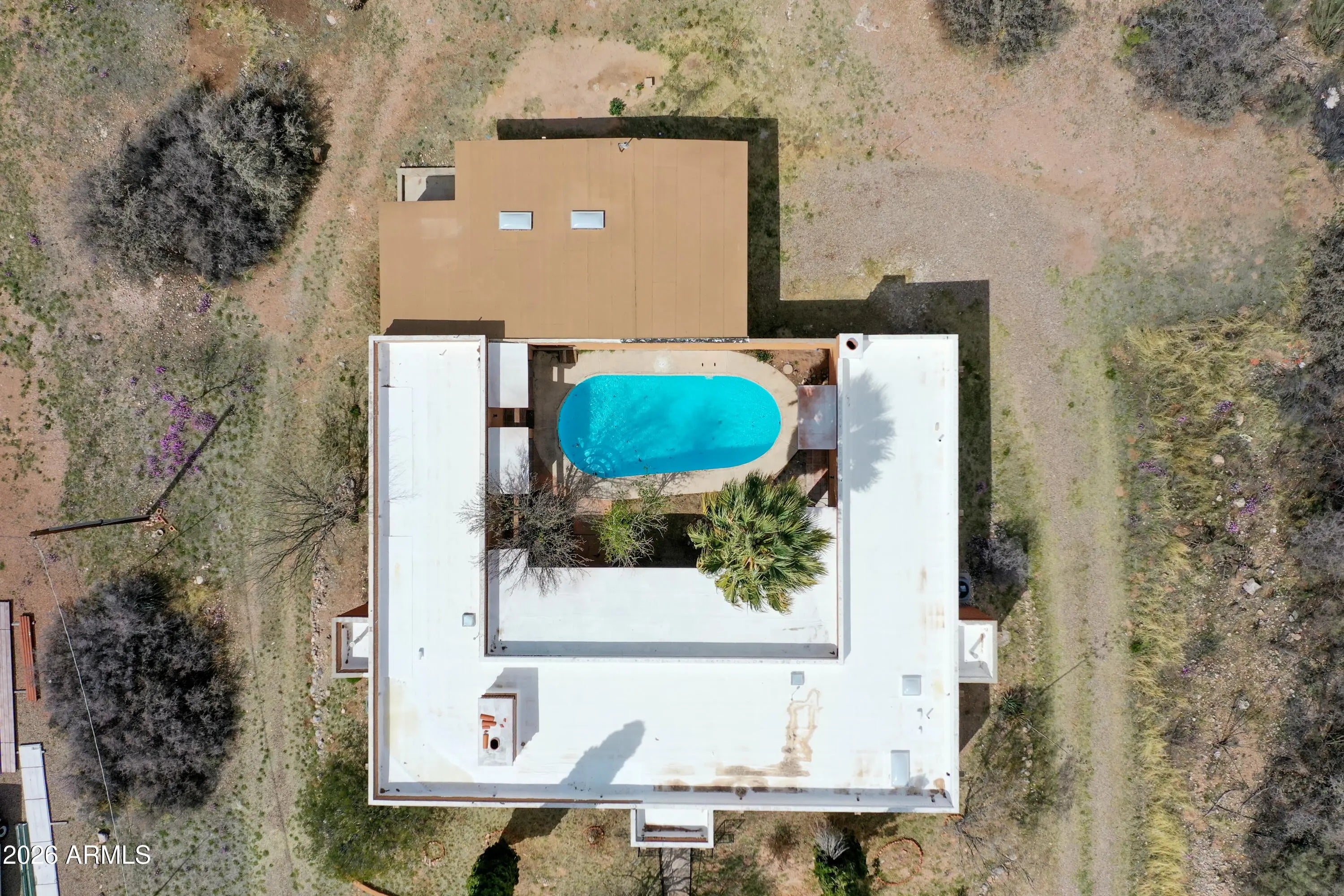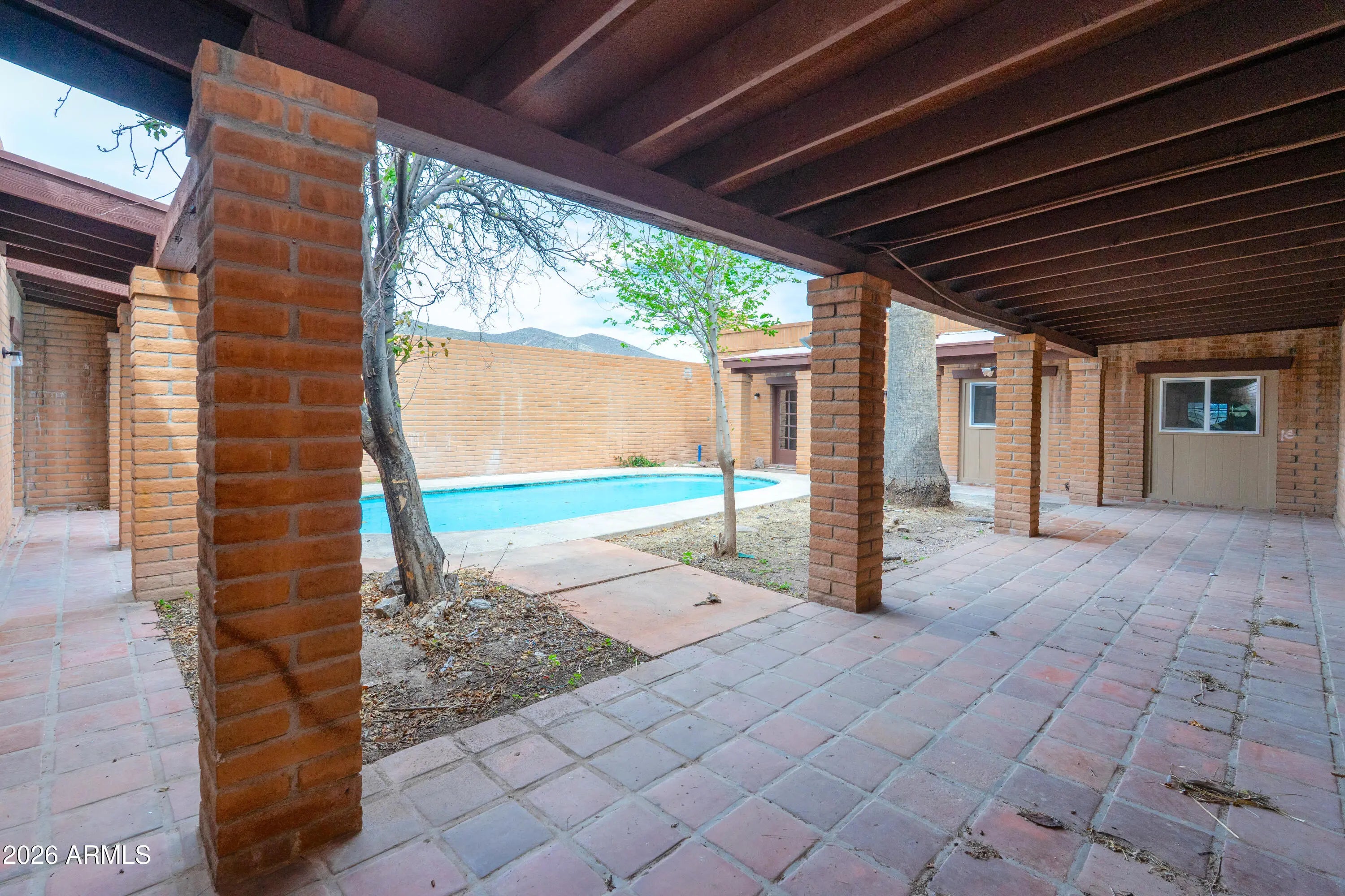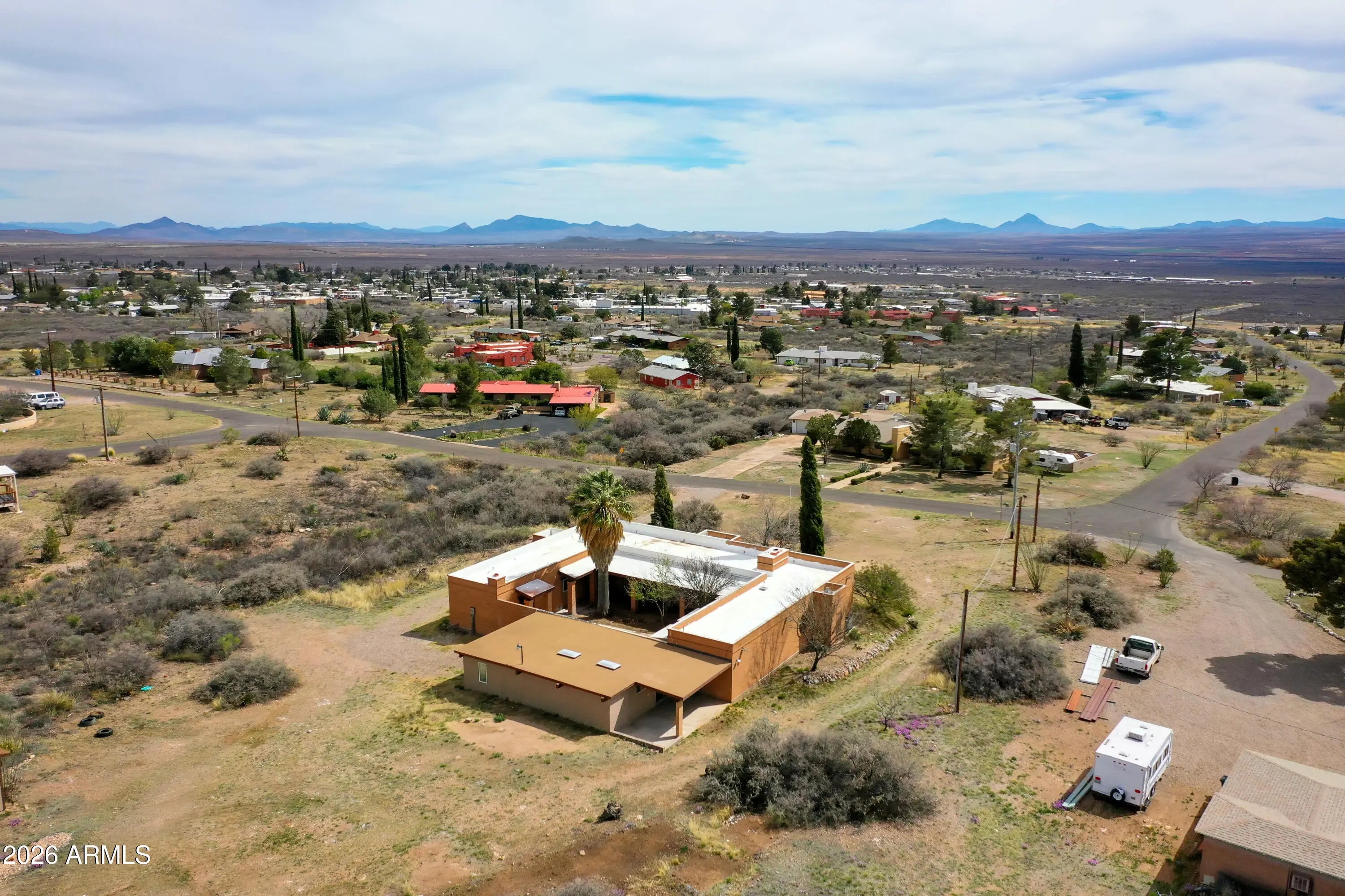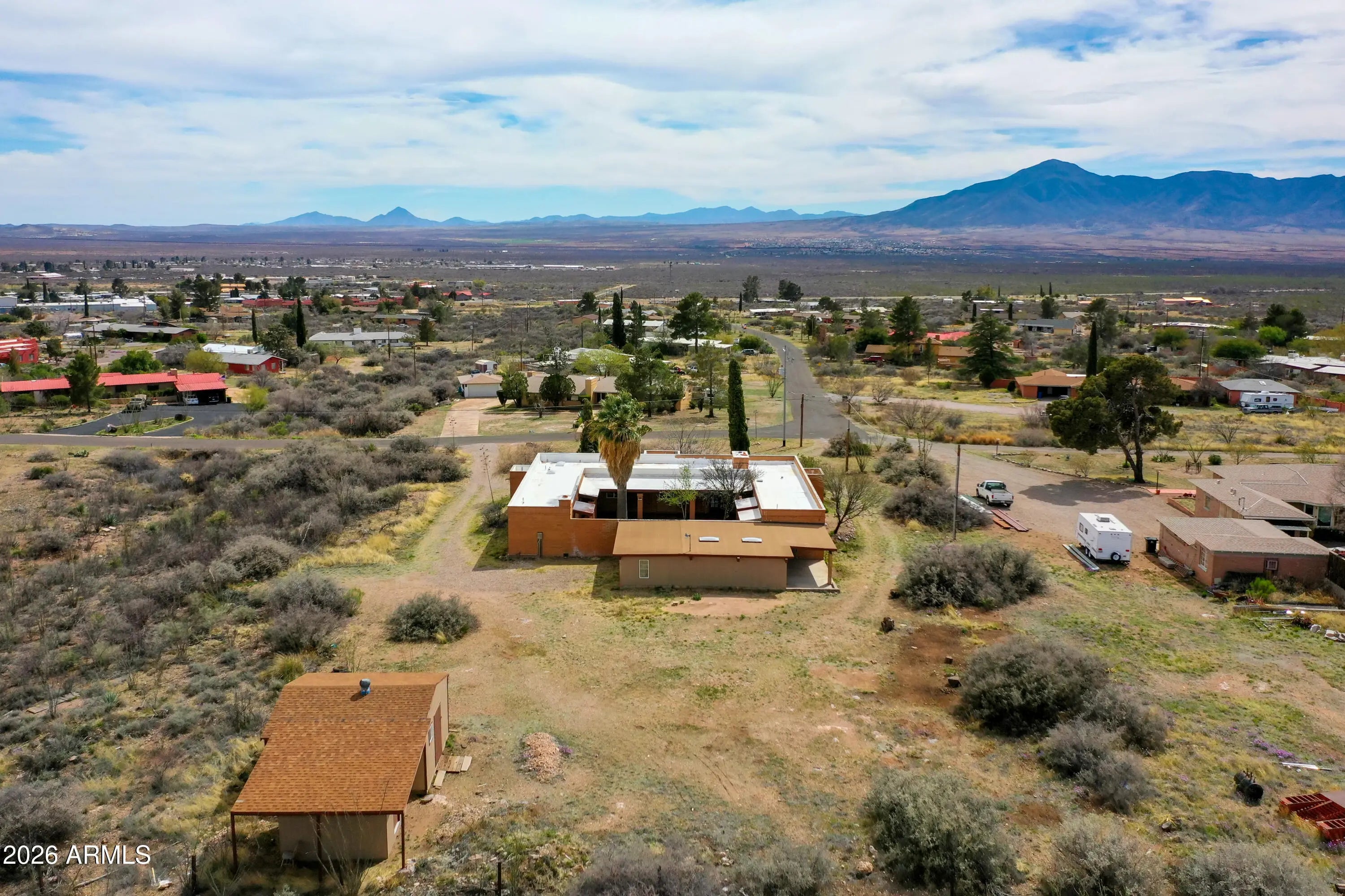 Southwest charm meets modern comfort in this beautifully updated 2,467 sq ft U-shaped home designed to embrace indoor-outdoor living and plenty of space outside to expand on over 1.64AC's. Featuring three private bedroom suites with their own baths, the layout is ideal for guests, multigenerational living, or a potential vacation rental. The home surrounds a peaceful courtyard with a sparkling pool and wraparound patio, creating a private desert oasis. Classic Saltillo tile flooring enhances the warm Southwestern character while sweeping mountain views add to the home's tranquil setting. The fully remodeled chef's kitchen boasts granite countertops, a large island, brand-new appliances, and abundant storage for effortless entertaining. (click more) The oversized MAIN primary suite is a true retreat with its own fireplace, dual sinks, spacious walk-in shower, and generous closet space. Recent upgrades include new HVAC's, new water heaters updated lighting, and modern plumbing fixtures, new pool equipment and more. The open great room with a double-sided fireplace offers a comfortable gathering space filled with natural light. Huge GARAGE/WORKSHOP area and a two car carport. Plenty of room to park you RV's Recreational Toys and trailers on the roomy 1.64 acre lot in desirable San Jose Estates. Also included are two very nice storage units. This exceptional property is just minutes from the charm, art, and culture of historic Old Bisbee. This home is UNIQUE in many wonderful ways! A MUST SEE!