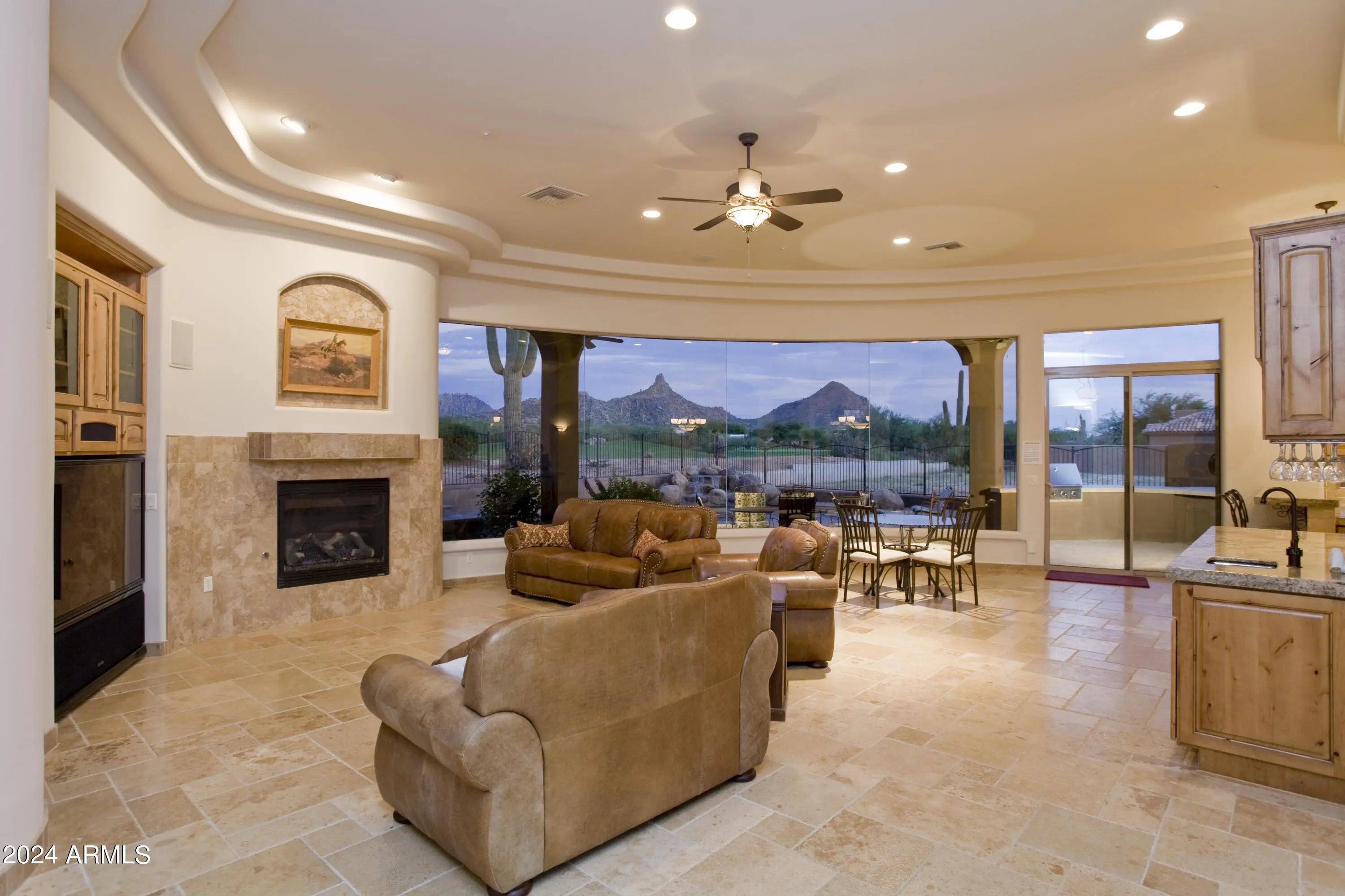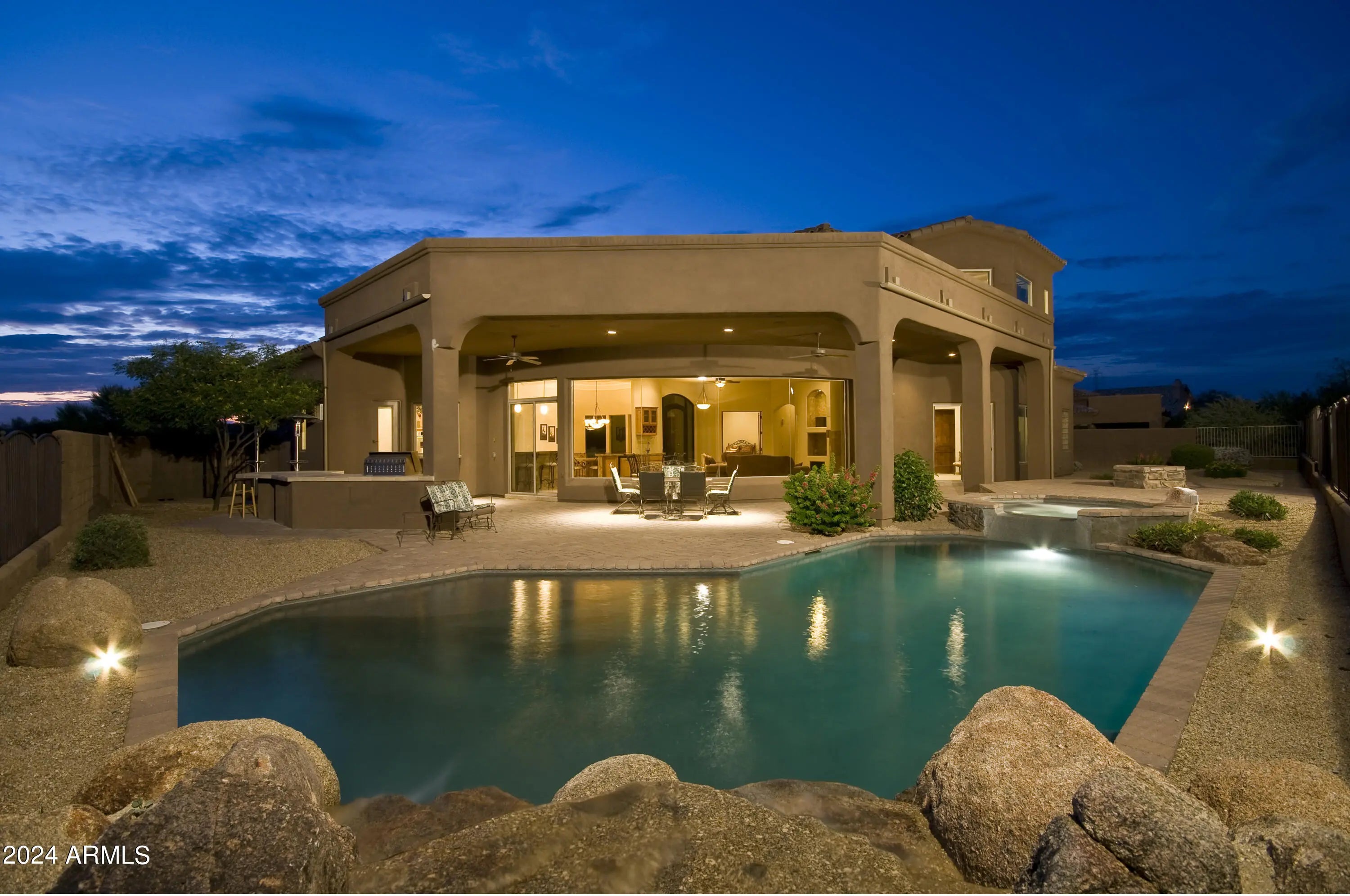 Fabulous custom luxury home located directly on the world-famous Troon North Golf Course. The very first step inside reveals a wall of glass in the great room--24 feet wide--grandly framing the golf course, famed Pinnacle Peak Mountain, the pool, spa, waterfall, wood-burning firepit and built-in gas BBQ. Appointments include travertine marble flooring, chiseled granite counter-tops, knotty alder doors and cabinetry, fully-equipped gourmet kitchen, dining room with travertine marble table, wet bar, fireplace, 5 large bedrooms, 4.5 baths, full laundry, and 3-car garage. Located in the hot-bed of golf, shopping and exclusive dining in prestigious North Scottsdale, nearby amenities are too numerous to mention. Fully furnished. Rent varies by season; see lister for details.