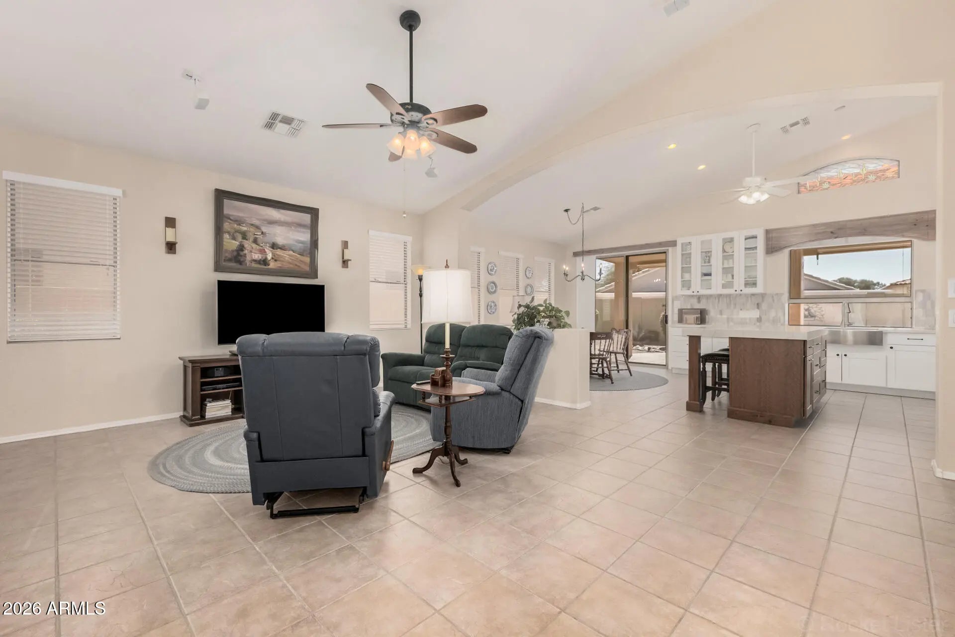 Dreaming of a beautifully remodeled kitchen? Your dream just became reality. This stunning La Posada model showcases a designer kitchen renovation featuring quartz countertops, shaker cabinetry, premium stainless steel appliances, a striking backsplash, farmhouse sink, and bar seating--an ideal space for cooking, entertaining, and everyday living. Located in the guard-gated Arizona Traditions community, this move-in ready home offers 2 bedrooms plus a den, tile flooring throughout, and an open & inviting great room with vaulted ceilings. The primary suite features dual vanities, while additional highlights include a newer air conditioner, water softener, ceiling fans, 2'' blinds, sun screens, upgraded laundry room, garage cabinets, security door and an extended covered patio-- perfect for morning coffee or enjoying beautiful Arizona evenings. Just steps away is North park, a wonderful spot for morning walks with your pets or a shaded picnic. Arizona Traditions offers a true resort-style lifestyle with swimming pools, heated spas, golf, a sports bar, community centers, ballroom, library, fitness centers, softball, pickleball, tennis, bocce, billiards, horseshoes, walking paths, and a wide variety of clubs, activities, and social groups. Whether you enjoy fitness programs, sports, crafts, cards, or simply meeting neighbors, there is something here for everyone. Conveniently located just off Loop 303 with easy access to shopping, dining, and everything the Valley has to offer.