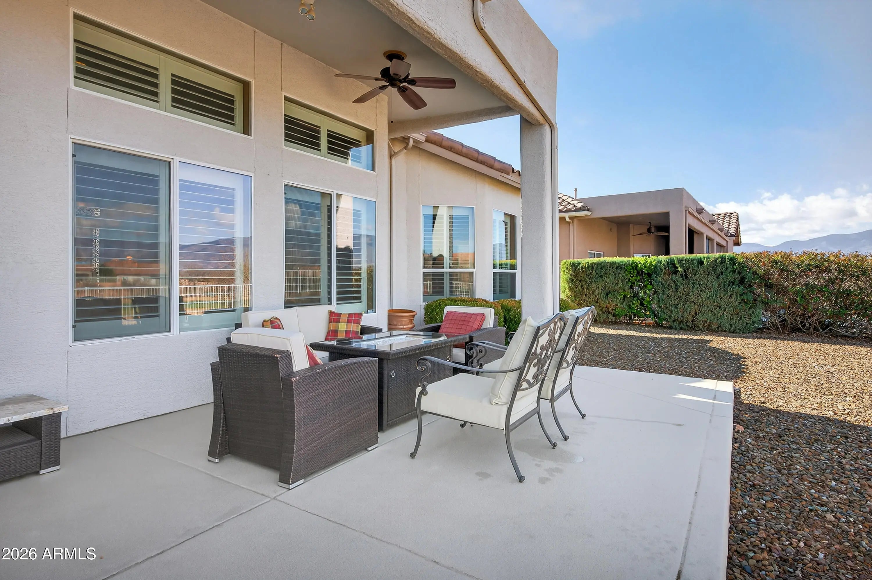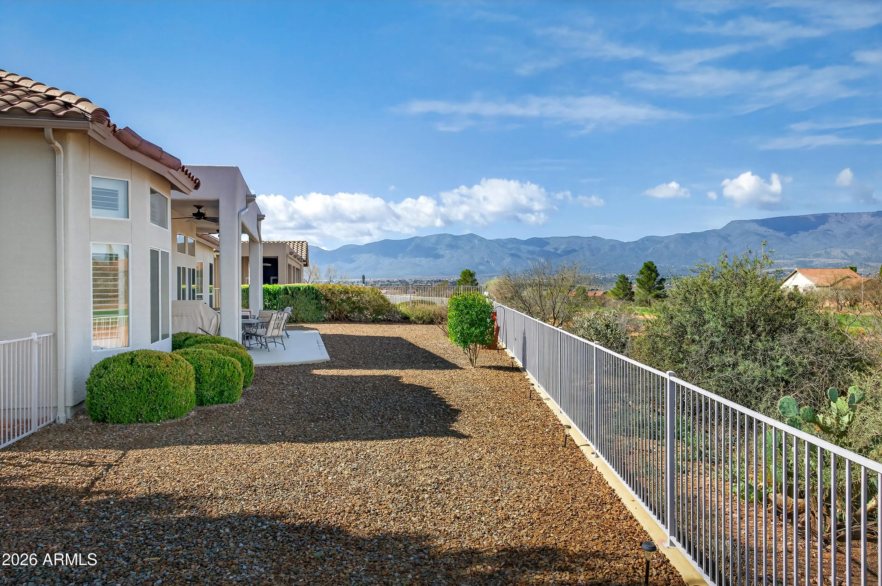 Welcome to The Agave Jewel. Located in La Privada at Verde Santa Fe, a Gated Golf Course Community of fine homes. Sitting right on the Agave Highlands Golf Course with big views of the Mingus Mountains, starry night's, city lights & twinkling Jerome. Big splash of color in the sunrises & sunsets. From day to night, this is the place to be awe inspired. Lots of natural light in every room with 12' ceilings. Tall windows with custom wood shutters bring the outside in. Open floorplan & split bedrooms. Cooking is fun in the chef's kitchen with an island, engineered stone counter tops & light cabinets. The main suite is a private sanctuary running the entire length of the house. Soaking tub & rain shower plus double sinks, 2 walk-in closets & linen closet. Lovingly cared for. Recently painted with new screens & irrigation system. Beautiful, mature landscaping includes flowering plants. EZ to care for & low maintenance. Do you want to take a road trip? This property will be just fine while you are out of town. Clubhouse member offering a pool, spa, library, fitness center, billiards, indoor & indoor outdoor dining, full kitchen to enjoy & a gas grille by the big outdoor patio. Join your neighbors for the fun activities, card games, yoga, Zumba & water aerobics. Interesting classes too, all about AZ. Live the active life style and walk the neighborhoods and trails surrounding this fantastic community. Sedona just 12 miles away. See you at the pool!