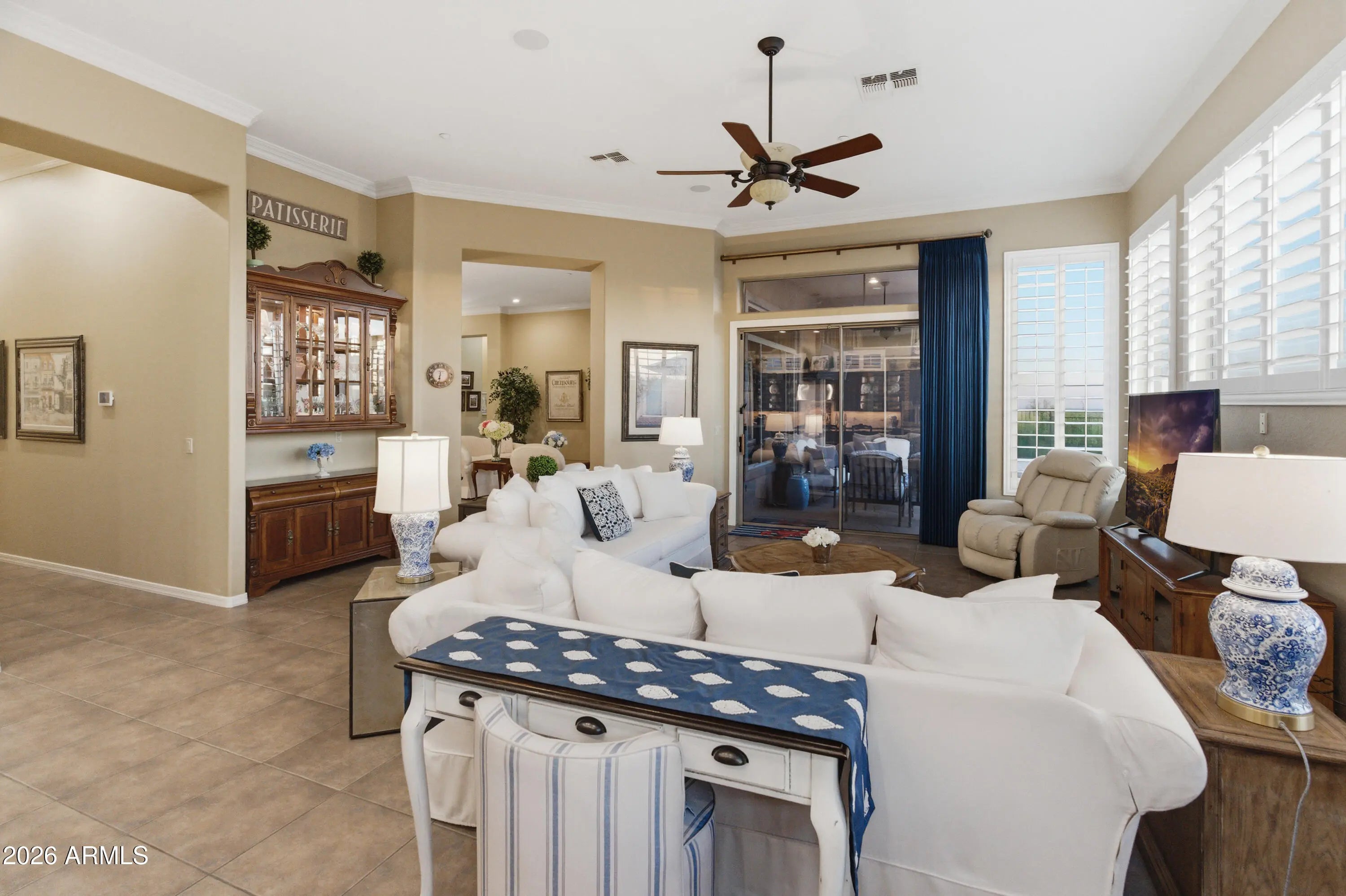 Location, Location, Location! This gorgeous home offers breathtaking sunrise and sunset views along with mountain and city-light views. Ideally positioned for privacy, the home enjoys a rare setting with no homes in front, behind, or on one side, creating a peaceful retreat. Major updates include a roof replacement in 2024, HVAC systems replaced in 2022 and 2024, and an owned solar system. Inside, the thoughtfully designed floor plan features three spacious bedrooms with private en-suite bathrooms, plus a powder bath, formal living and dining areas, a welcoming great room, and a dedicated office with floor-to-ceiling bookcases. The updated kitchen with new appliances features granite countertops, double ovens, stainless steel appliances, and a beverage center. The primary suite offers a cozy sitting area with a private exit to the covered patio, while the luxuriously updated bath includes a coffee bar, double sinks, soaking tub, and walk-in shower. Step outside to enjoy the resort-style backyard with a pool, water feature, fireplace, and ramada while taking in the spectacular views. Additional upgrades include crown molding, custom window treatments, shutters, electric shade on the back patio, a 17-SEER mini-split with added insulation in the 3-car garage, soothing water feature at the front courtyard, R/O, soft water, Central Vacuum, a laundry room sink with an additional beverage fridge are just a few of the updates to this home.